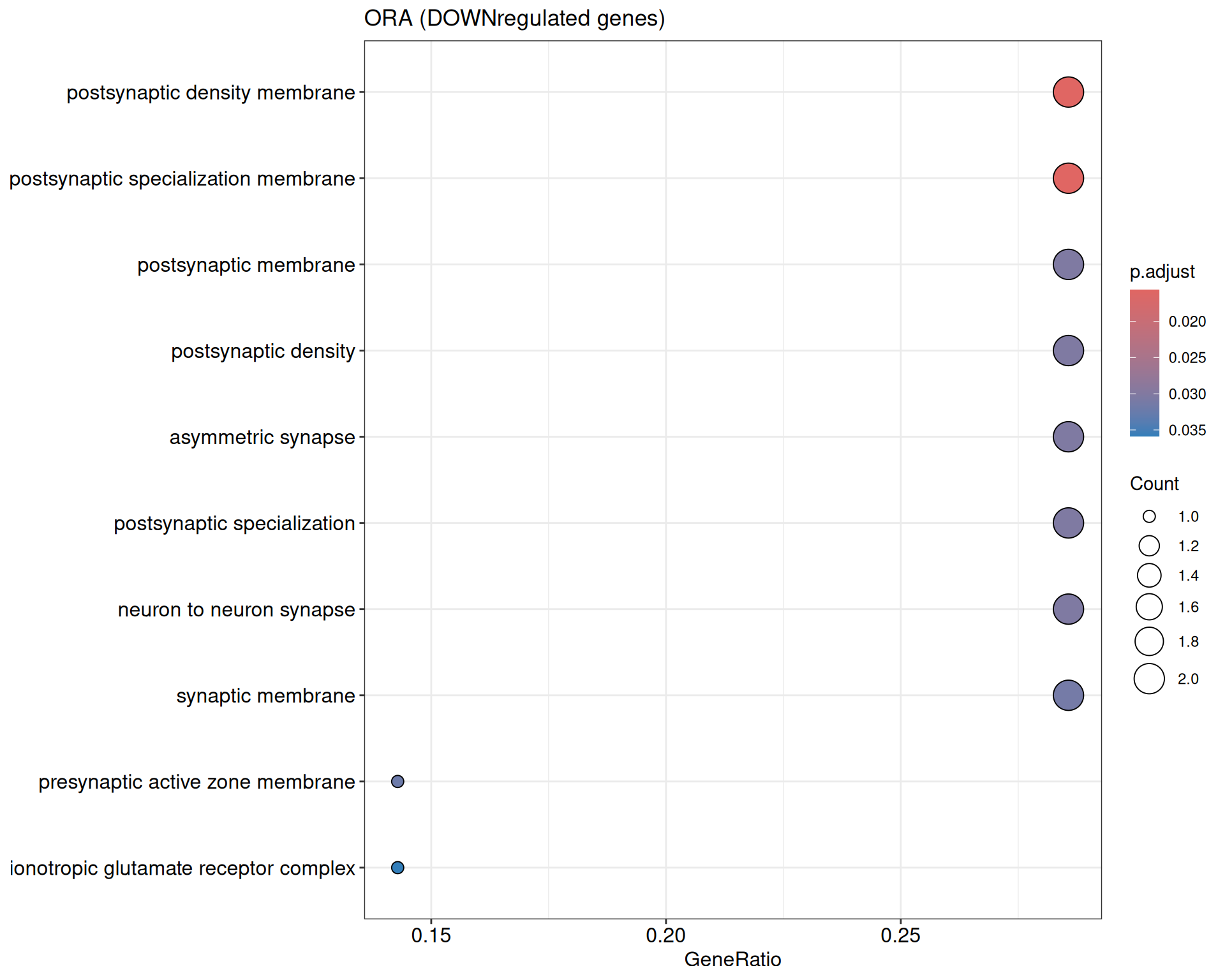 We performed a functional enrichment analysis based on Over-Representation Analysis (ORA) using the GO pathway database. Unlike GSEA, which considers the entire ranked list of genes, ORA focuses only on genes that meet specific differential expression thresholds (adjusted p-value and log2 fold change). The analysis was conducted separately for upregulated and downregulated genes to identify GO pathways that are significantly enriched in each group, compared to what would be expected by chance. This allows for a clearer biological interpretation of distinct transcriptional programs activated or suppressed in the dataset. The dot plots below display all significantly enriched GO pathways. Each dot’s size represents the number of differentially expressed genes associated with the pathway, while the color reflects the statistical significance of the enrichment (adjusted p-value).