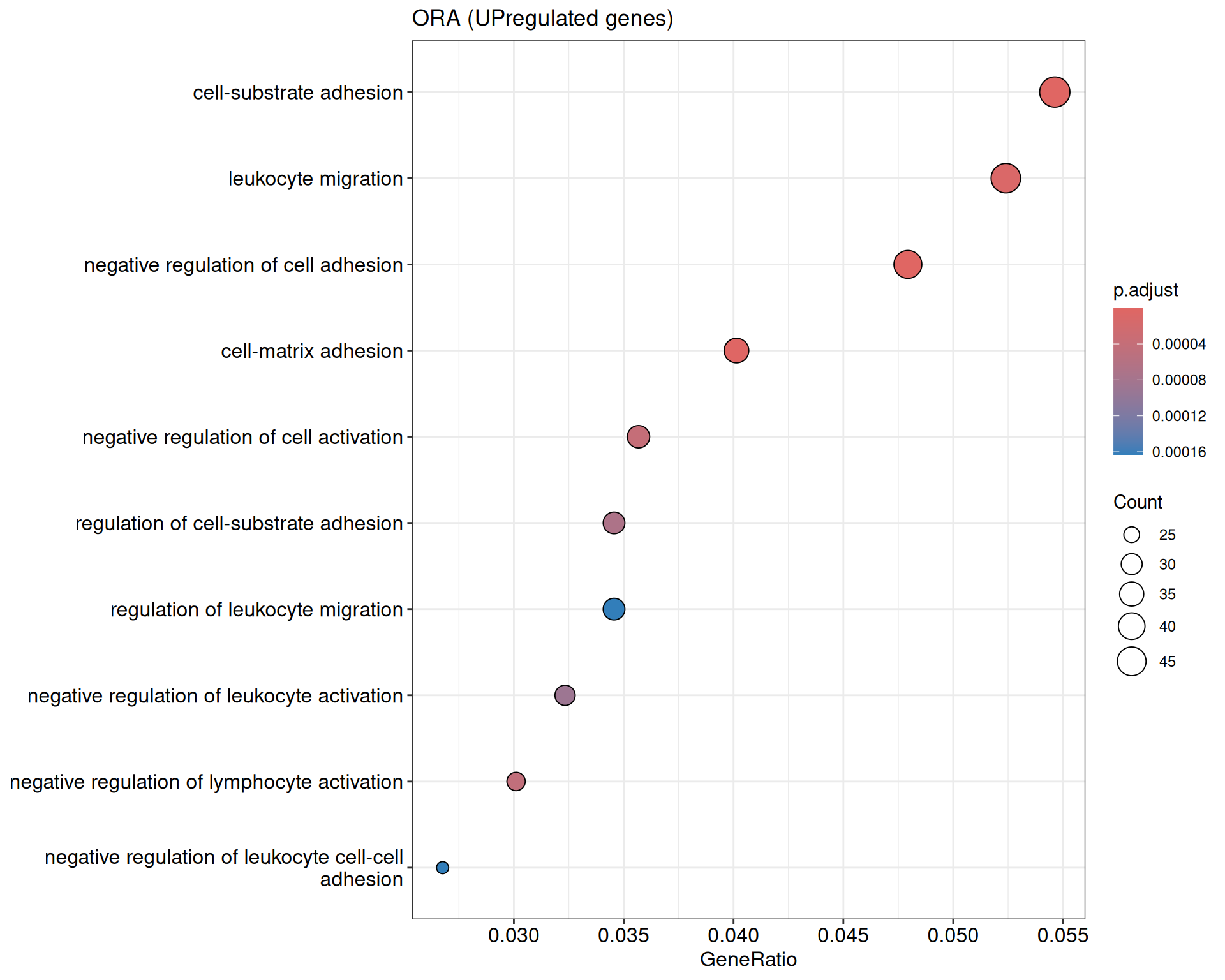 We performed a functional enrichment analysis based on Over-Representation Analysis (ORA) using the GO pathway database. Unlike GSEA, which considers the entire ranked list of genes, ORA focuses only on genes that meet specific differential expression thresholds (adjusted p-value and log2 fold change). The analysis was conducted separately for upregulated and downregulated genes to identify GO pathways that are significantly enriched in each group, compared to what would be expected by chance. This allows for a clearer biological interpretation of distinct transcriptional programs activated or suppressed in the dataset. The dot plots below display all significantly enriched GO pathways. Each dot’s size represents the number of differentially expressed genes associated with the pathway, while the color reflects the statistical significance of the enrichment (adjusted p-value).