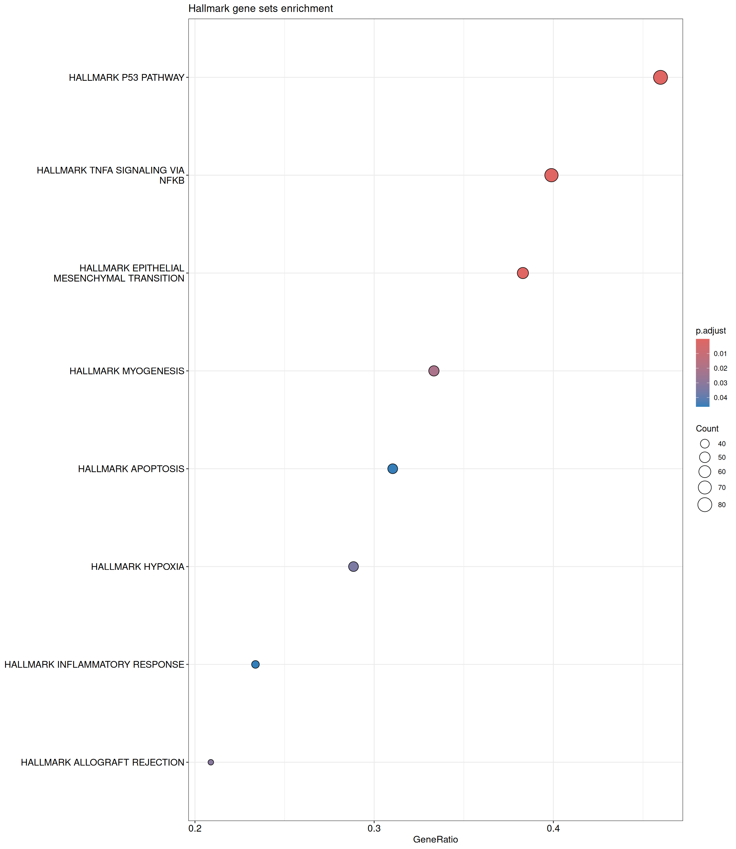 GSEA is performed using the Hallmark gene sets, which represent well-defined biological states and processes. The dot plot below displays all enriched Hallmark pathways. The size of each dot corresponds to the number of differentially expressed genes contributing to each pathway. Additionally, the color of each dot indicates the significance of the pathway’s enrichment, emphasizing its relative importance.