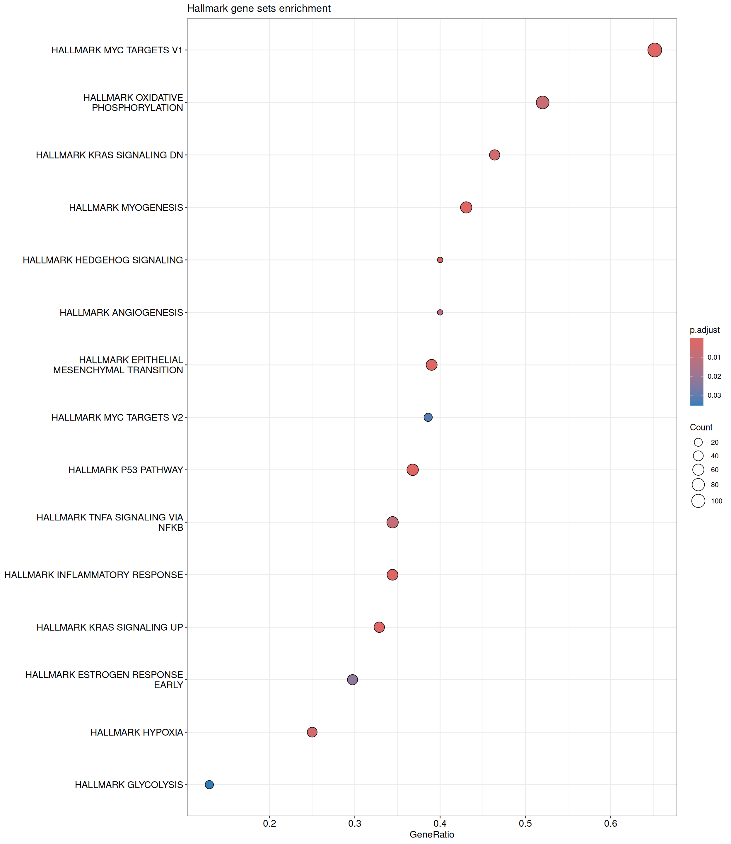 GSEA is performed using the Hallmark gene sets, which represent well-defined biological states and processes. The dot plot below displays all enriched Hallmark pathways. The size of each dot corresponds to the number of differentially expressed genes contributing to each pathway. Additionally, the color of each dot indicates the significance of the pathway’s enrichment, emphasizing its relative importance.