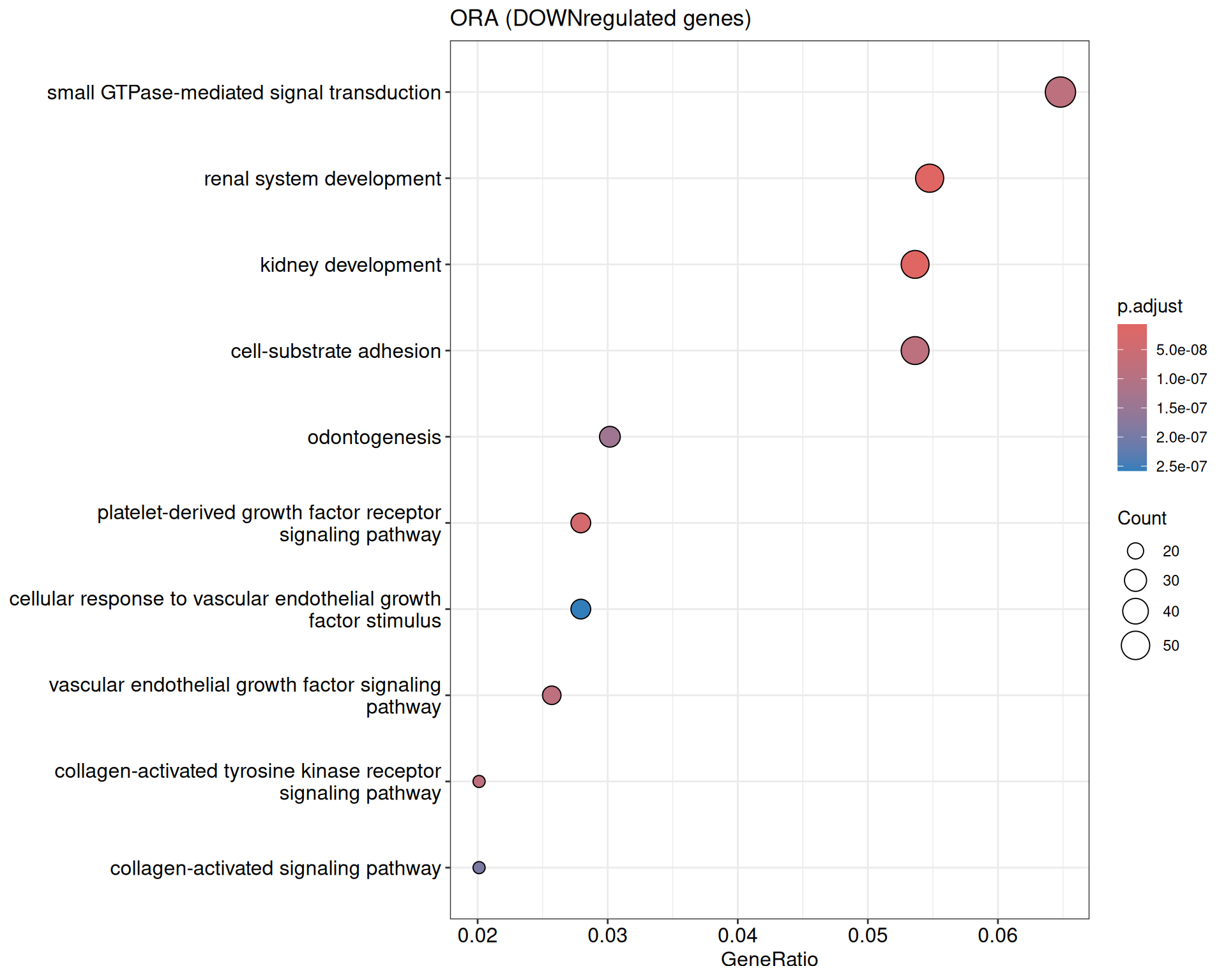 We performed a functional enrichment analysis based on Over-Representation Analysis (ORA) using the GO pathway database. Unlike GSEA, which considers the entire ranked list of genes, ORA focuses only on genes that meet specific differential expression thresholds (adjusted p-value and log2 fold change). The analysis was conducted separately for upregulated and downregulated genes to identify GO pathways that are significantly enriched in each group, compared to what would be expected by chance. This allows for a clearer biological interpretation of distinct transcriptional programs activated or suppressed in the dataset. The dot plots below display all significantly enriched GO pathways. Each dot’s size represents the number of differentially expressed genes associated with the pathway, while the color reflects the statistical significance of the enrichment (adjusted p-value).