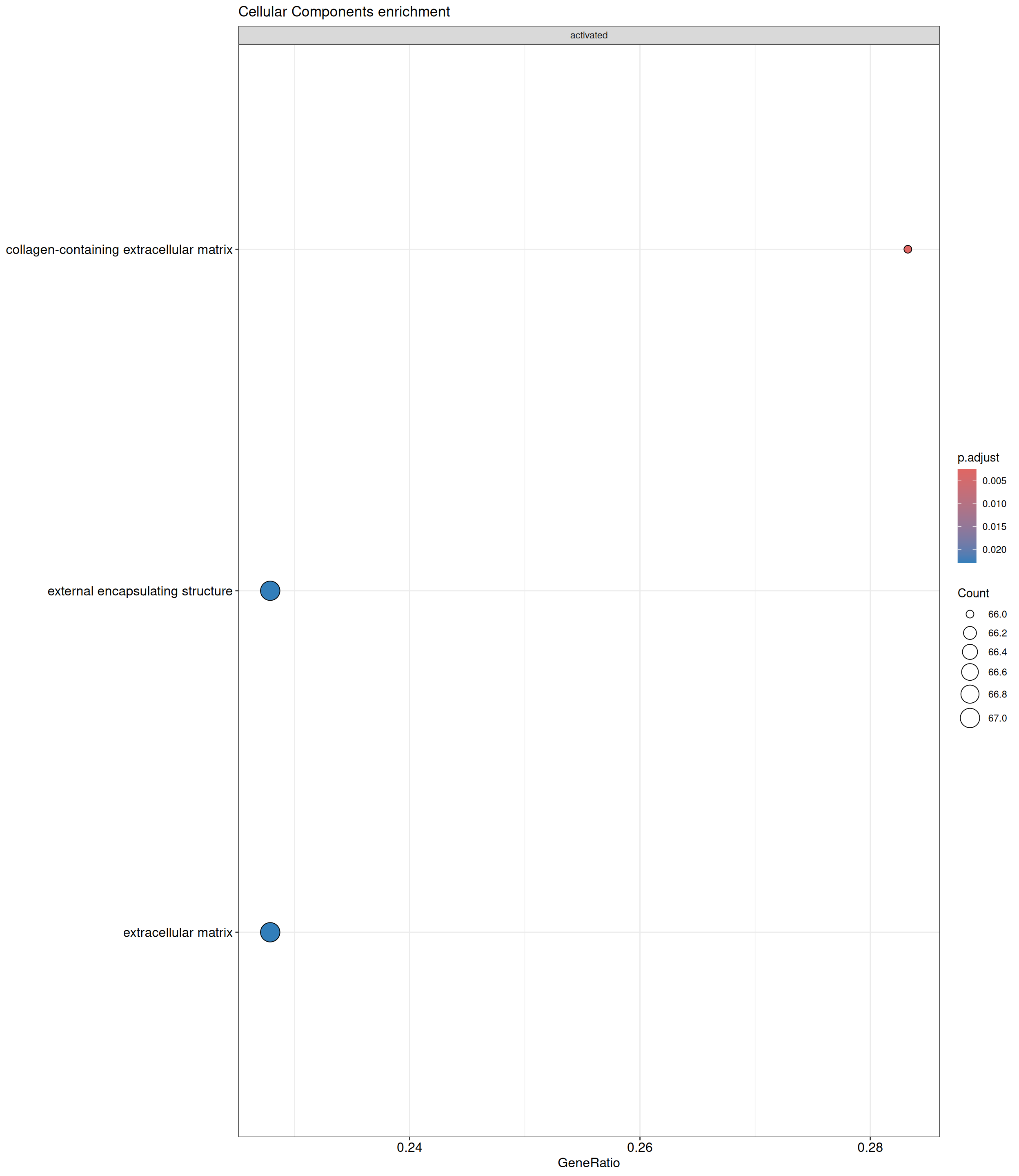 GSEA is performed separately on each subontology: biological processes (BP), cellular components (CC) and molecular functions (MF). The dot plot below shows all the enriched GO terms. The size of each dot correlates with the count of differentially expressed genes associated with each GO term. Furthermore, the color of each dot reflects the significance of the enrichment of the respective GO term, highlighting its relative importance.