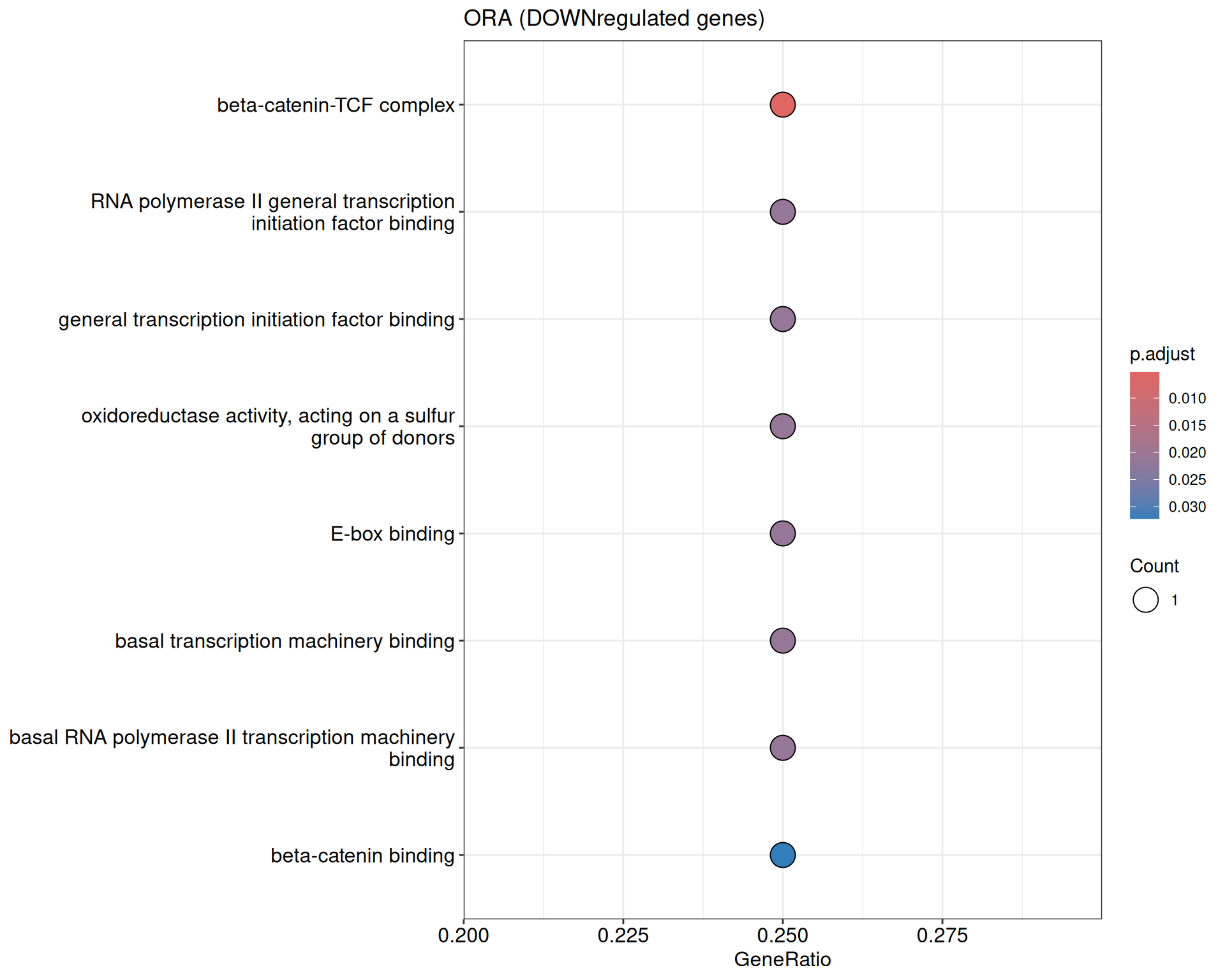 We performed a functional enrichment analysis based on Over-Representation Analysis (ORA) using the GO pathway database. Unlike GSEA, which considers the entire ranked list of genes, ORA focuses only on genes that meet specific differential expression thresholds (adjusted p-value and log2 fold change). The analysis was conducted separately for upregulated and downregulated genes to identify GO pathways that are significantly enriched in each group, compared to what would be expected by chance. This allows for a clearer biological interpretation of distinct transcriptional programs activated or suppressed in the dataset. The dot plots below display all significantly enriched GO pathways. Each dot’s size represents the number of differentially expressed genes associated with the pathway, while the color reflects the statistical significance of the enrichment (adjusted p-value).