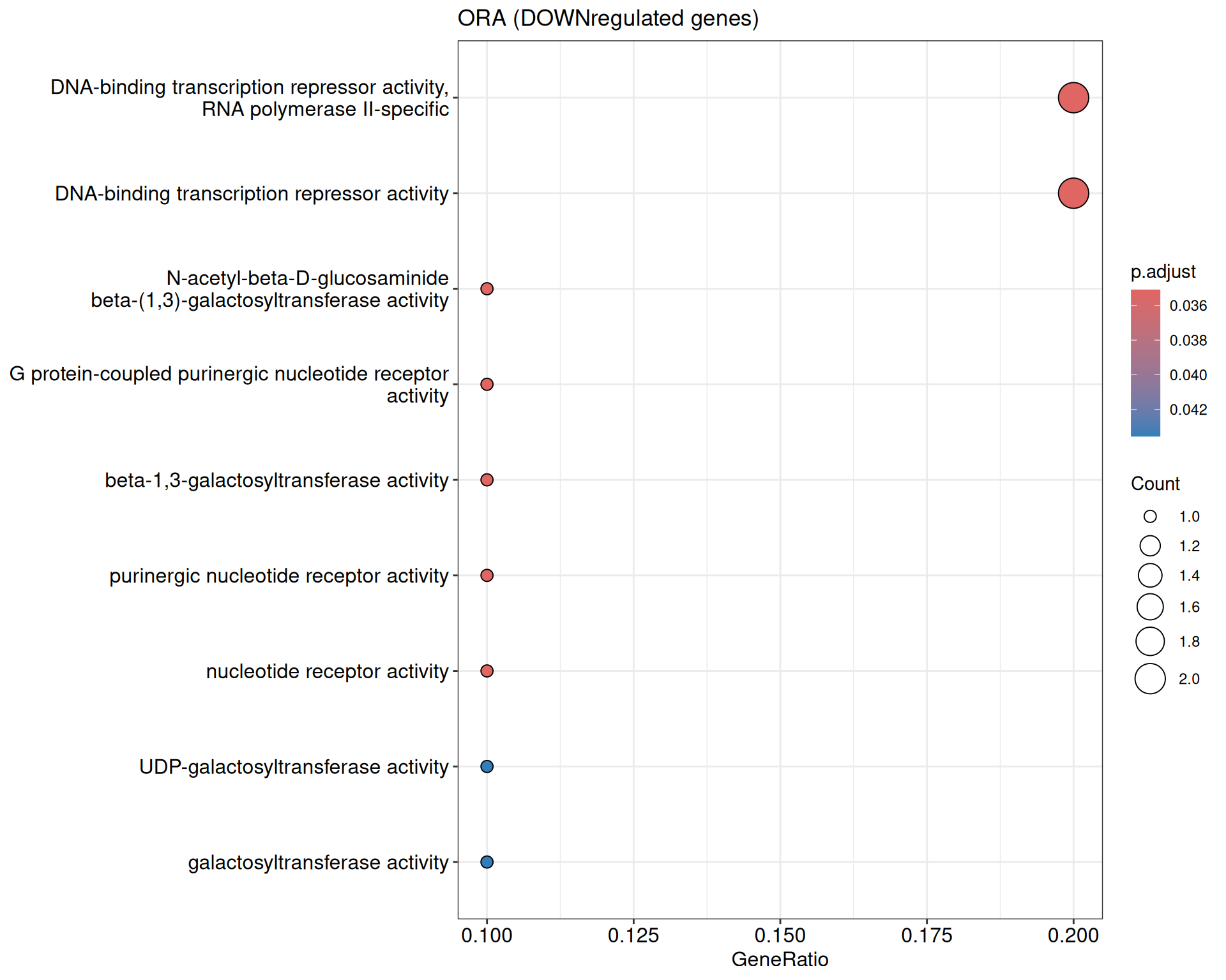 We performed a functional enrichment analysis based on Over-Representation Analysis (ORA) using the GO pathway database. Unlike GSEA, which considers the entire ranked list of genes, ORA focuses only on genes that meet specific differential expression thresholds (adjusted p-value and log2 fold change). The analysis was conducted separately for upregulated and downregulated genes to identify GO pathways that are significantly enriched in each group, compared to what would be expected by chance. This allows for a clearer biological interpretation of distinct transcriptional programs activated or suppressed in the dataset. The dot plots below display all significantly enriched GO pathways. Each dot’s size represents the number of differentially expressed genes associated with the pathway, while the color reflects the statistical significance of the enrichment (adjusted p-value).