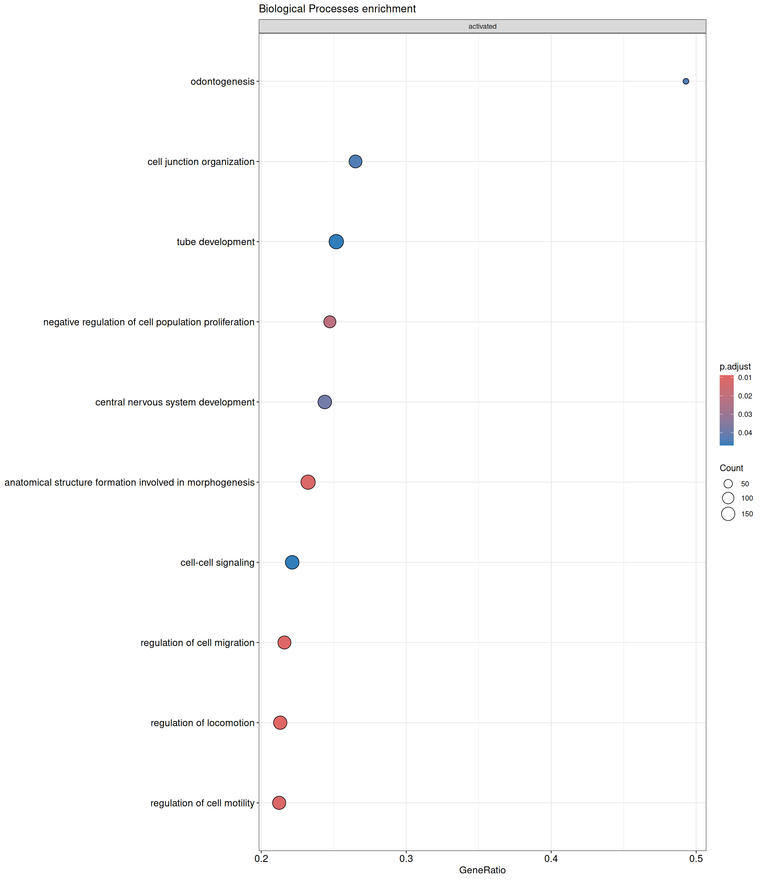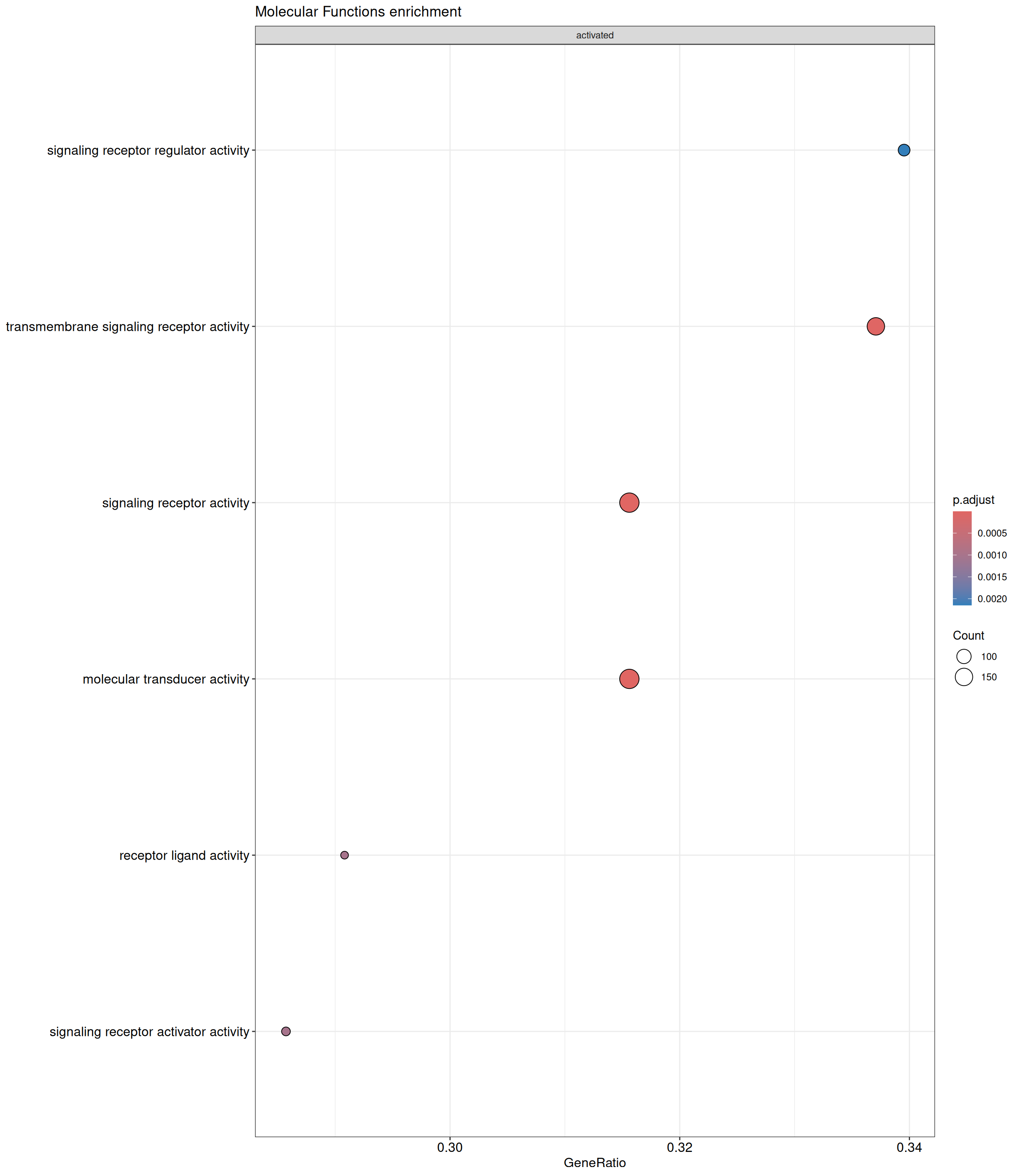 GSEA is performed separately on each subontology: biological processes (BP), cellular components (CC) and molecular functions (MF). The dot plot below shows all the enriched GO terms. The size of each dot correlates with the count of differentially expressed genes associated with each GO term. Furthermore, the color of each dot reflects the significance of the enrichment of the respective GO term, highlighting its relative importance.