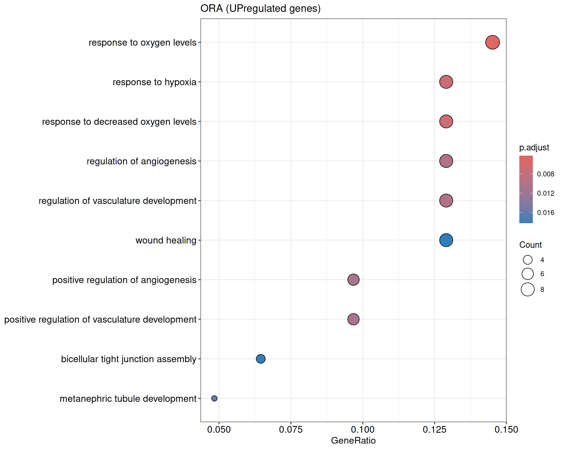 We performed a functional enrichment analysis based on Over-Representation Analysis (ORA) using the GO pathway database. Unlike GSEA, which considers the entire ranked list of genes, ORA focuses only on genes that meet specific differential expression thresholds (adjusted p-value and log2 fold change). The analysis was conducted separately for upregulated and downregulated genes to identify GO pathways that are significantly enriched in each group, compared to what would be expected by chance. This allows for a clearer biological interpretation of distinct transcriptional programs activated or suppressed in the dataset. The dot plots below display all significantly enriched GO pathways. Each dot’s size represents the number of differentially expressed genes associated with the pathway, while the color reflects the statistical significance of the enrichment (adjusted p-value).