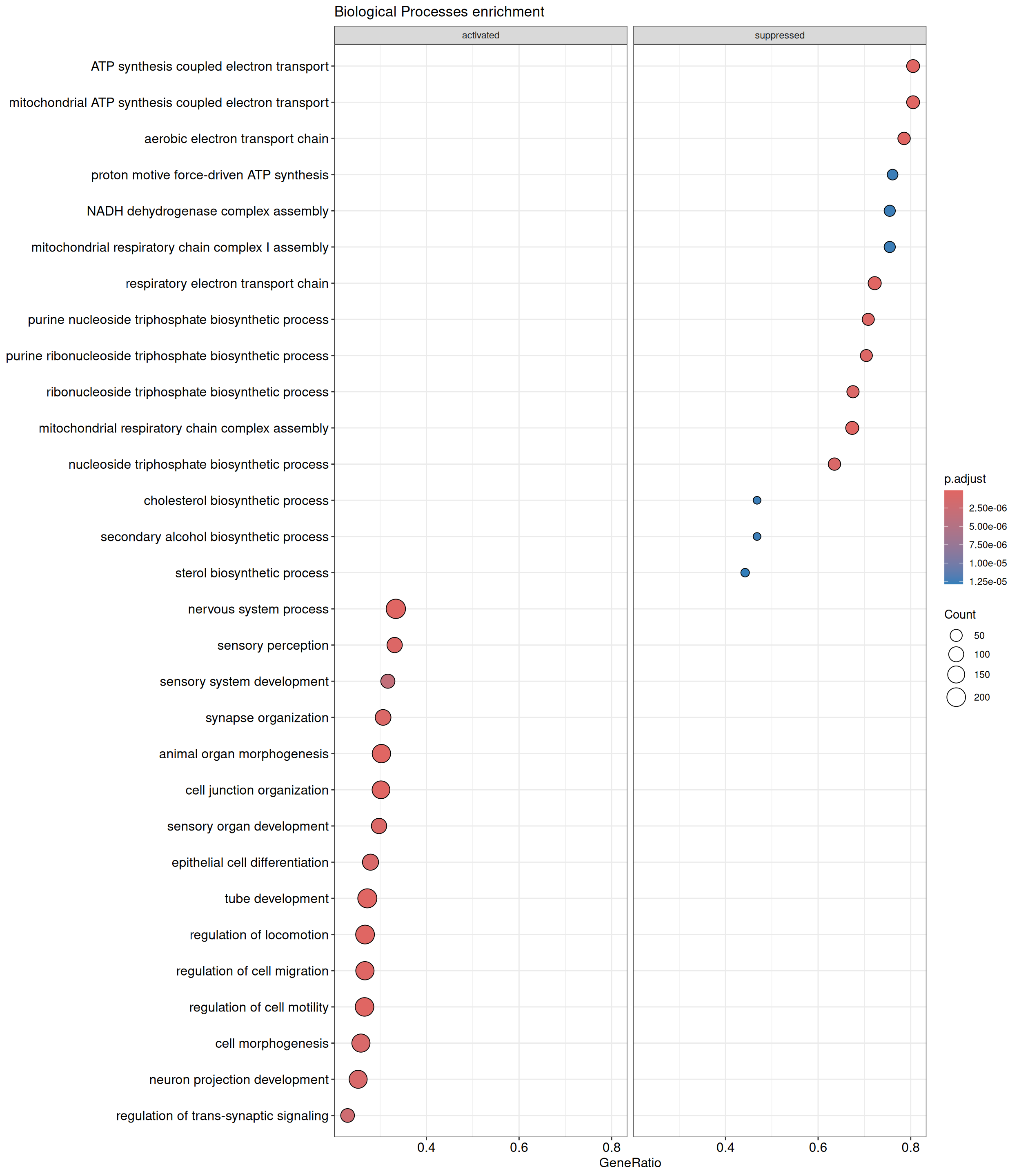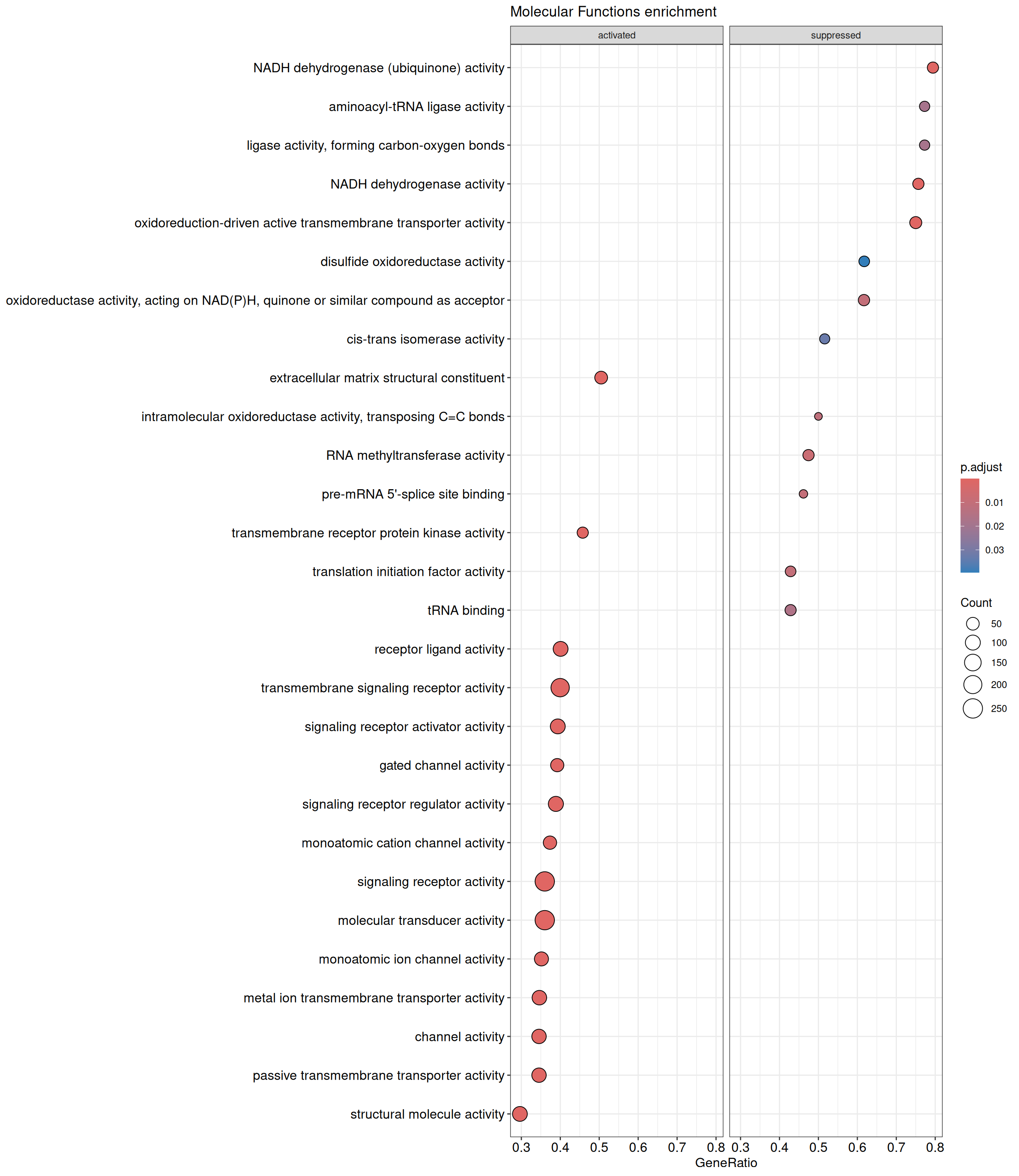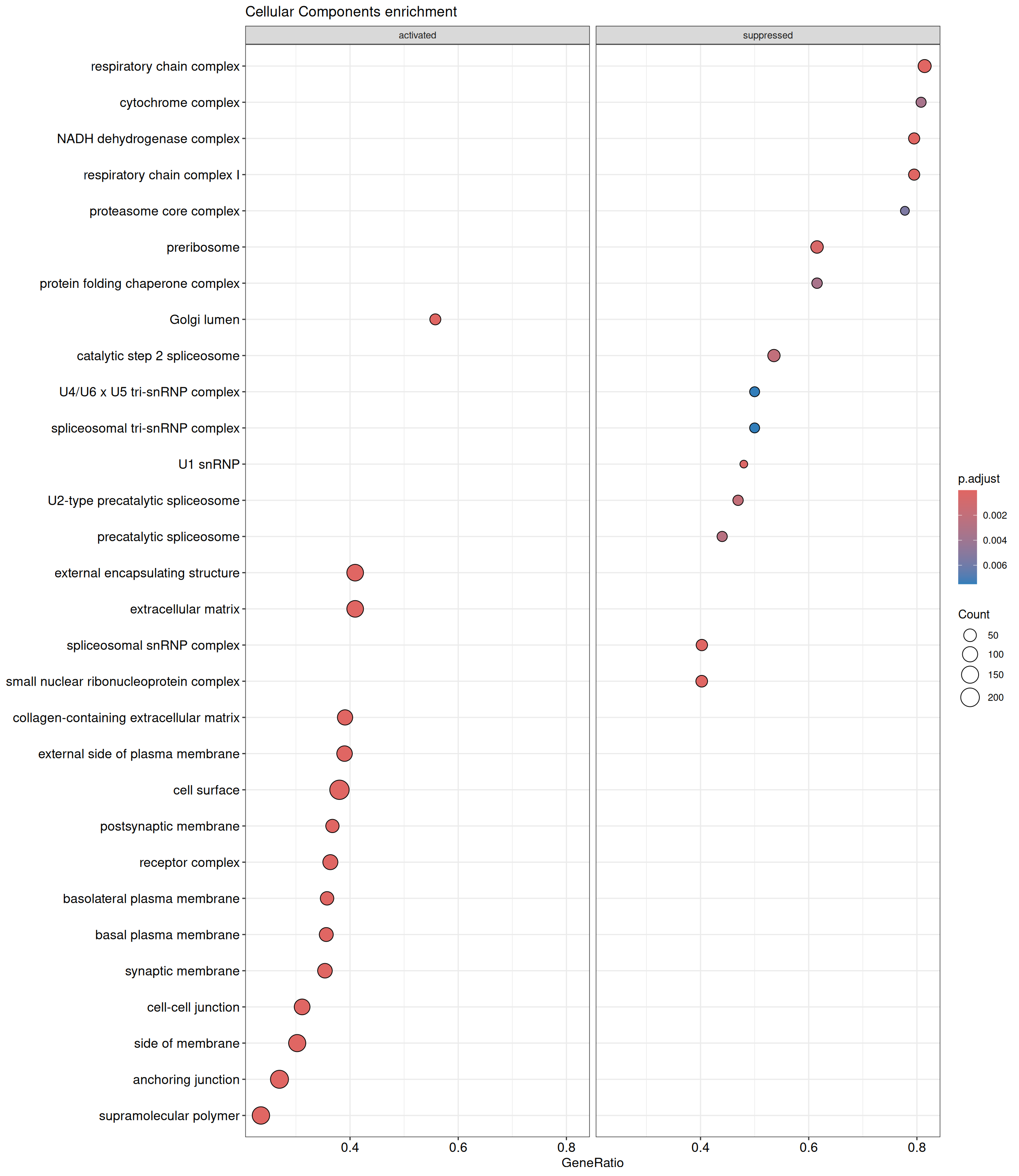 GSEA is performed separately on each subontology: biological processes (BP), cellular components (CC) and molecular functions (MF). The dot plot below shows all the enriched GO terms. The size of each dot correlates with the count of differentially expressed genes associated with each GO term. Furthermore, the color of each dot reflects the significance of the enrichment of the respective GO term, highlighting its relative importance.