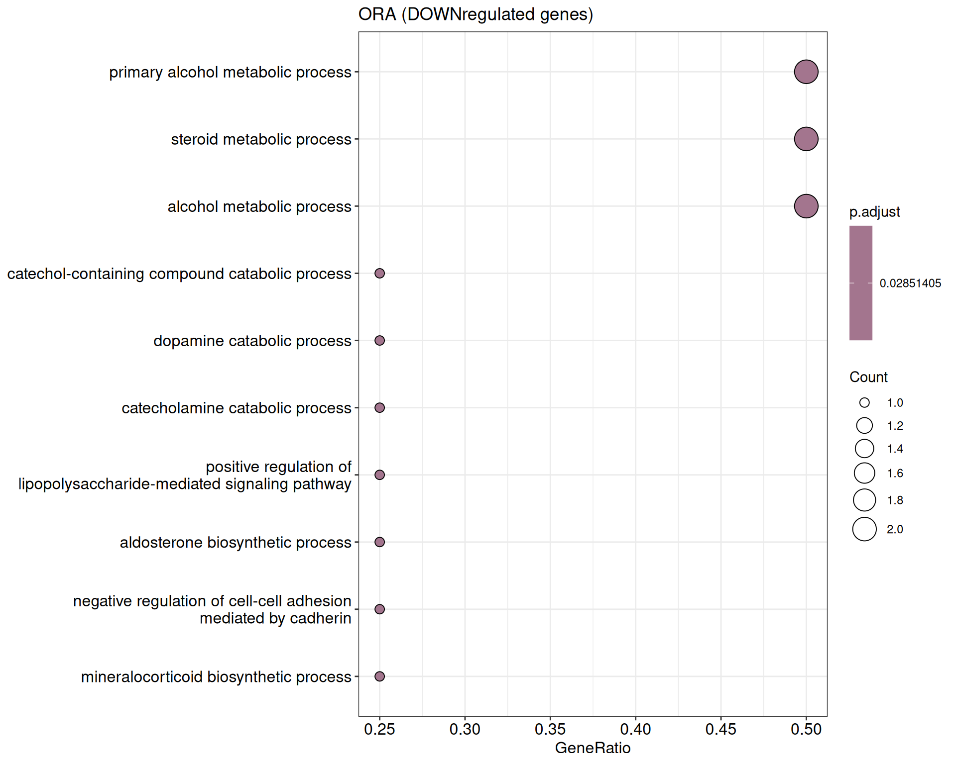 We performed a functional enrichment analysis based on Over-Representation Analysis (ORA) using the GO pathway database. Unlike GSEA, which considers the entire ranked list of genes, ORA focuses only on genes that meet specific differential expression thresholds (adjusted p-value and log2 fold change). The analysis was conducted separately for upregulated and downregulated genes to identify GO pathways that are significantly enriched in each group, compared to what would be expected by chance. This allows for a clearer biological interpretation of distinct transcriptional programs activated or suppressed in the dataset. The dot plots below display all significantly enriched GO pathways. Each dot’s size represents the number of differentially expressed genes associated with the pathway, while the color reflects the statistical significance of the enrichment (adjusted p-value).
