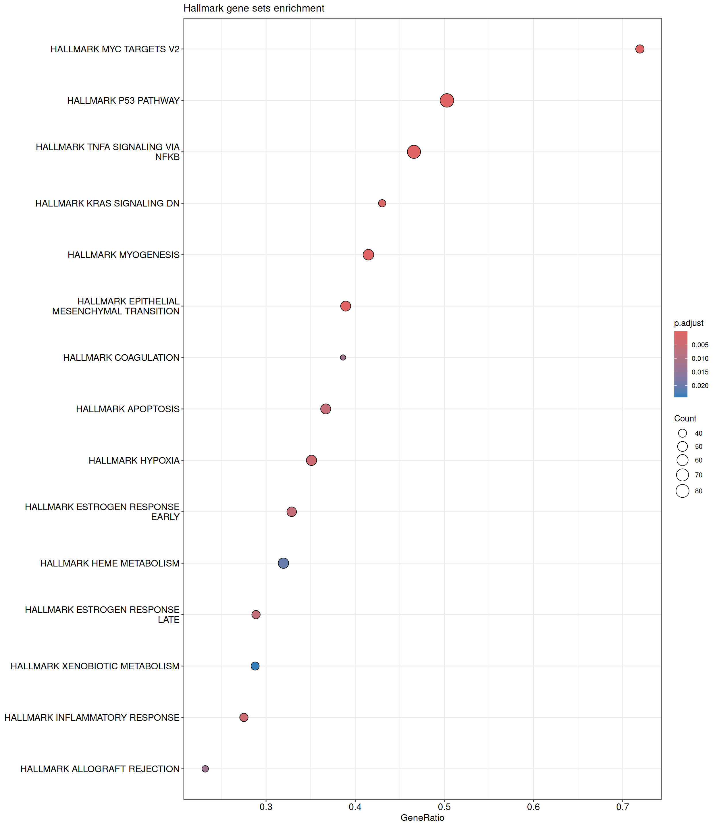 GSEA is performed using the Hallmark gene sets, which represent well-defined biological states and processes. The dot plot below displays all enriched Hallmark pathways. The size of each dot corresponds to the number of differentially expressed genes contributing to each pathway. Additionally, the color of each dot indicates the significance of the pathway’s enrichment, emphasizing its relative importance.
