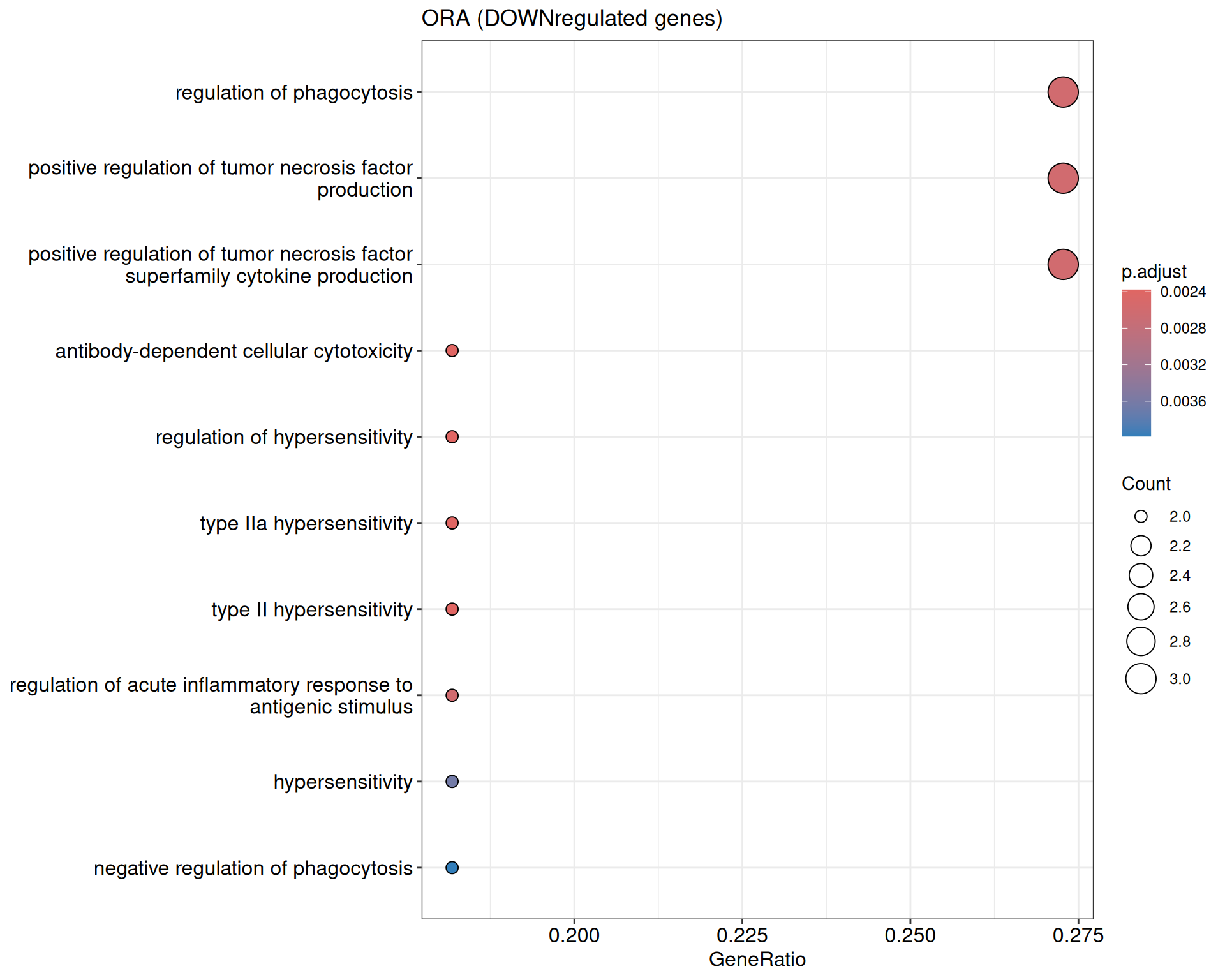 We performed a functional enrichment analysis based on Over-Representation Analysis (ORA) using the GO pathway database. Unlike GSEA, which considers the entire ranked list of genes, ORA focuses only on genes that meet specific differential expression thresholds (adjusted p-value and log2 fold change). The analysis was conducted separately for upregulated and downregulated genes to identify GO pathways that are significantly enriched in each group, compared to what would be expected by chance. This allows for a clearer biological interpretation of distinct transcriptional programs activated or suppressed in the dataset. The dot plots below display all significantly enriched GO pathways. Each dot’s size represents the number of differentially expressed genes associated with the pathway, while the color reflects the statistical significance of the enrichment (adjusted p-value).
