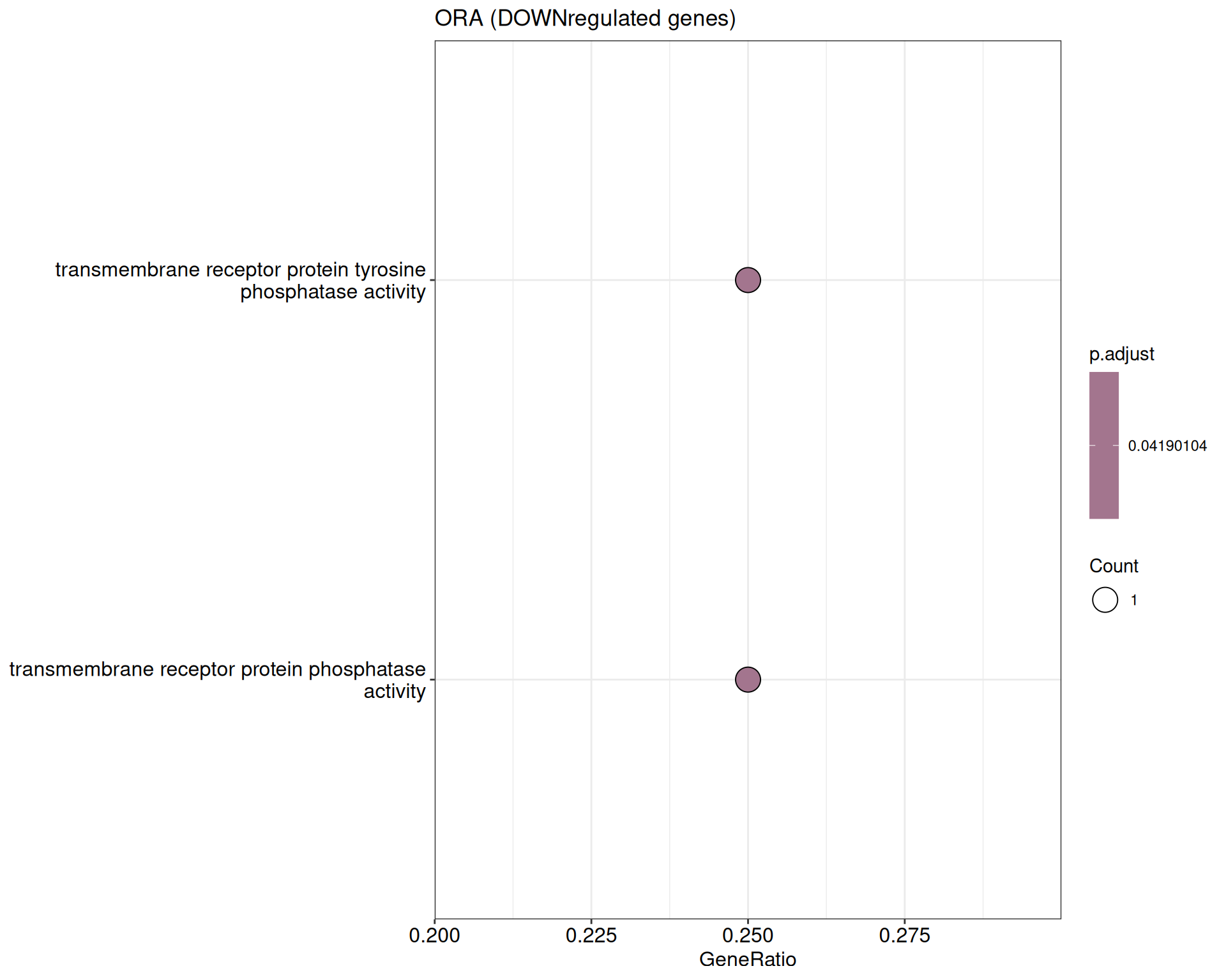 We performed a functional enrichment analysis based on Over-Representation Analysis (ORA) using the GO pathway database. Unlike GSEA, which considers the entire ranked list of genes, ORA focuses only on genes that meet specific differential expression thresholds (adjusted p-value and log2 fold change). The analysis was conducted separately for upregulated and downregulated genes to identify GO pathways that are significantly enriched in each group, compared to what would be expected by chance. This allows for a clearer biological interpretation of distinct transcriptional programs activated or suppressed in the dataset. The dot plots below display all significantly enriched GO pathways. Each dot’s size represents the number of differentially expressed genes associated with the pathway, while the color reflects the statistical significance of the enrichment (adjusted p-value).