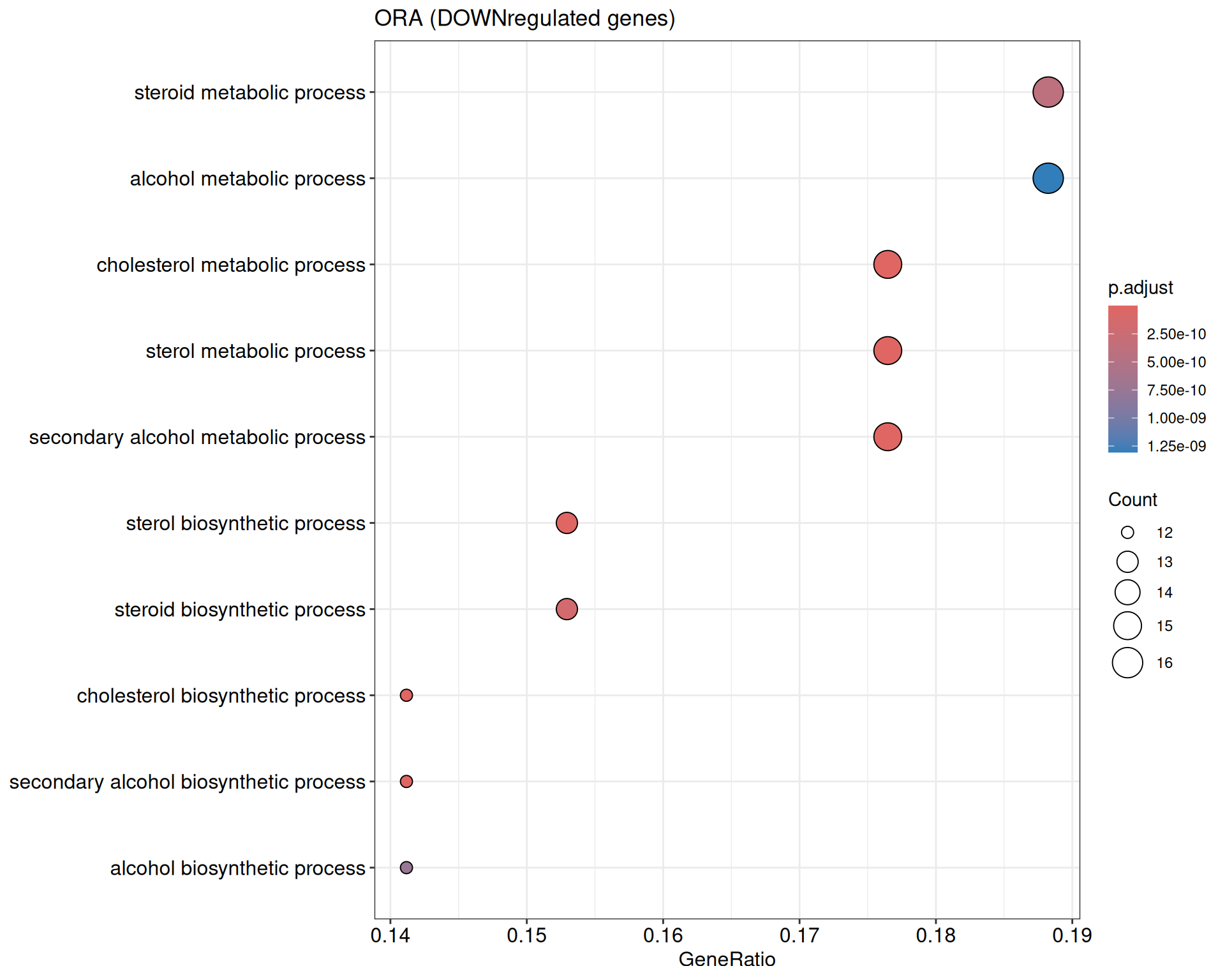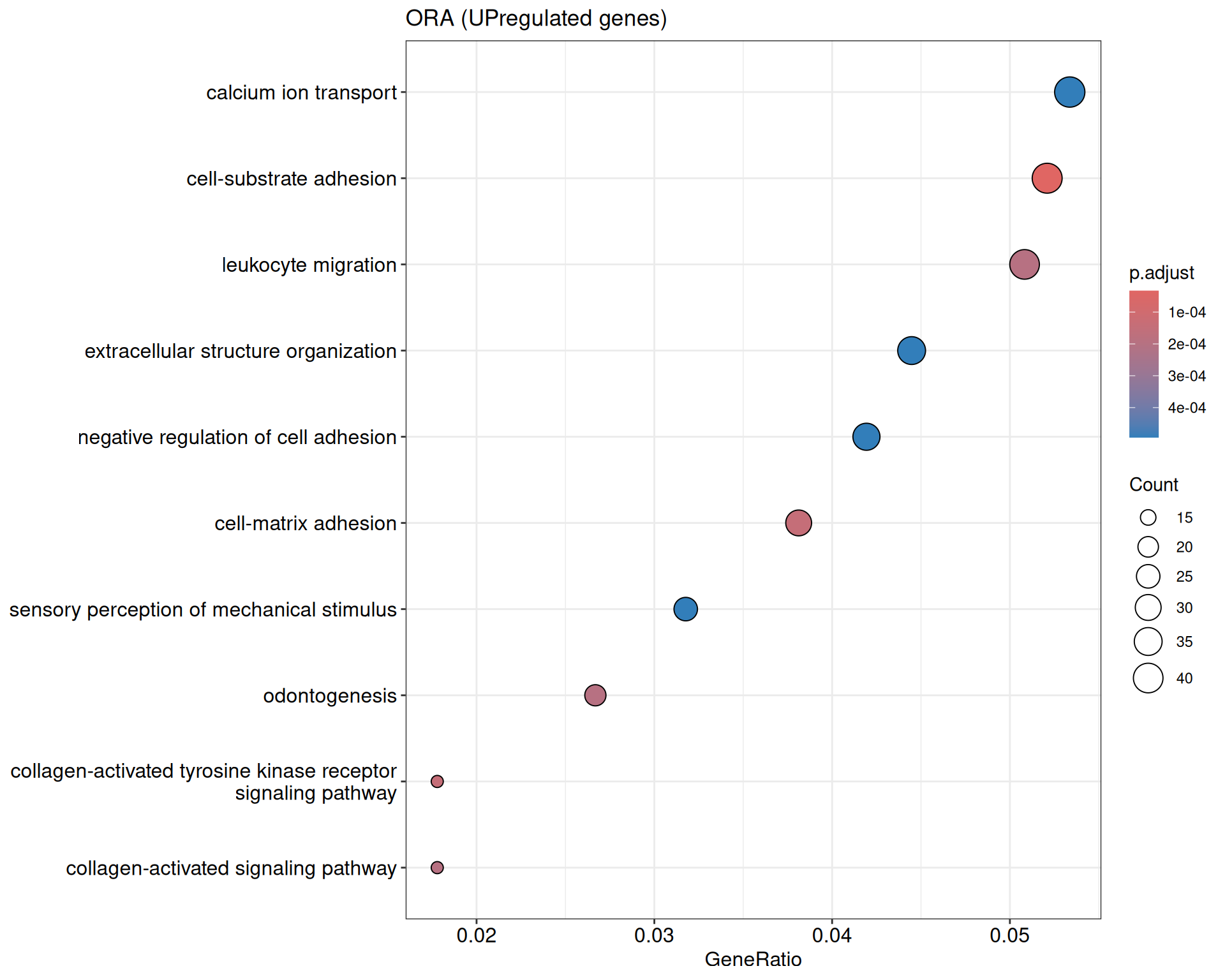 We performed a functional enrichment analysis based on Over-Representation Analysis (ORA) using the GO pathway database. Unlike GSEA, which considers the entire ranked list of genes, ORA focuses only on genes that meet specific differential expression thresholds (adjusted p-value and log2 fold change). The analysis was conducted separately for upregulated and downregulated genes to identify GO pathways that are significantly enriched in each group, compared to what would be expected by chance. This allows for a clearer biological interpretation of distinct transcriptional programs activated or suppressed in the dataset. The dot plots below display all significantly enriched GO pathways. Each dot’s size represents the number of differentially expressed genes associated with the pathway, while the color reflects the statistical significance of the enrichment (adjusted p-value).