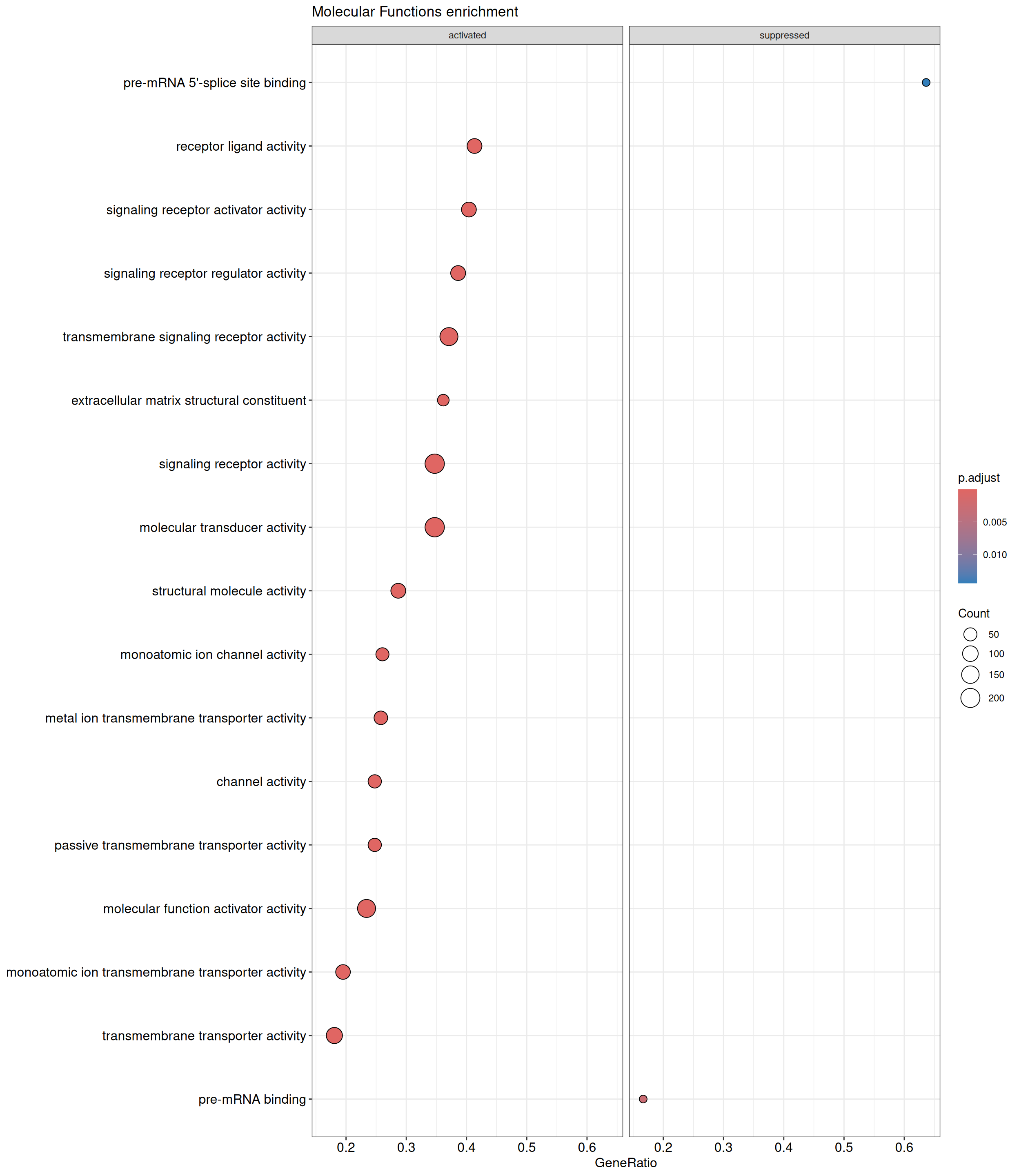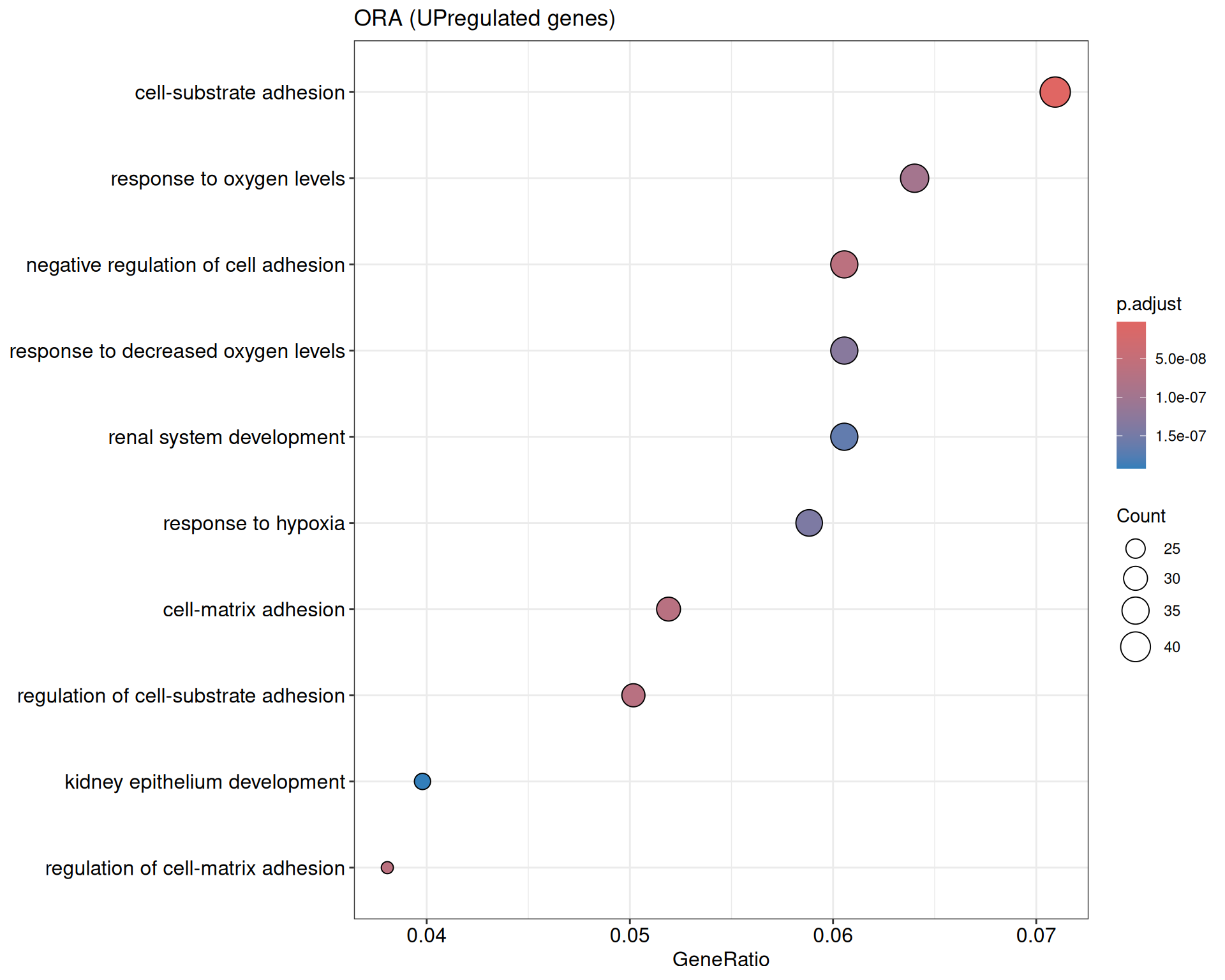 We performed a functional enrichment analysis based on Over-Representation Analysis (ORA) using the GO pathway database. Unlike GSEA, which considers the entire ranked list of genes, ORA focuses only on genes that meet specific differential expression thresholds (adjusted p-value and log2 fold change). The analysis was conducted separately for upregulated and downregulated genes to identify GO pathways that are significantly enriched in each group, compared to what would be expected by chance. This allows for a clearer biological interpretation of distinct transcriptional programs activated or suppressed in the dataset. The dot plots below display all significantly enriched GO pathways. Each dot’s size represents the number of differentially expressed genes associated with the pathway, while the color reflects the statistical significance of the enrichment (adjusted p-value).