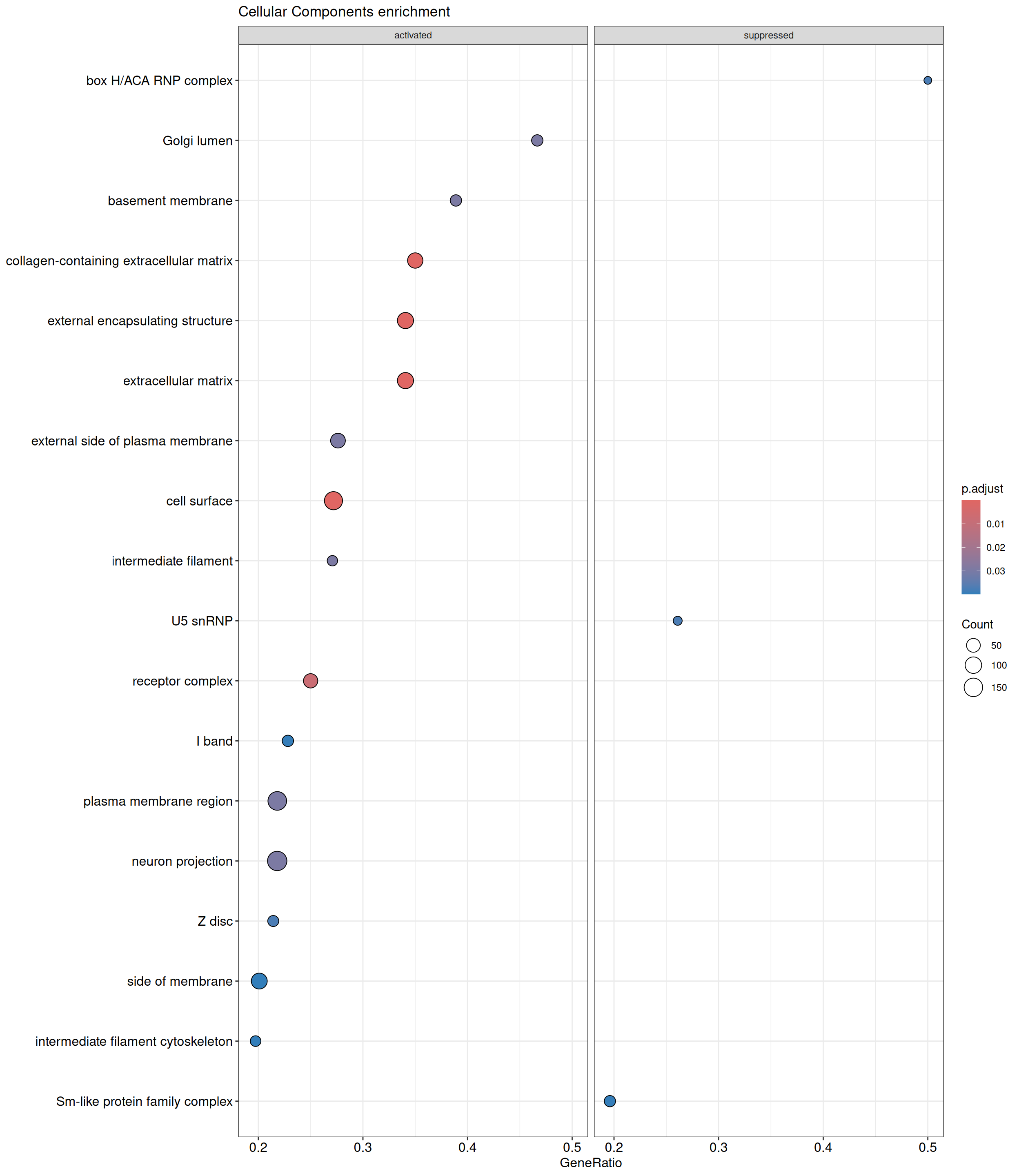 Further analysis is done through gene set enrichment analysis, which does not exclude genes based on logfc or adjusted p-value, as done previously. GSEA is performed separately on each subontology: biological processes (BP), cellular components (CC) and molecular functions (MF). The dot plot below shows all the enriched GO terms. The size of each dot correlates with the count of differentially expressed genes associated with each GO term. Furthermore, the color of each dot reflects the significance of the enrichment of the respective GO term, highlighting its relative importance.