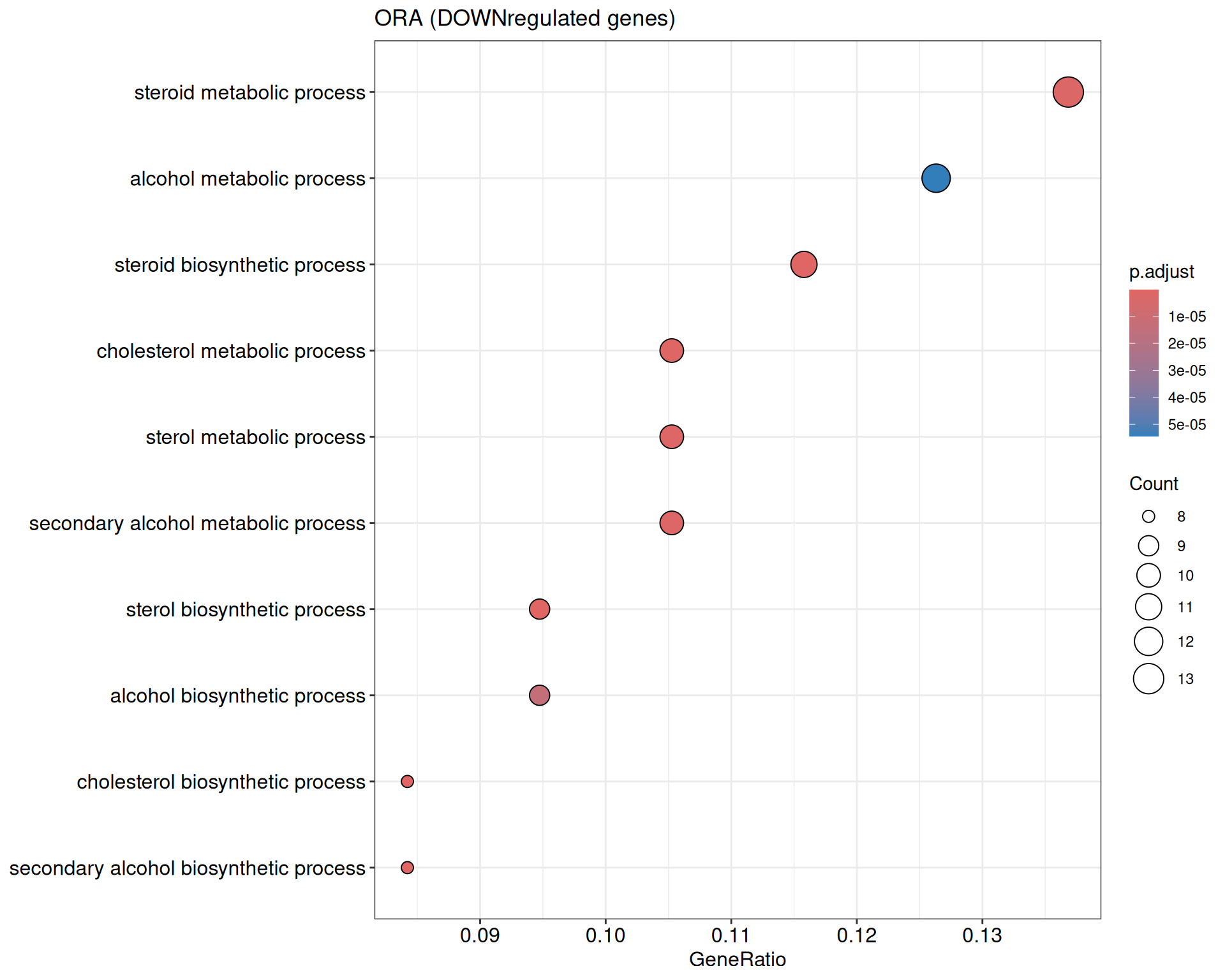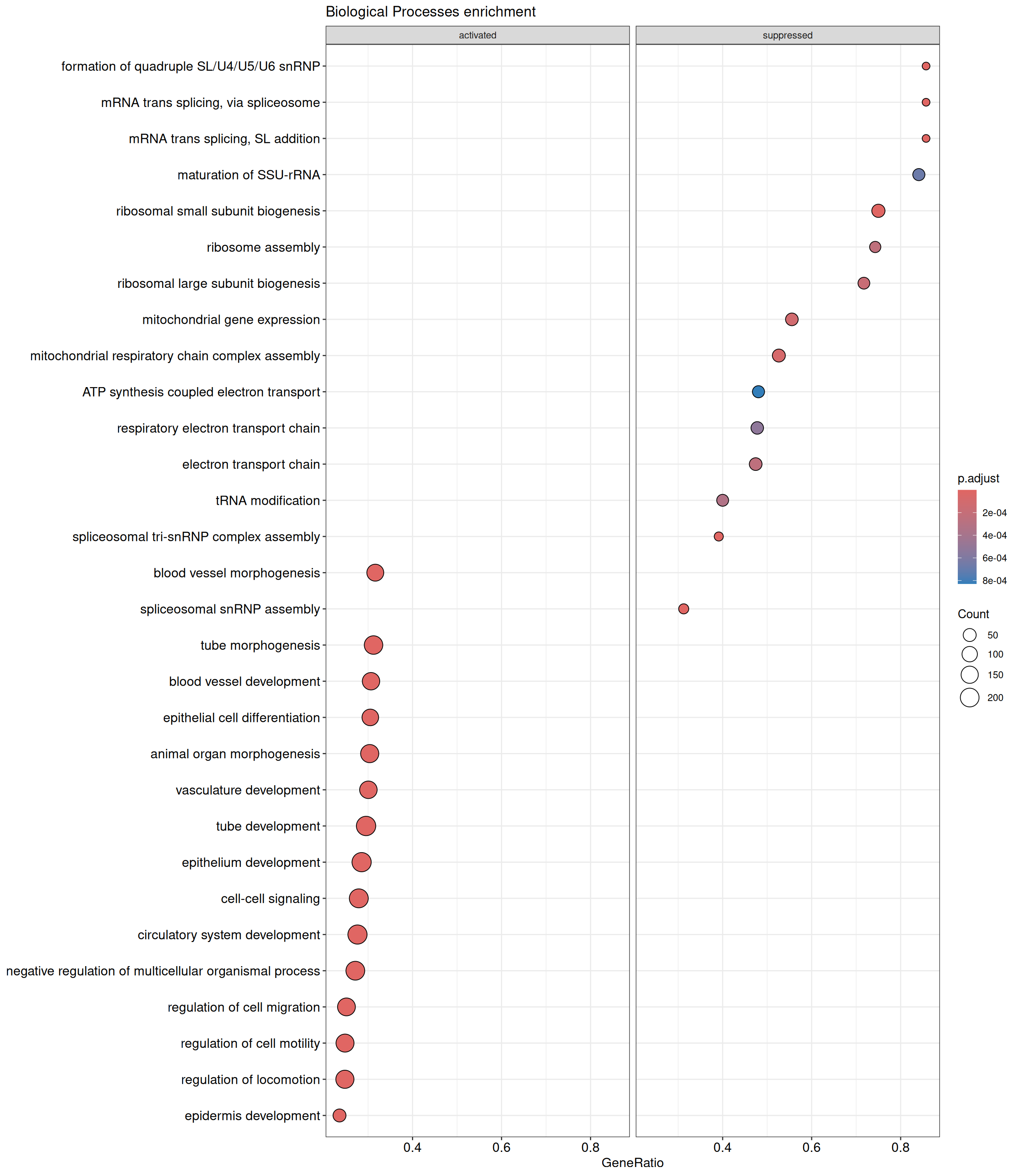We performed a functional enrichment analysis based on Over-Representation Analysis (ORA) using the GO pathway database. Unlike GSEA, which considers the entire ranked list of genes, ORA focuses only on genes that meet specific differential expression thresholds (adjusted p-value and log2 fold change). The analysis was conducted separately for upregulated and downregulated genes to identify GO pathways that are significantly enriched in each group, compared to what would be expected by chance. This allows for a clearer biological interpretation of distinct transcriptional programs activated or suppressed in the dataset. The dot plots below display all significantly enriched GO pathways. Each dot’s size represents the number of differentially expressed genes associated with the pathway, while the color reflects the statistical significance of the enrichment (adjusted p-value).