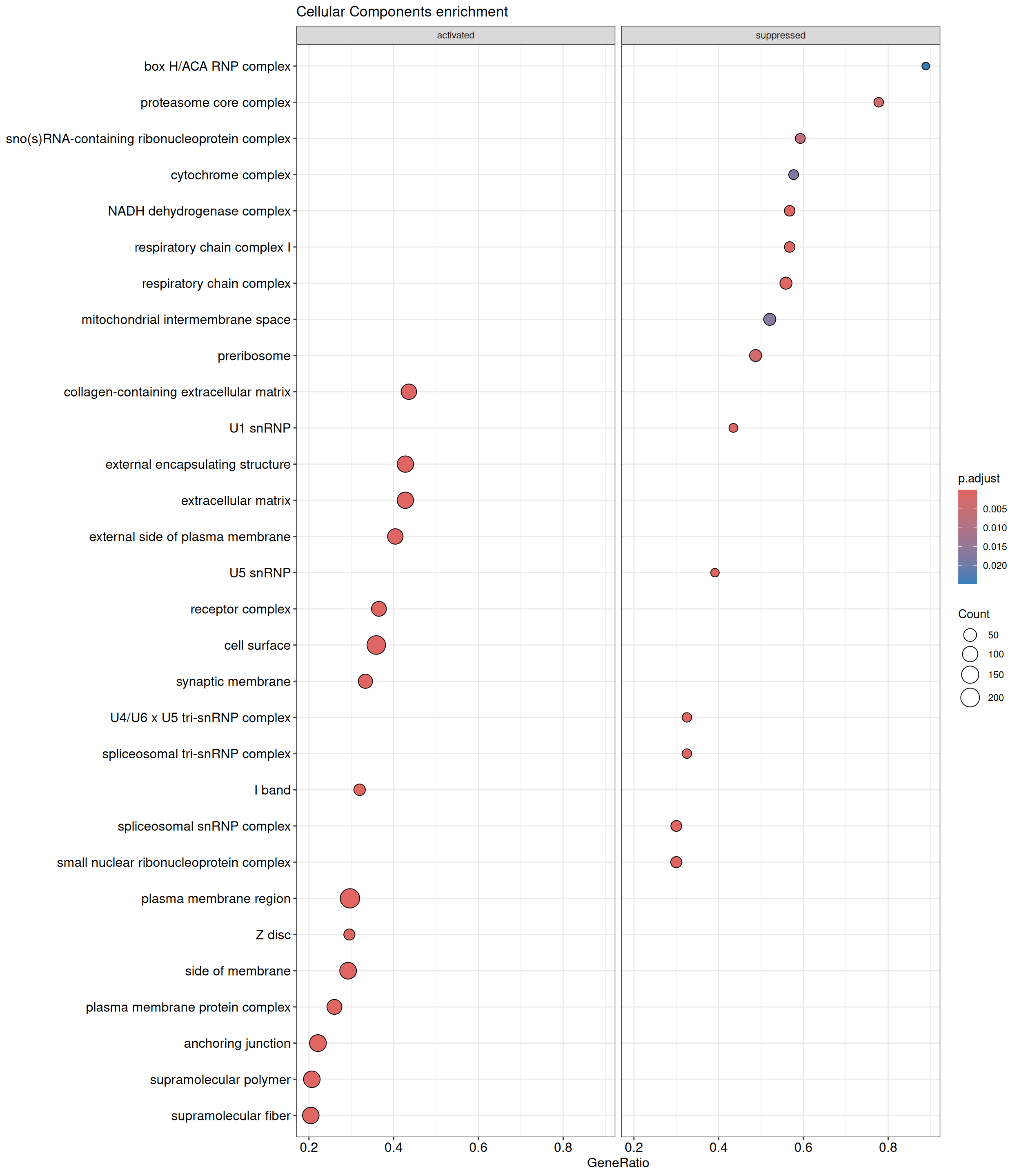 Further analysis is done through gene set enrichment analysis, which does not exclude genes based on logfc or adjusted p-value, as done previously. GSEA is performed separately on each subontology: biological processes (BP), cellular components (CC) and molecular functions (MF). The dot plot below shows all the enriched GO terms. The size of each dot correlates with the count of differentially expressed genes associated with each GO term. Furthermore, the color of each dot reflects the significance of the enrichment of the respective GO term, highlighting its relative importance.