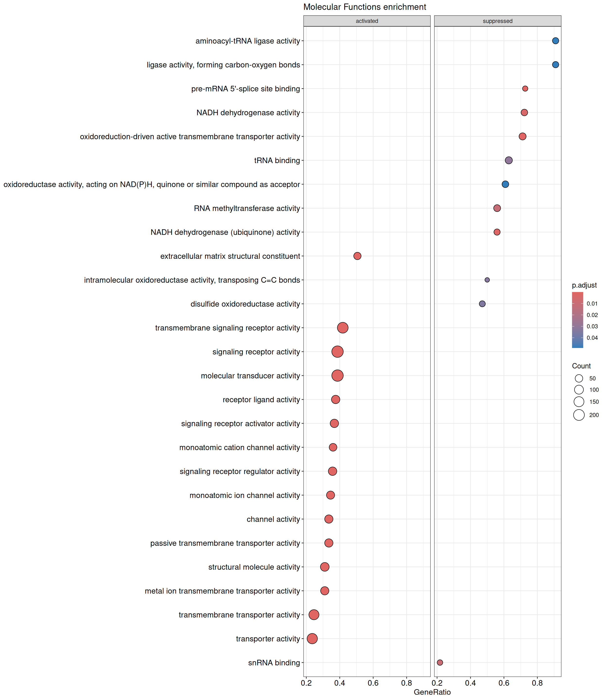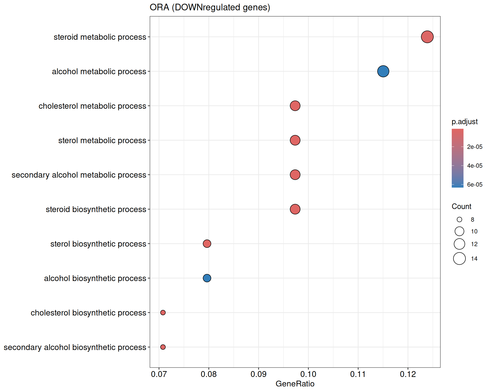 We performed a functional enrichment analysis based on Over-Representation Analysis (ORA) using the GO pathway database. Unlike GSEA, which considers the entire ranked list of genes, ORA focuses only on genes that meet specific differential expression thresholds (adjusted p-value and log2 fold change). The analysis was conducted separately for upregulated and downregulated genes to identify GO pathways that are significantly enriched in each group, compared to what would be expected by chance. This allows for a clearer biological interpretation of distinct transcriptional programs activated or suppressed in the dataset. The dot plots below display all significantly enriched GO pathways. Each dot’s size represents the number of differentially expressed genes associated with the pathway, while the color reflects the statistical significance of the enrichment (adjusted p-value).