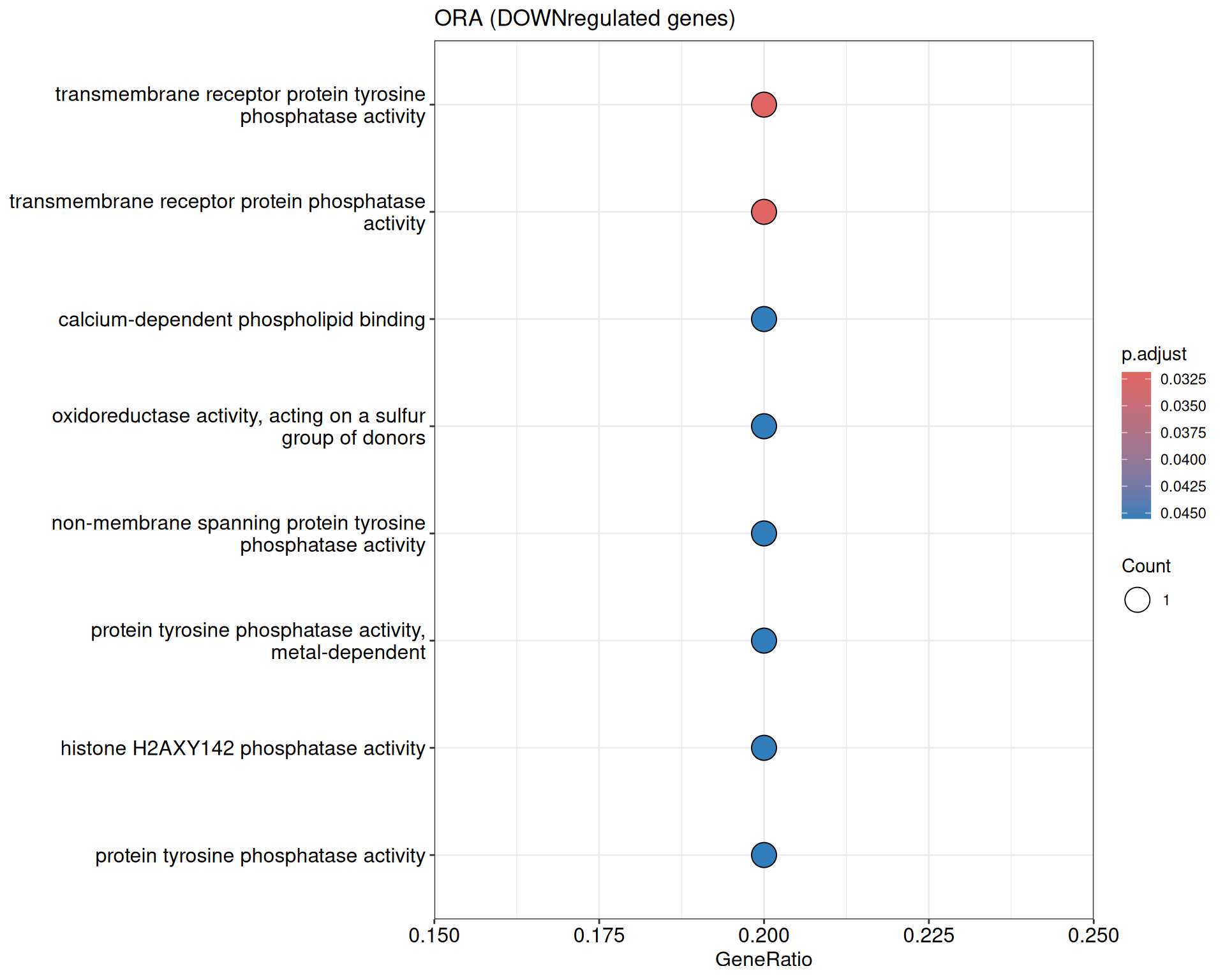We performed a functional enrichment analysis based on Over-Representation Analysis (ORA) using the GO pathway database. Unlike GSEA, which considers the entire ranked list of genes, ORA focuses only on genes that meet specific differential expression thresholds (adjusted p-value and log2 fold change). The analysis was conducted separately for upregulated and downregulated genes to identify GO pathways that are significantly enriched in each group, compared to what would be expected by chance. This allows for a clearer biological interpretation of distinct transcriptional programs activated or suppressed in the dataset. The dot plots below display all significantly enriched GO pathways. Each dot’s size represents the number of differentially expressed genes associated with the pathway, while the color reflects the statistical significance of the enrichment (adjusted p-value).