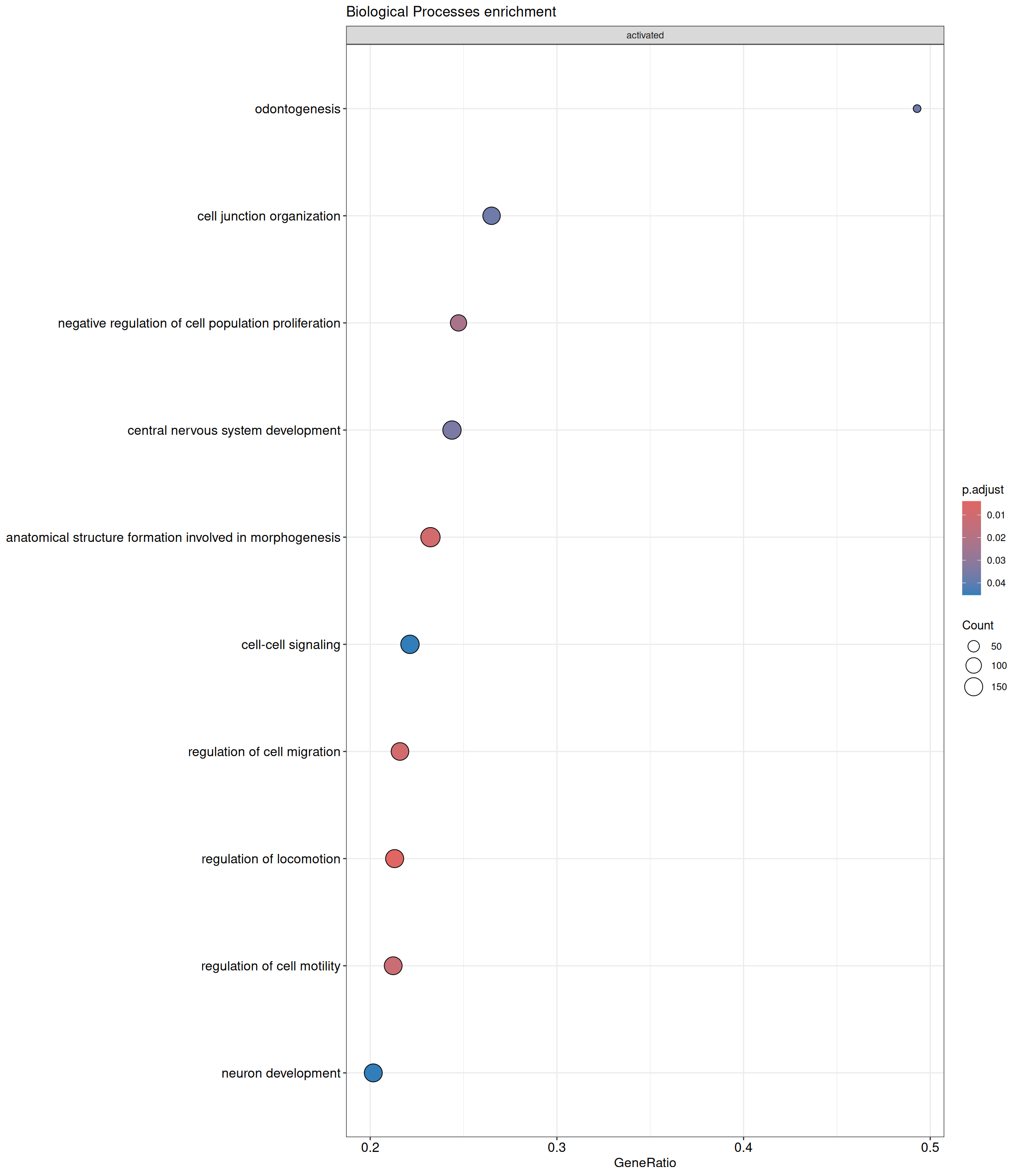 GSEA is performed separately on each subontology: biological processes (BP), cellular components (CC) and molecular functions (MF). The dot plot below shows all the enriched GO terms. The size of each dot correlates with the count of differentially expressed genes associated with each GO term. Furthermore, the color of each dot reflects the significance of the enrichment of the respective GO term, highlighting its relative importance.