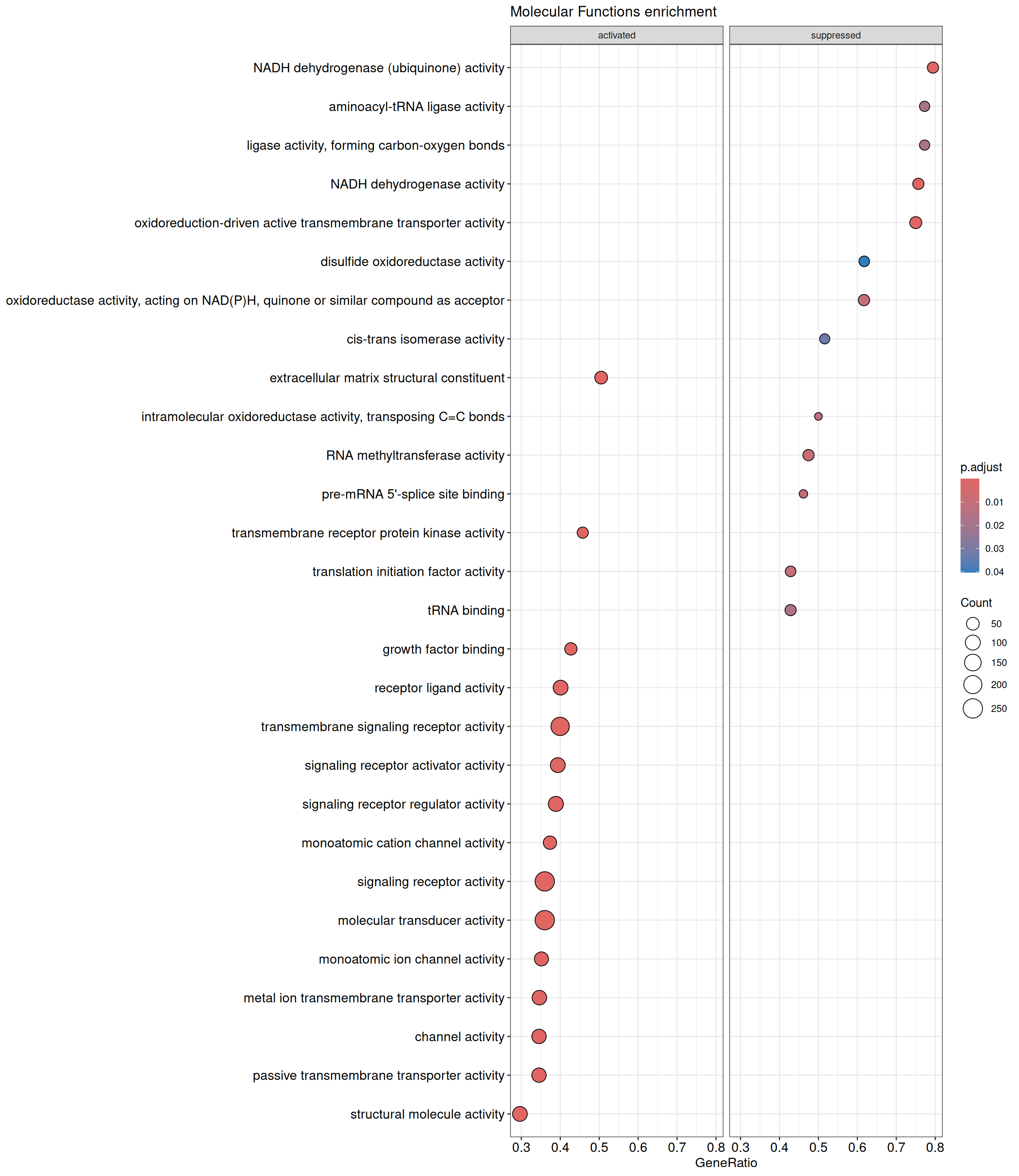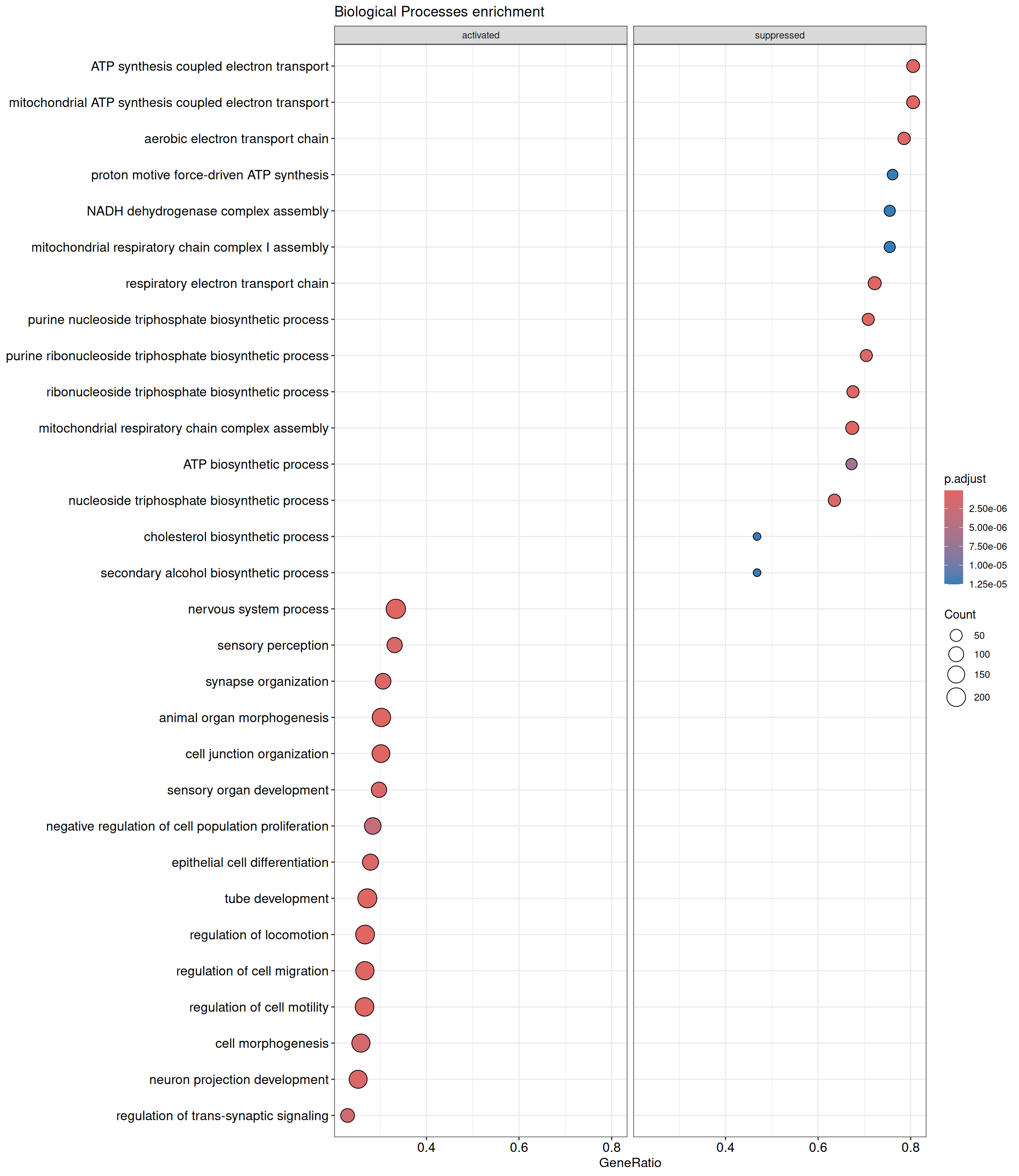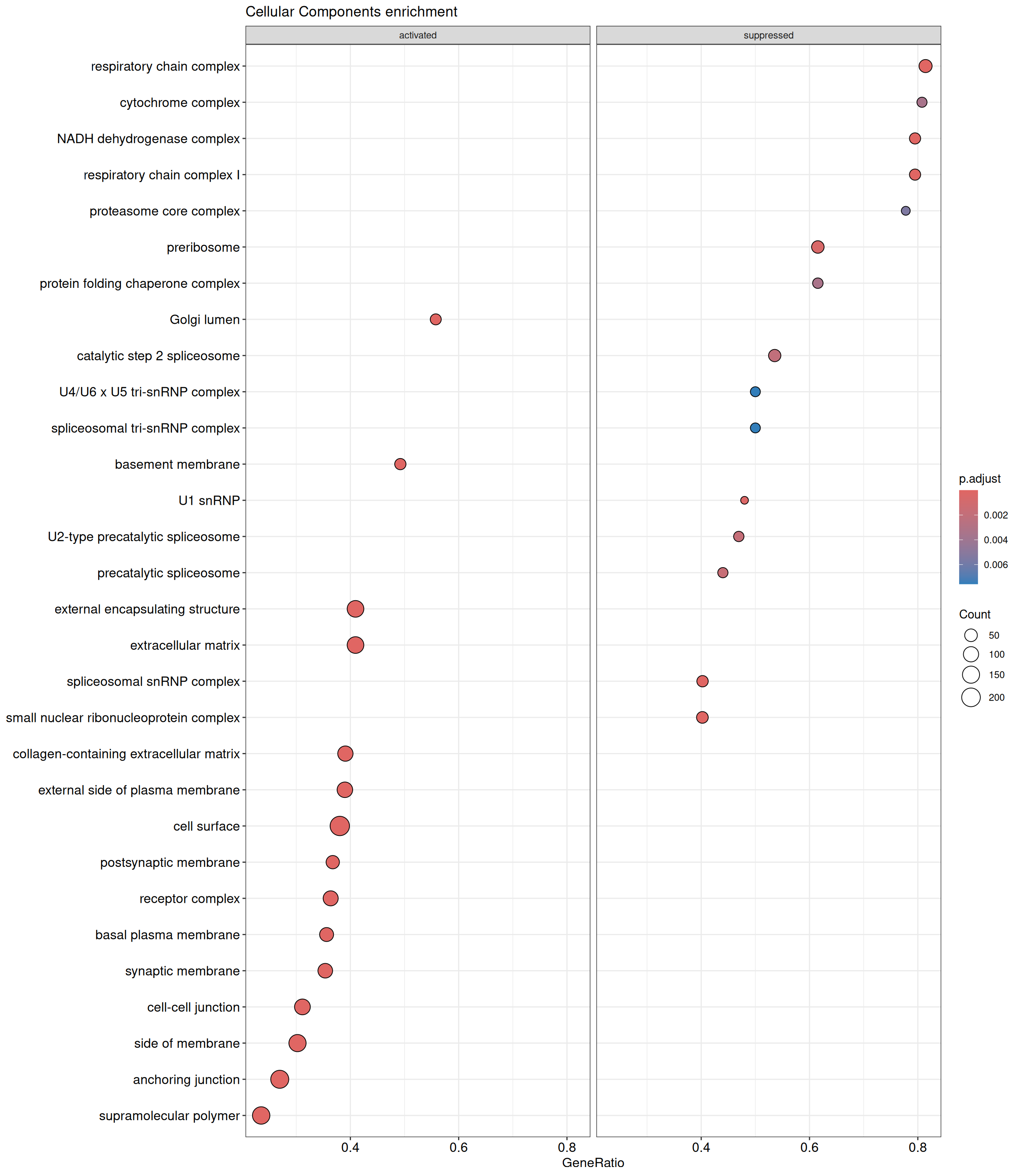 GSEA is performed separately on each subontology: biological processes (BP), cellular components (CC) and molecular functions (MF). The dot plot below shows all the enriched GO terms. The size of each dot correlates with the count of differentially expressed genes associated with each GO term. Furthermore, the color of each dot reflects the significance of the enrichment of the respective GO term, highlighting its relative importance.