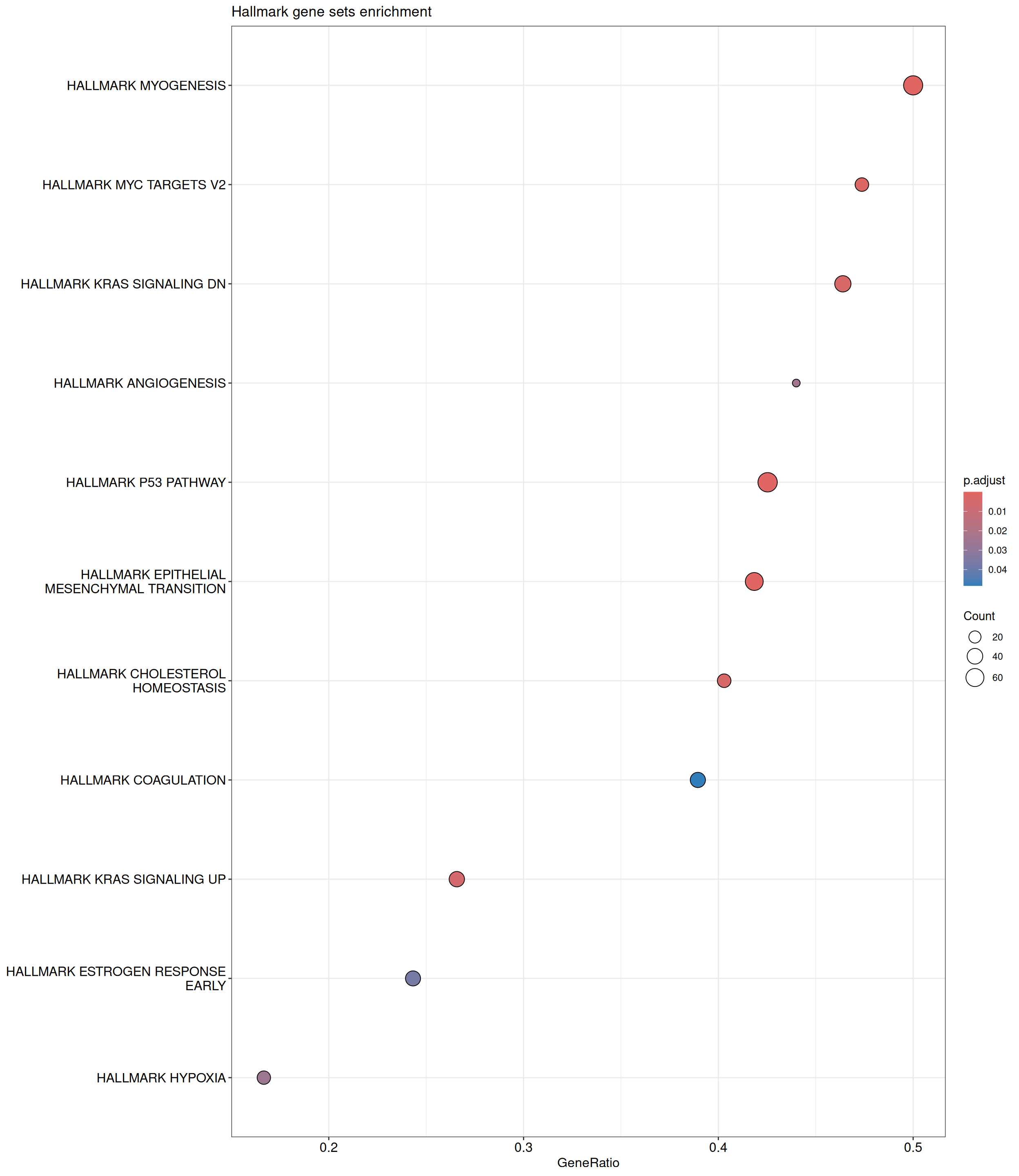 GSEA is performed using the Hallmark gene sets, which represent well-defined biological states and processes. The dot plot below displays all enriched Hallmark pathways. The size of each dot corresponds to the number of differentially expressed genes contributing to each pathway. Additionally, the color of each dot indicates the significance of the pathway’s enrichment, emphasizing its relative importance.