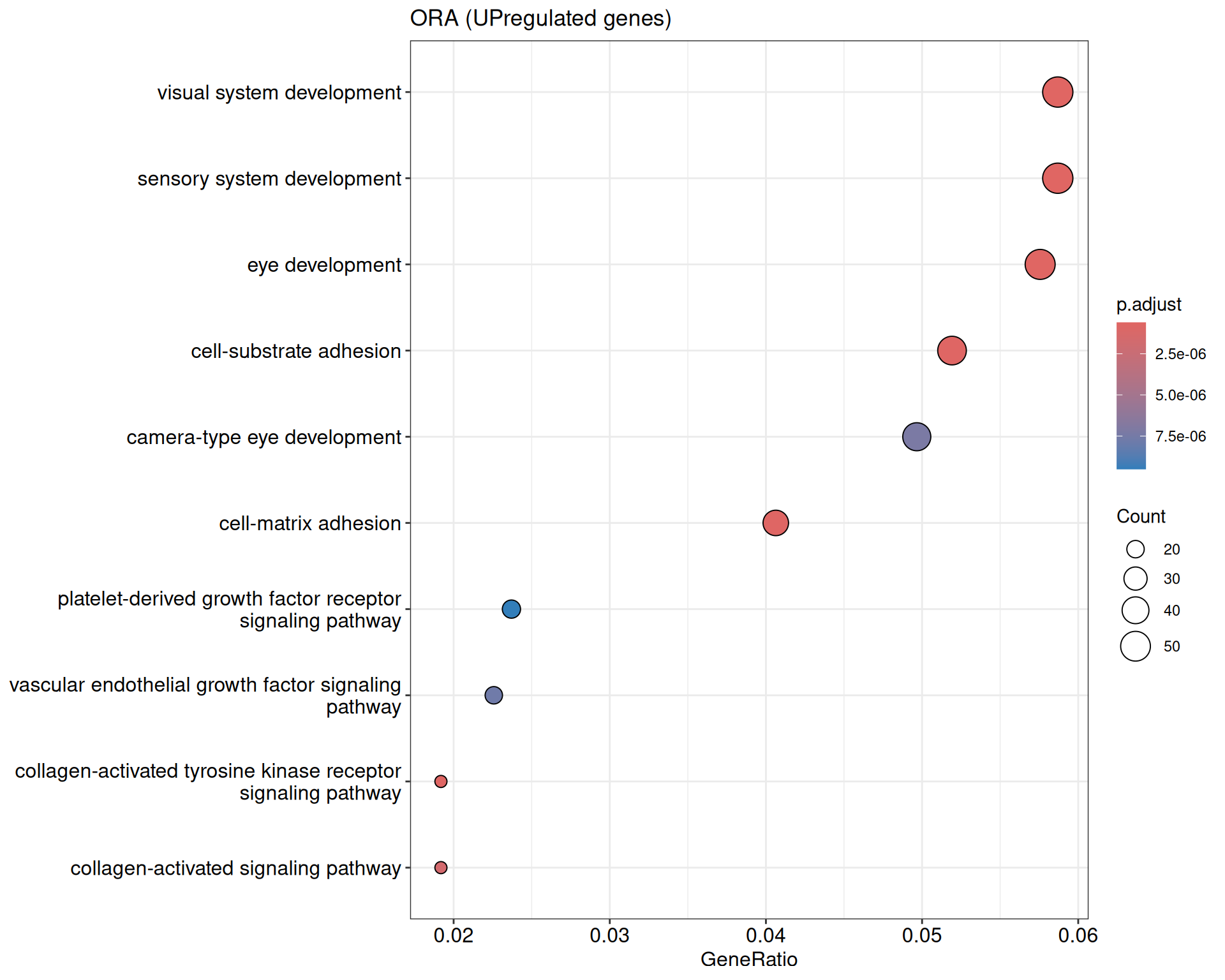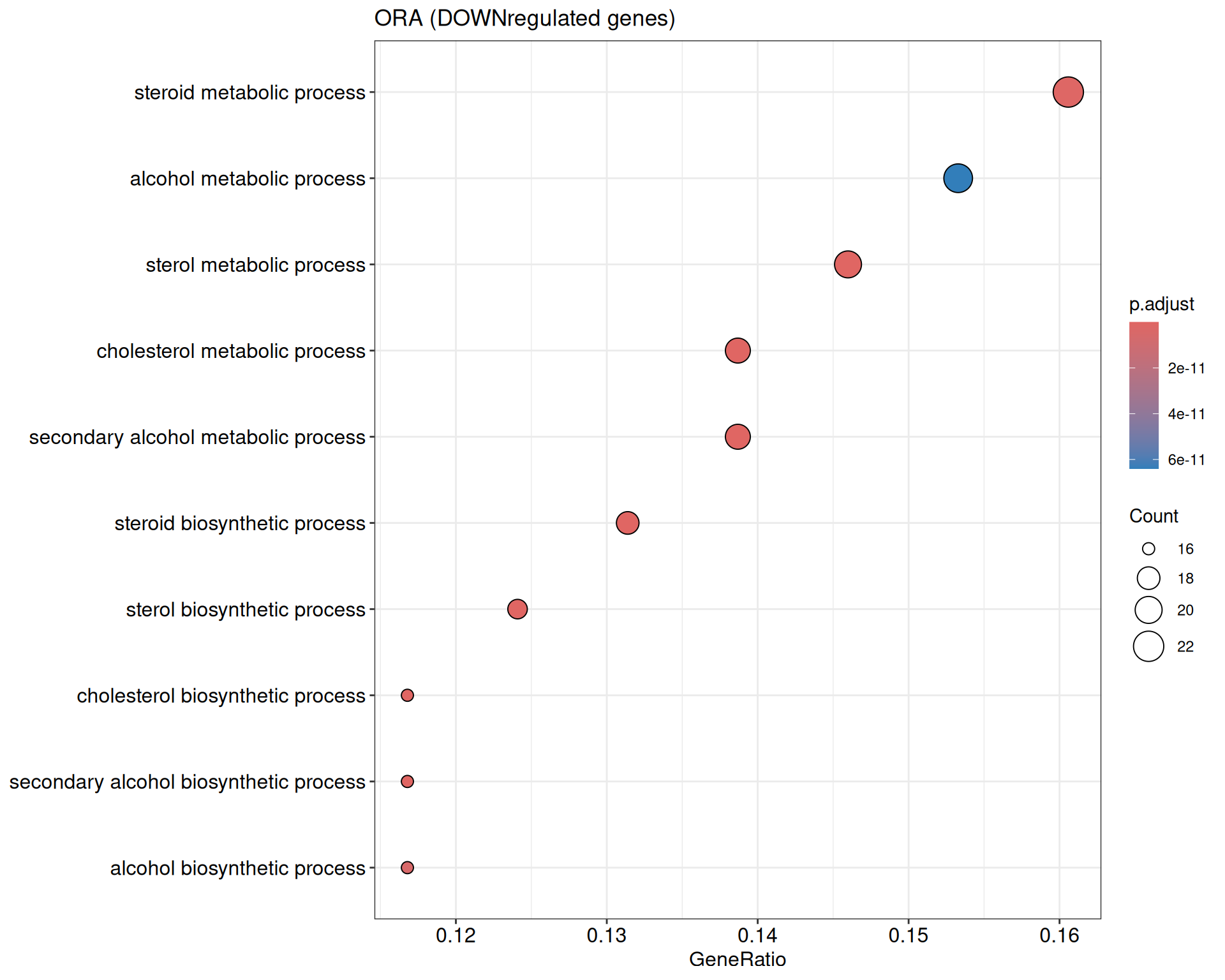 We performed a functional enrichment analysis based on Over-Representation Analysis (ORA) using the GO pathway database. Unlike GSEA, which considers the entire ranked list of genes, ORA focuses only on genes that meet specific differential expression thresholds (adjusted p-value and log2 fold change). The analysis was conducted separately for upregulated and downregulated genes to identify GO pathways that are significantly enriched in each group, compared to what would be expected by chance. This allows for a clearer biological interpretation of distinct transcriptional programs activated or suppressed in the dataset. The dot plots below display all significantly enriched GO pathways. Each dot’s size represents the number of differentially expressed genes associated with the pathway, while the color reflects the statistical significance of the enrichment (adjusted p-value).