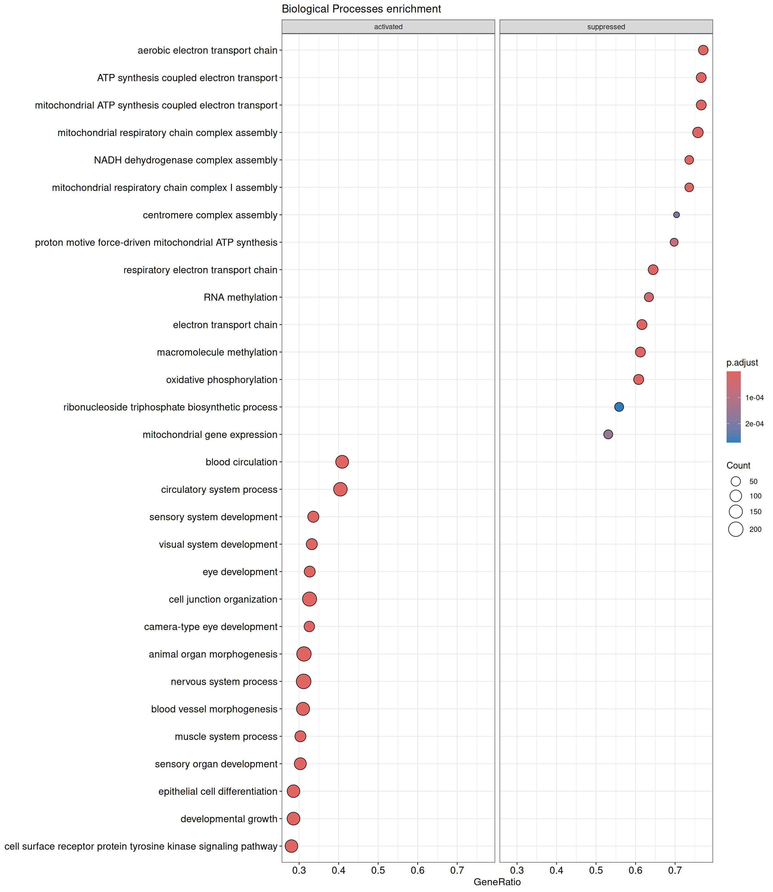 We performed a functional enrichment analysis based on Over-Representation Analysis (ORA) using the GO pathway database. Unlike GSEA, which considers the entire ranked list of genes, ORA focuses only on genes that meet specific differential expression thresholds (adjusted p-value and log2 fold change). The analysis was conducted separately for upregulated and downregulated genes to identify GO pathways that are significantly enriched in each group, compared to what would be expected by chance. This allows for a clearer biological interpretation of distinct transcriptional programs activated or suppressed in the dataset. The dot plots below display all significantly enriched GO pathways. Each dot’s size represents the number of differentially expressed genes associated with the pathway, while the color reflects the statistical significance of the enrichment (adjusted p-value).