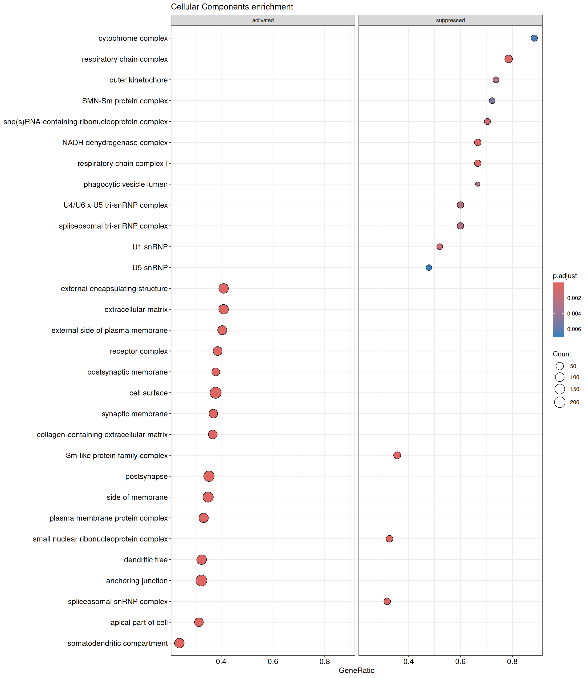 GSEA is performed separately on each subontology: biological processes (BP), cellular components (CC) and molecular functions (MF). The dot plot below shows all the enriched GO terms. The size of each dot correlates with the count of differentially expressed genes associated with each GO term. Furthermore, the color of each dot reflects the significance of the enrichment of the respective GO term, highlighting its relative importance.