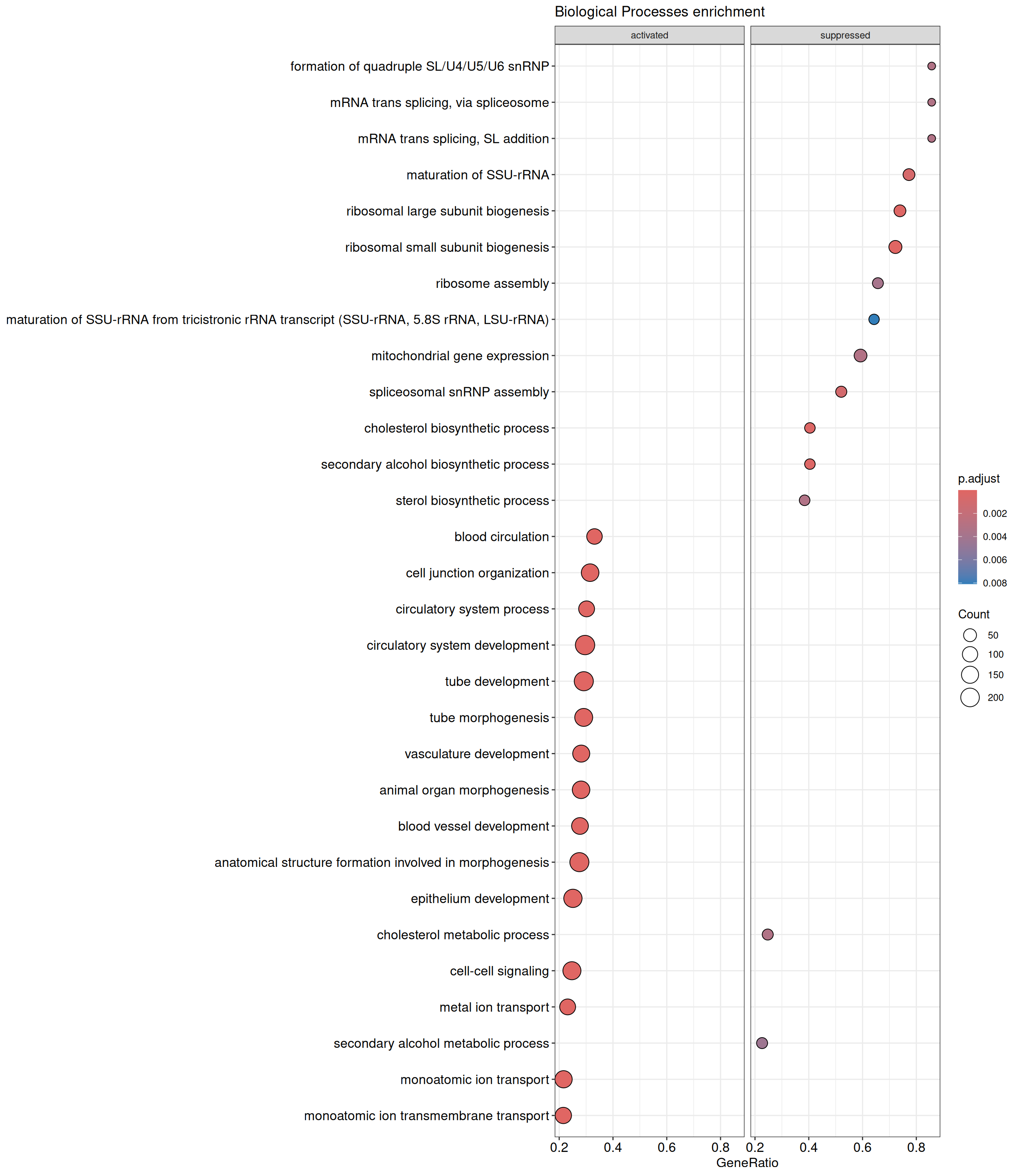 We performed a functional enrichment analysis based on Over-Representation Analysis (ORA) using the GO pathway database. Unlike GSEA, which considers the entire ranked list of genes, ORA focuses only on genes that meet specific differential expression thresholds (adjusted p-value and log2 fold change). The analysis was conducted separately for upregulated and downregulated genes to identify GO pathways that are significantly enriched in each group, compared to what would be expected by chance. This allows for a clearer biological interpretation of distinct transcriptional programs activated or suppressed in the dataset. The dot plots below display all significantly enriched GO pathways. Each dot’s size represents the number of differentially expressed genes associated with the pathway, while the color reflects the statistical significance of the enrichment (adjusted p-value).