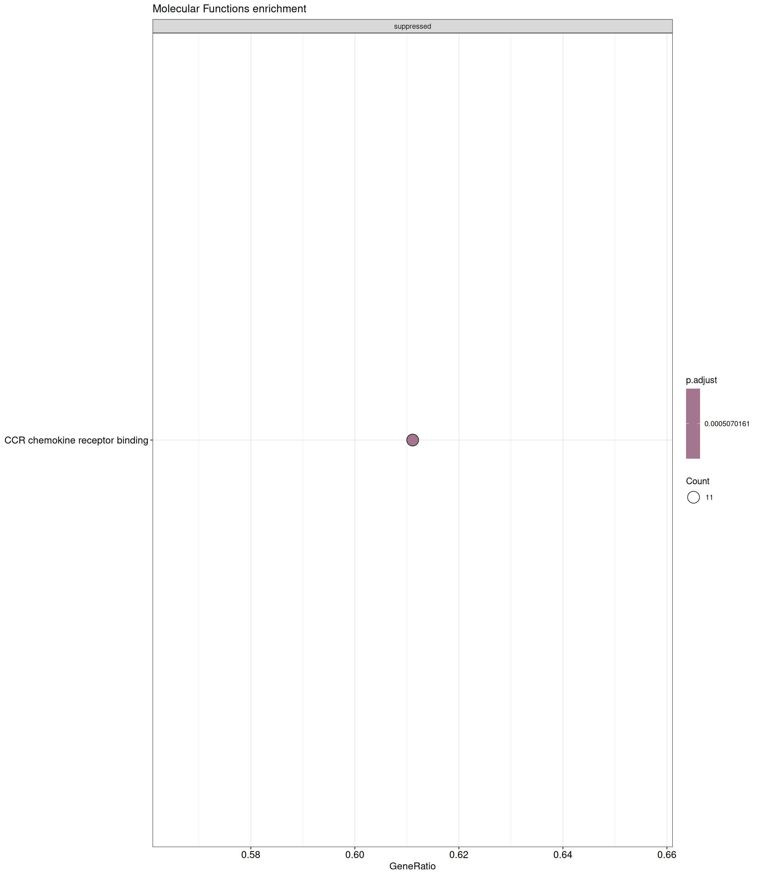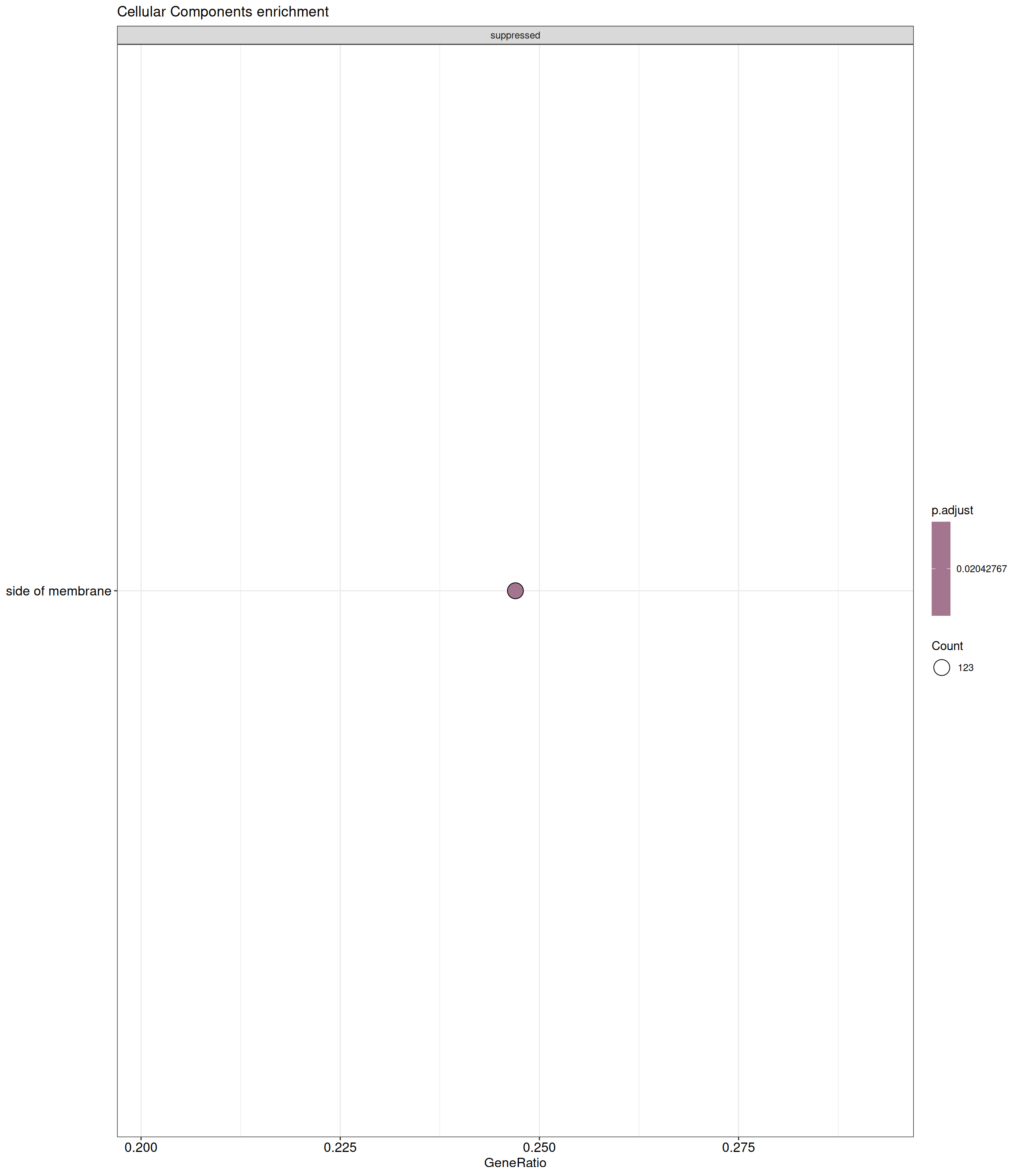GSEA is performed separately on each subontology: biological processes (BP), cellular components (CC) and molecular functions (MF). The dot plot below shows all the enriched GO terms. The size of each dot correlates with the count of differentially expressed genes associated with each GO term. Furthermore, the color of each dot reflects the significance of the enrichment of the respective GO term, highlighting its relative importance.