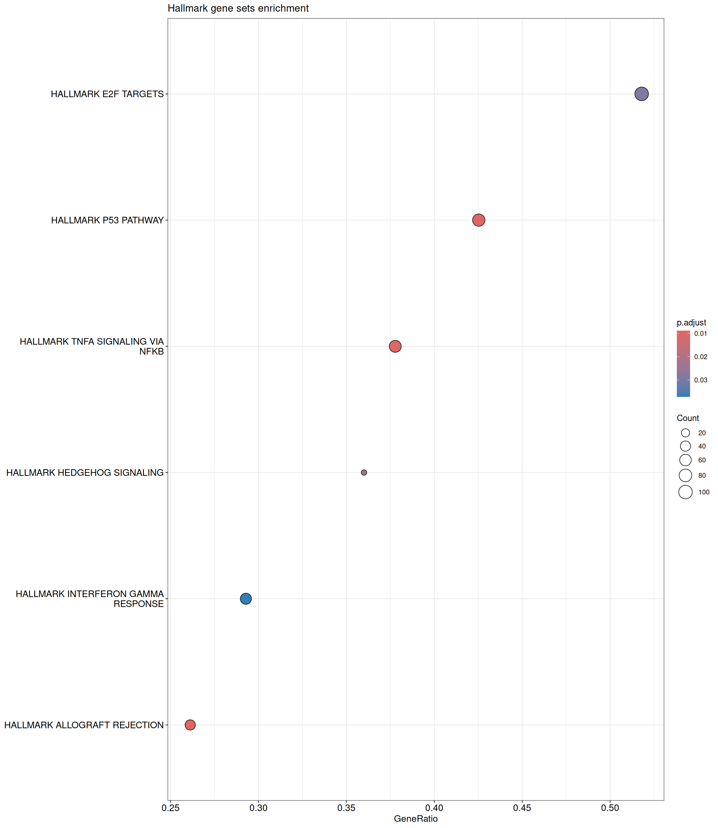 GSEA is performed using the Hallmark gene sets, which represent well-defined biological states and processes. The dot plot below displays all enriched Hallmark pathways. The size of each dot corresponds to the number of differentially expressed genes contributing to each pathway. Additionally, the color of each dot indicates the significance of the pathway’s enrichment, emphasizing its relative importance.
