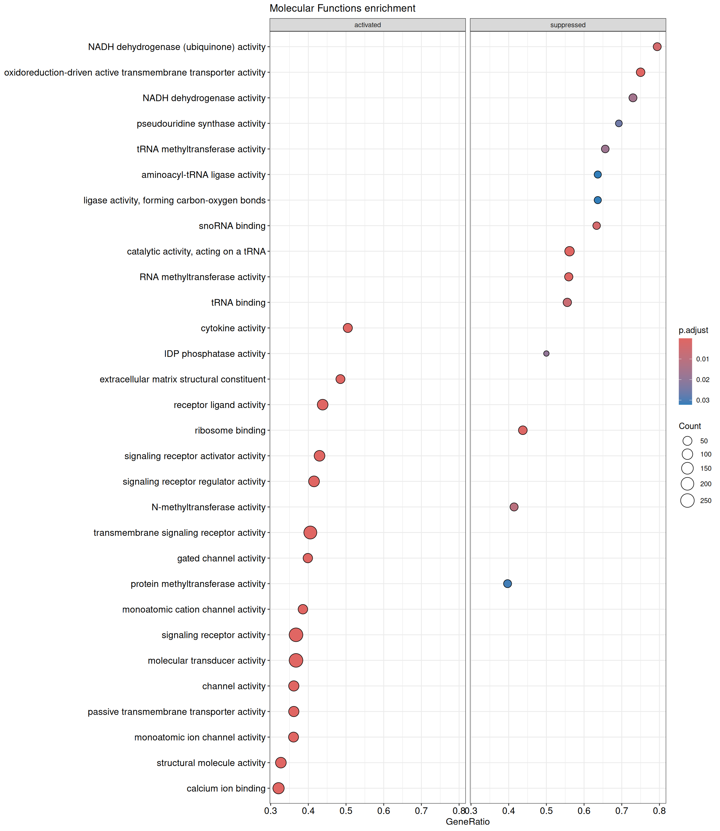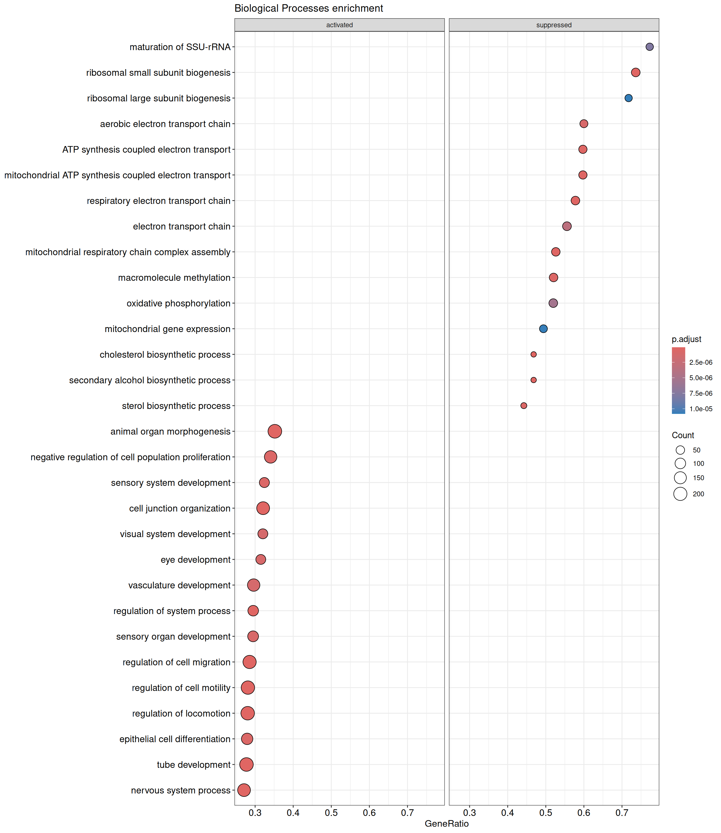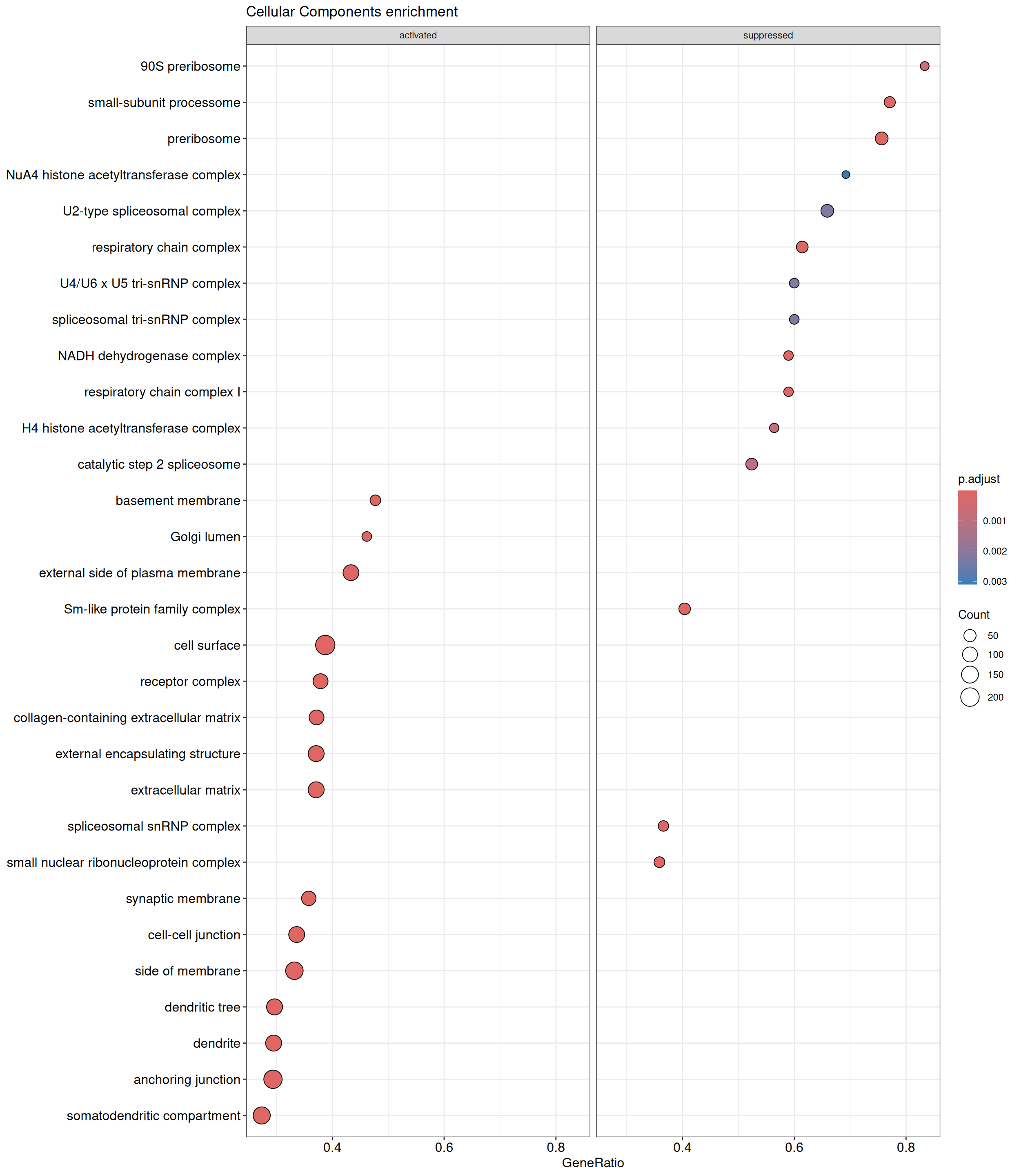 GSEA is performed separately on each subontology: biological processes (BP), cellular components (CC) and molecular functions (MF). The dot plot below shows all the enriched GO terms. The size of each dot correlates with the count of differentially expressed genes associated with each GO term. Furthermore, the color of each dot reflects the significance of the enrichment of the respective GO term, highlighting its relative importance.