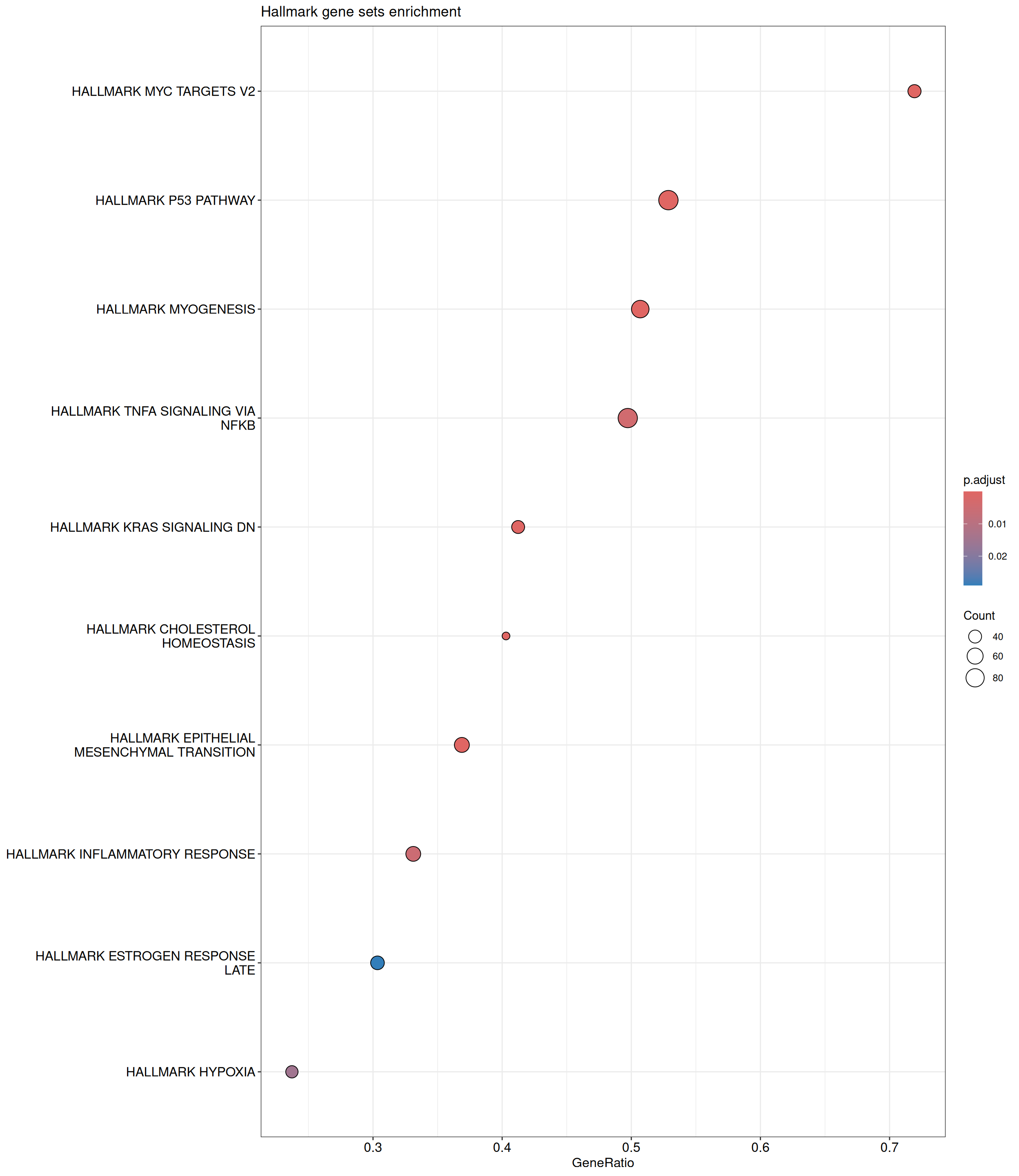 GSEA is performed using the Hallmark gene sets, which represent well-defined biological states and processes. The dot plot below displays all enriched Hallmark pathways. The size of each dot corresponds to the number of differentially expressed genes contributing to each pathway. Additionally, the color of each dot indicates the significance of the pathway’s enrichment, emphasizing its relative importance.