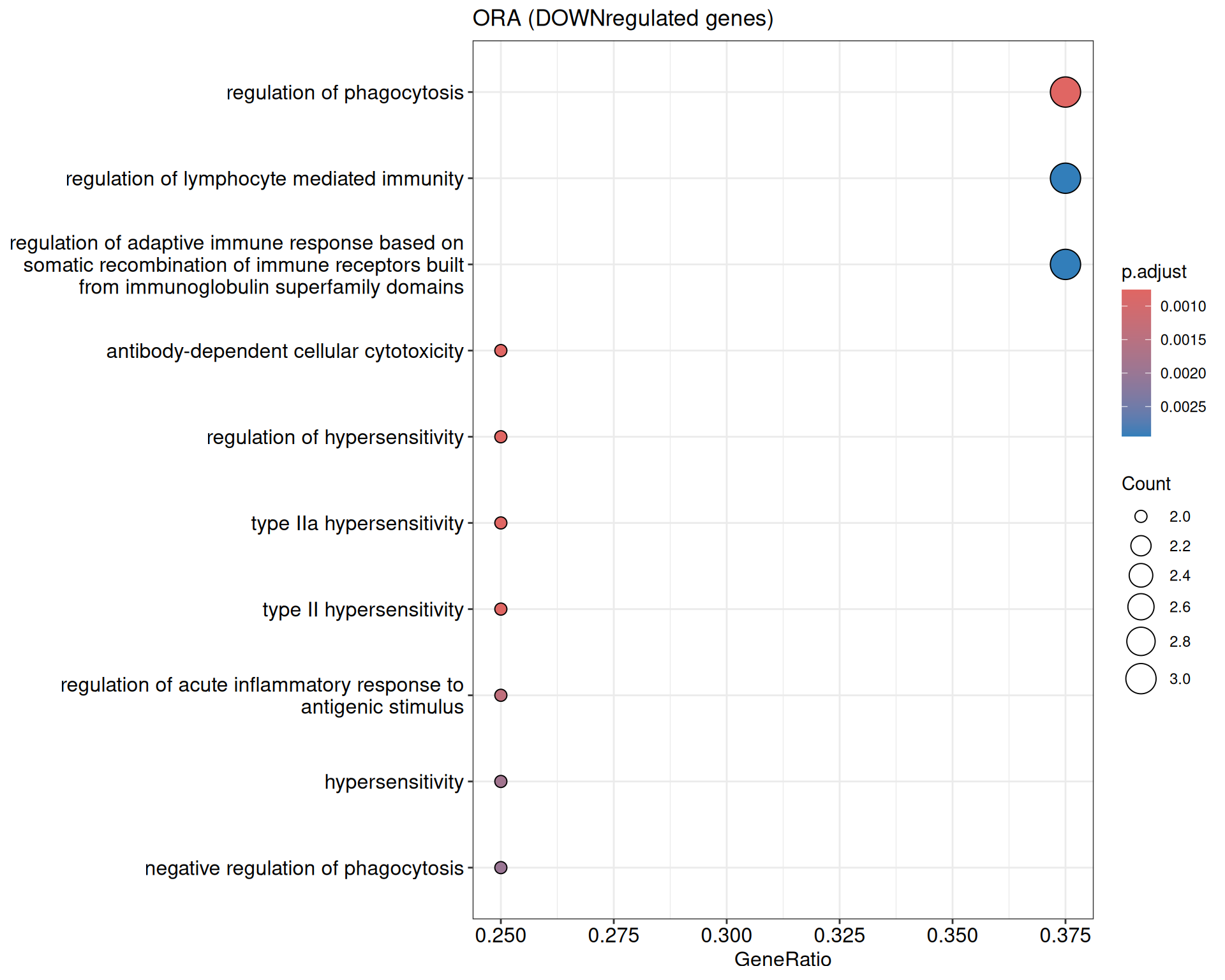 We performed a functional enrichment analysis based on Over-Representation Analysis (ORA) using the GO pathway database. Unlike GSEA, which considers the entire ranked list of genes, ORA focuses only on genes that meet specific differential expression thresholds (adjusted p-value and log2 fold change). The analysis was conducted separately for upregulated and downregulated genes to identify GO pathways that are significantly enriched in each group, compared to what would be expected by chance. This allows for a clearer biological interpretation of distinct transcriptional programs activated or suppressed in the dataset. The dot plots below display all significantly enriched GO pathways. Each dot’s size represents the number of differentially expressed genes associated with the pathway, while the color reflects the statistical significance of the enrichment (adjusted p-value).