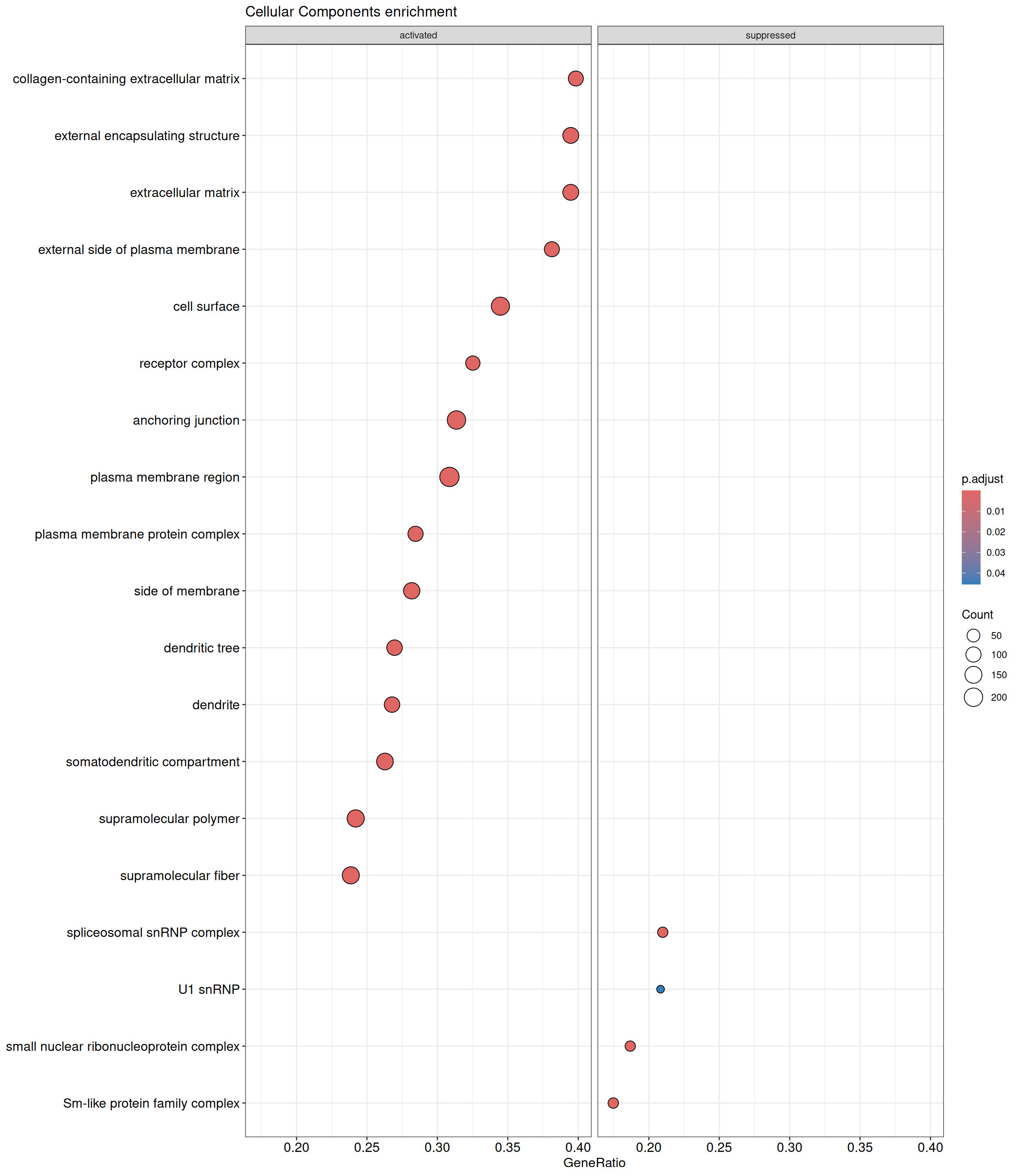 GSEA is performed separately on each subontology: biological processes (BP), cellular components (CC) and molecular functions (MF). The dot plot below shows all the enriched GO terms. The size of each dot correlates with the count of differentially expressed genes associated with each GO term. Furthermore, the color of each dot reflects the significance of the enrichment of the respective GO term, highlighting its relative importance.