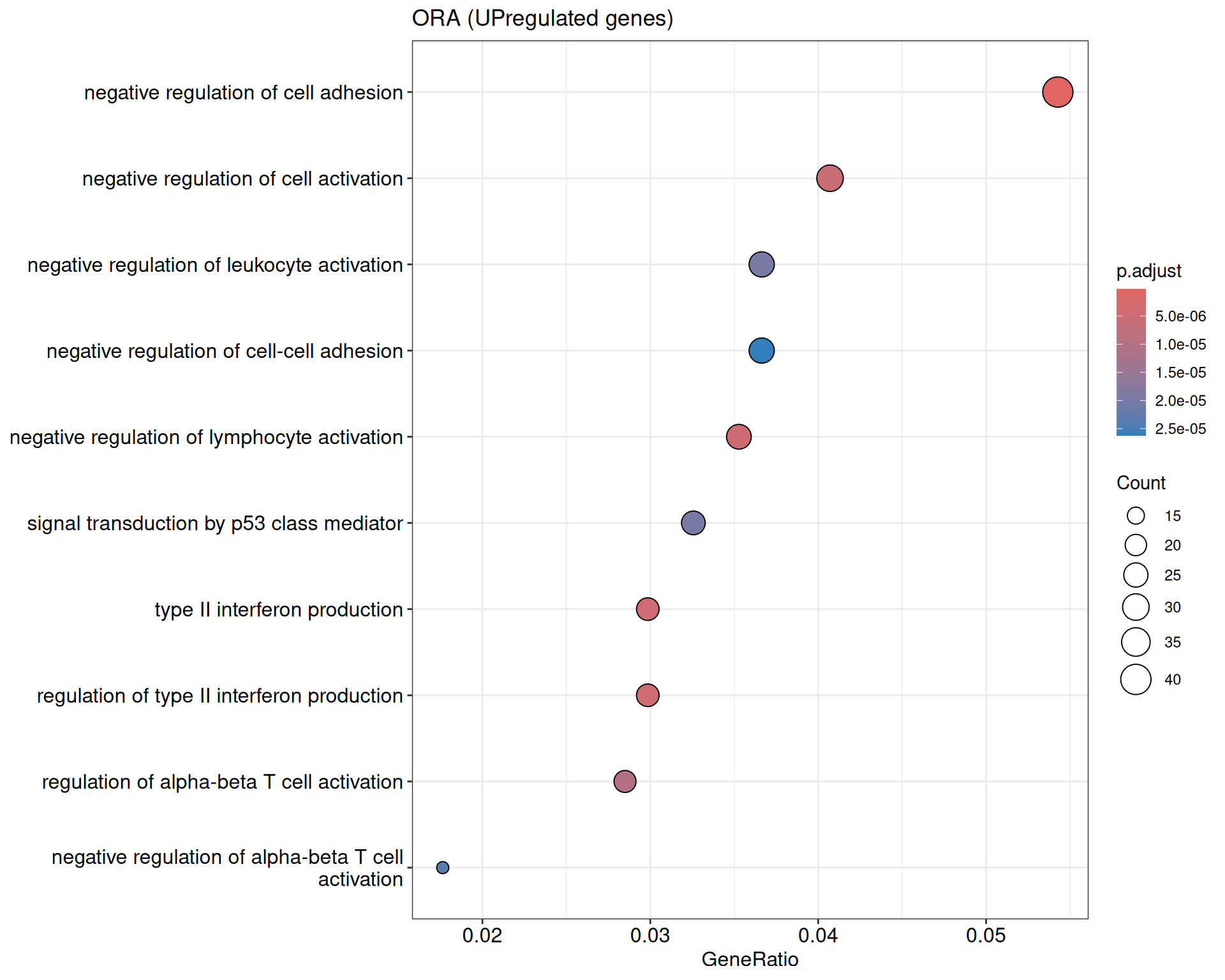We performed a functional enrichment analysis based on Over-Representation Analysis (ORA) using the GO pathway database. Unlike GSEA, which considers the entire ranked list of genes, ORA focuses only on genes that meet specific differential expression thresholds (adjusted p-value and log2 fold change). The analysis was conducted separately for upregulated and downregulated genes to identify GO pathways that are significantly enriched in each group, compared to what would be expected by chance. This allows for a clearer biological interpretation of distinct transcriptional programs activated or suppressed in the dataset. The dot plots below display all significantly enriched GO pathways. Each dot’s size represents the number of differentially expressed genes associated with the pathway, while the color reflects the statistical significance of the enrichment (adjusted p-value).