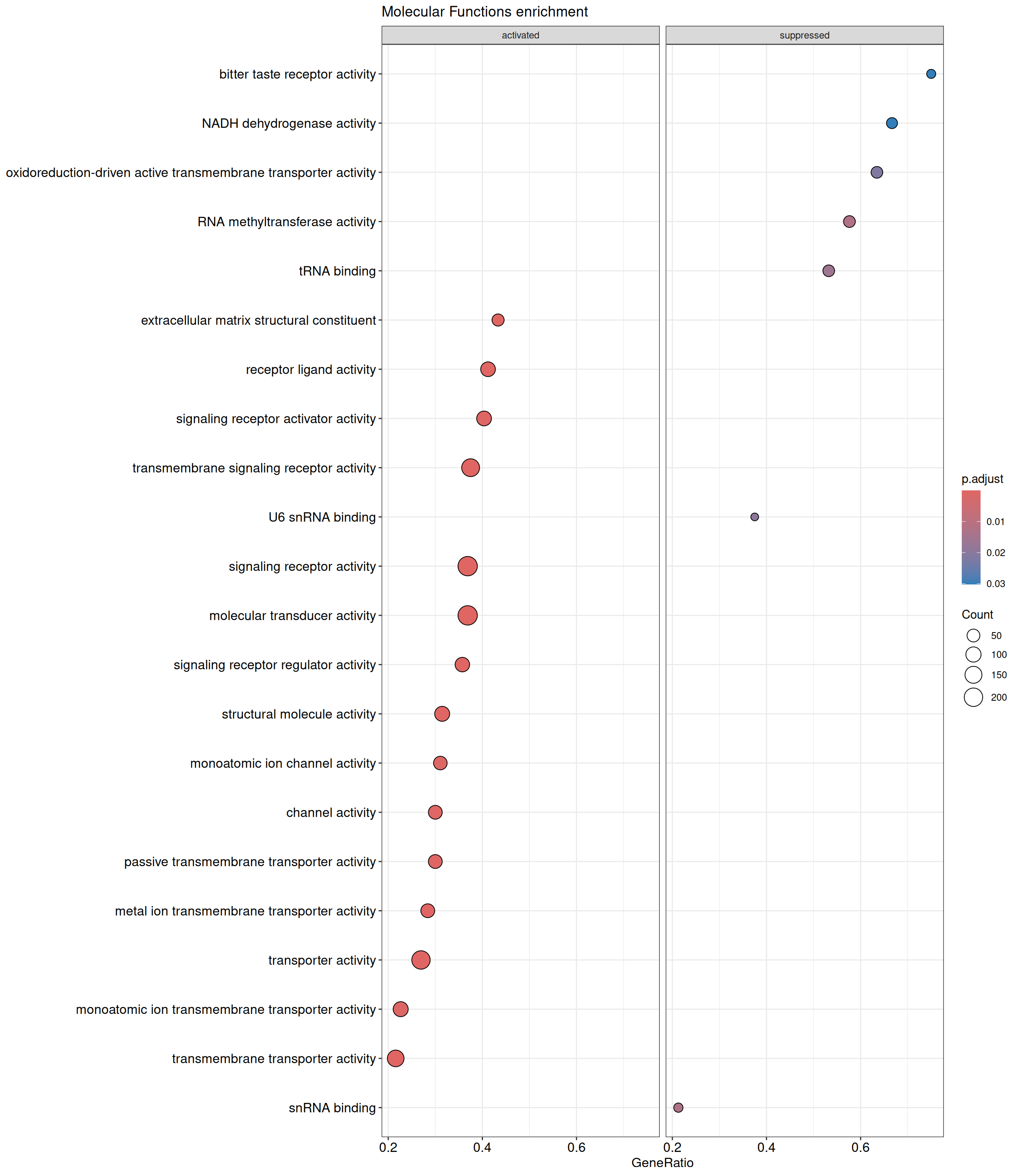 We performed a functional enrichment analysis based on Over-Representation Analysis (ORA) using the GO pathway database. Unlike GSEA, which considers the entire ranked list of genes, ORA focuses only on genes that meet specific differential expression thresholds (adjusted p-value and log2 fold change). The analysis was conducted separately for upregulated and downregulated genes to identify GO pathways that are significantly enriched in each group, compared to what would be expected by chance. This allows for a clearer biological interpretation of distinct transcriptional programs activated or suppressed in the dataset. The dot plots below display all significantly enriched GO pathways. Each dot’s size represents the number of differentially expressed genes associated with the pathway, while the color reflects the statistical significance of the enrichment (adjusted p-value).