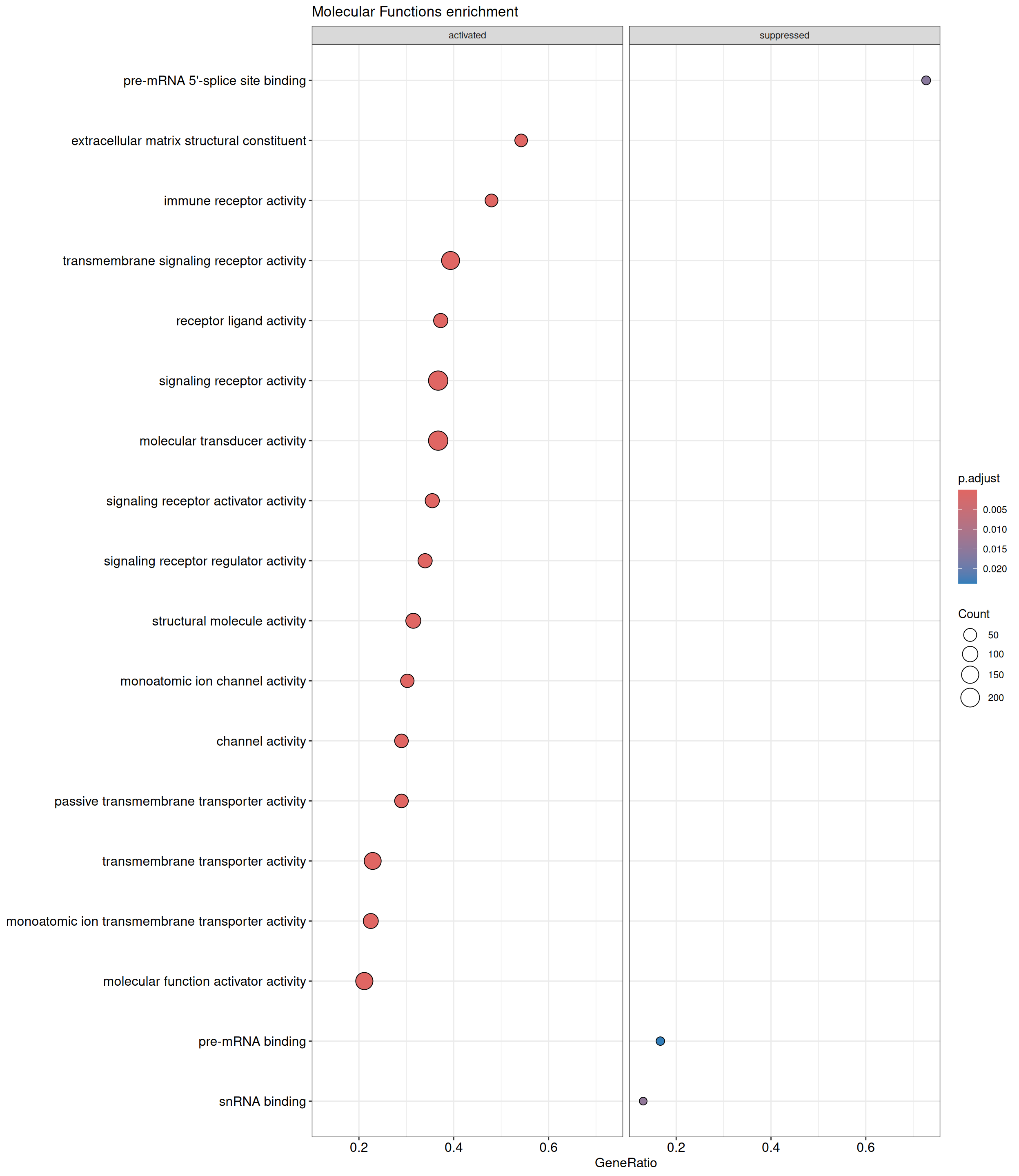 We performed a functional enrichment analysis based on Over-Representation Analysis (ORA) using the GO pathway database. Unlike GSEA, which considers the entire ranked list of genes, ORA focuses only on genes that meet specific differential expression thresholds (adjusted p-value and log2 fold change). The analysis was conducted separately for upregulated and downregulated genes to identify GO pathways that are significantly enriched in each group, compared to what would be expected by chance. This allows for a clearer biological interpretation of distinct transcriptional programs activated or suppressed in the dataset. The dot plots below display all significantly enriched GO pathways. Each dot’s size represents the number of differentially expressed genes associated with the pathway, while the color reflects the statistical significance of the enrichment (adjusted p-value).