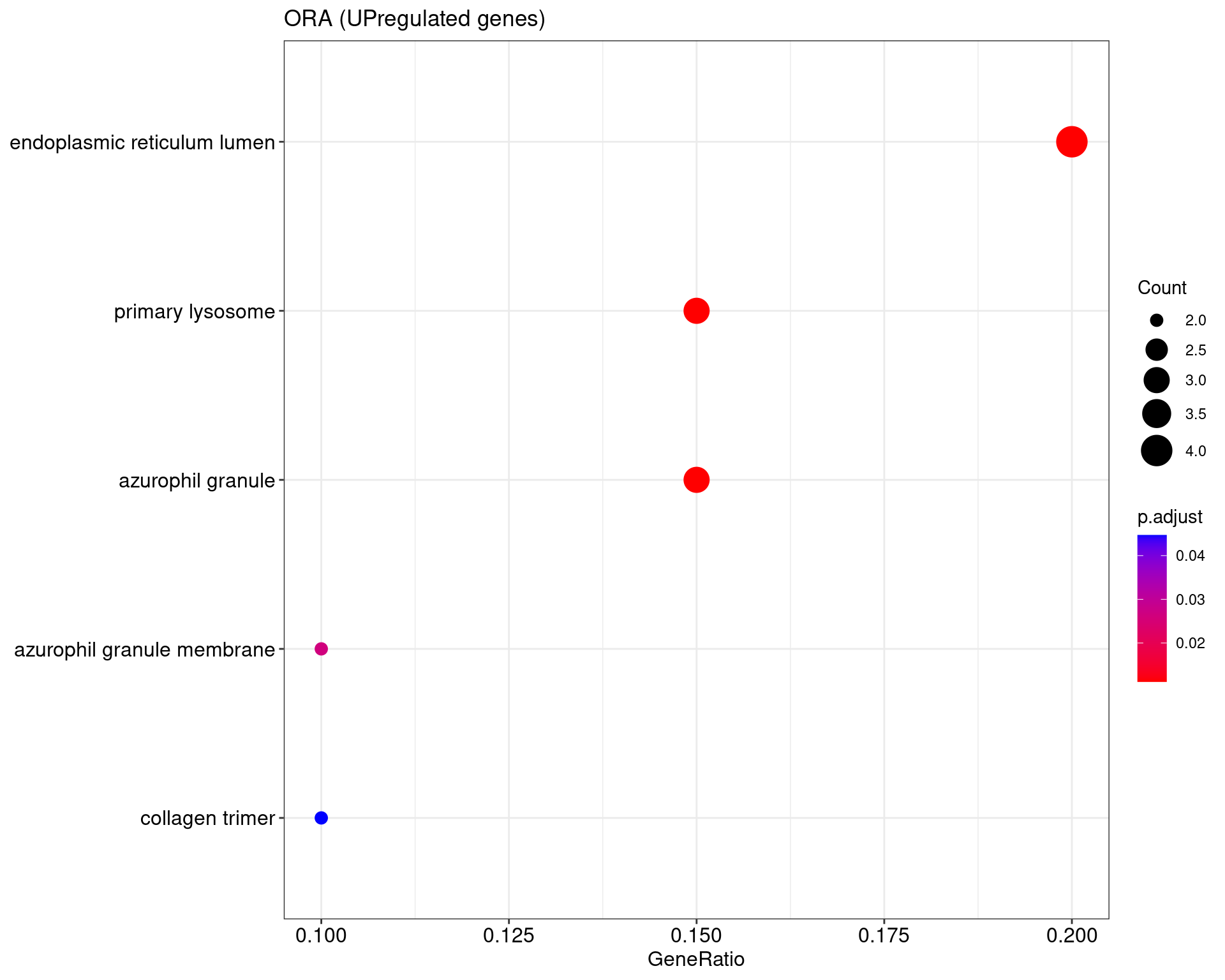 We performed a functional enrichment analysis based on Over-Representation Analysis (ORA) using the GO pathway database. Unlike GSEA, which considers the entire ranked list of genes, ORA focuses only on genes that meet specific differential expression thresholds (adjusted p-value and log2 fold change). The analysis was conducted separately for upregulated and downregulated genes to identify GO pathways that are significantly enriched in each group, compared to what would be expected by chance. This allows for a clearer biological interpretation of distinct transcriptional programs activated or suppressed in the dataset. The dot plots below display all significantly enriched GO pathways. Each dot’s size represents the number of differentially expressed genes associated with the pathway, while the color reflects the statistical significance of the enrichment (adjusted p-value).