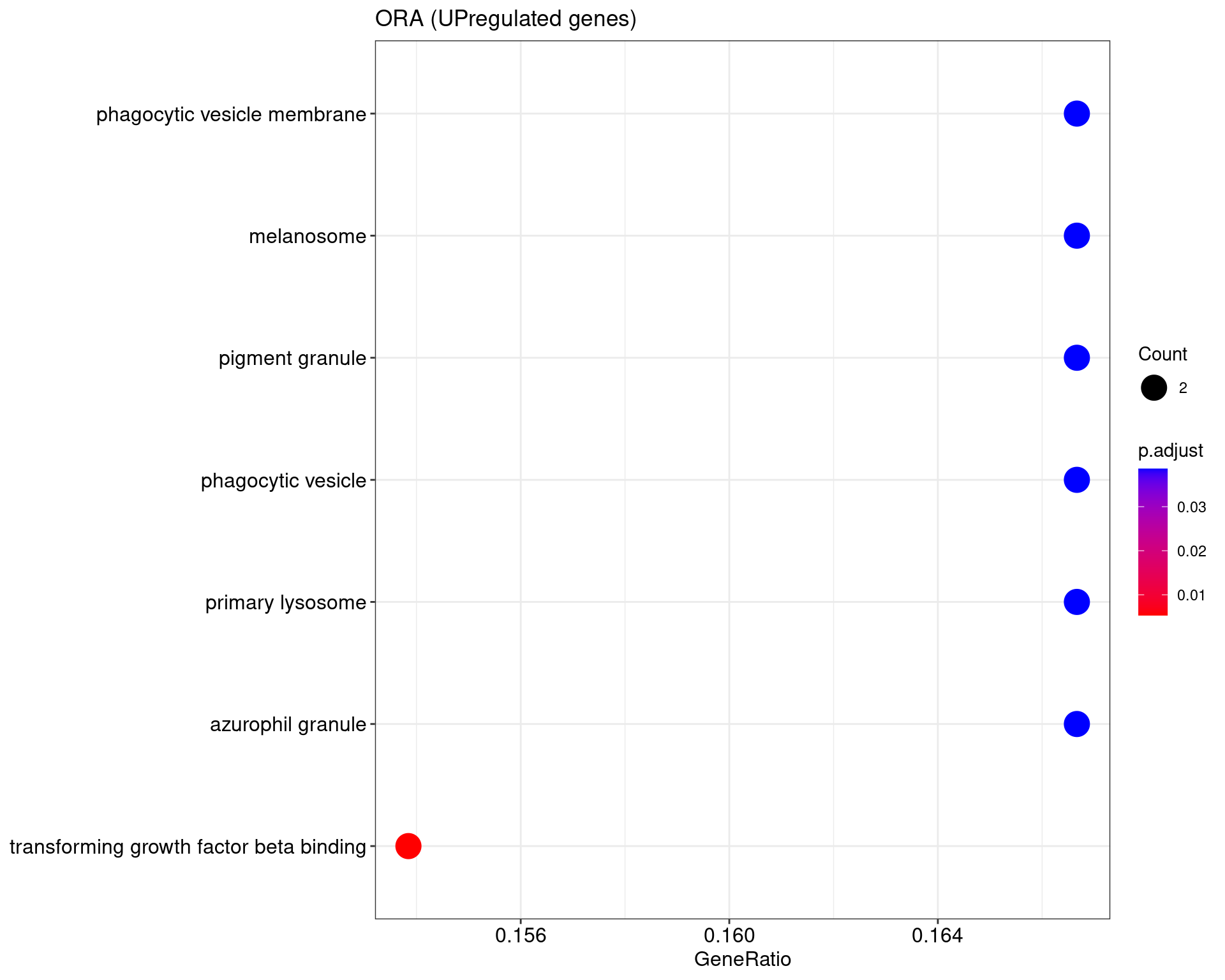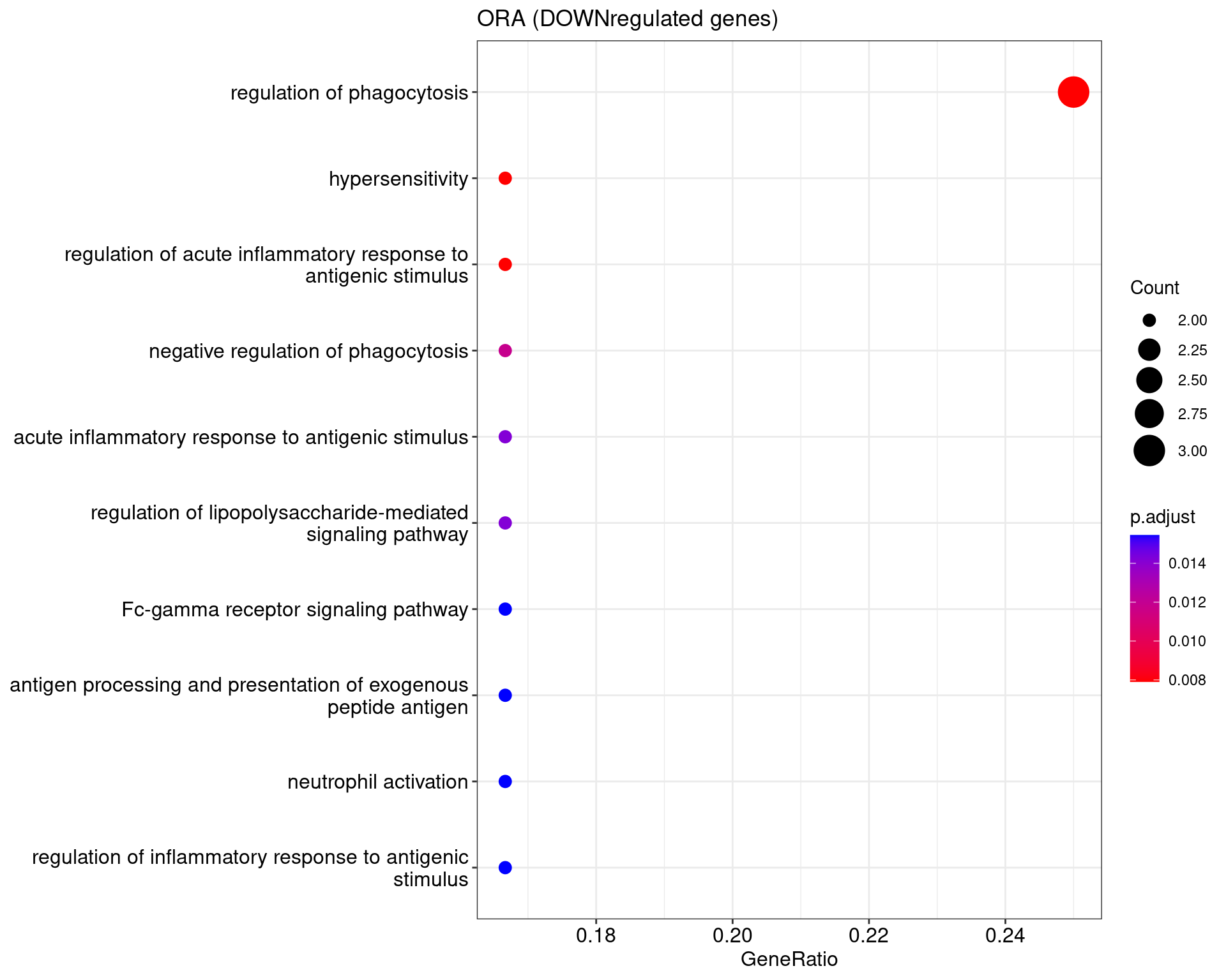 We performed a functional enrichment analysis based on Over-Representation Analysis (ORA) using the GO pathway database. Unlike GSEA, which considers the entire ranked list of genes, ORA focuses only on genes that meet specific differential expression thresholds (adjusted p-value and log2 fold change). The analysis was conducted separately for upregulated and downregulated genes to identify GO pathways that are significantly enriched in each group, compared to what would be expected by chance. This allows for a clearer biological interpretation of distinct transcriptional programs activated or suppressed in the dataset. The dot plots below display all significantly enriched GO pathways. Each dot’s size represents the number of differentially expressed genes associated with the pathway, while the color reflects the statistical significance of the enrichment (adjusted p-value).