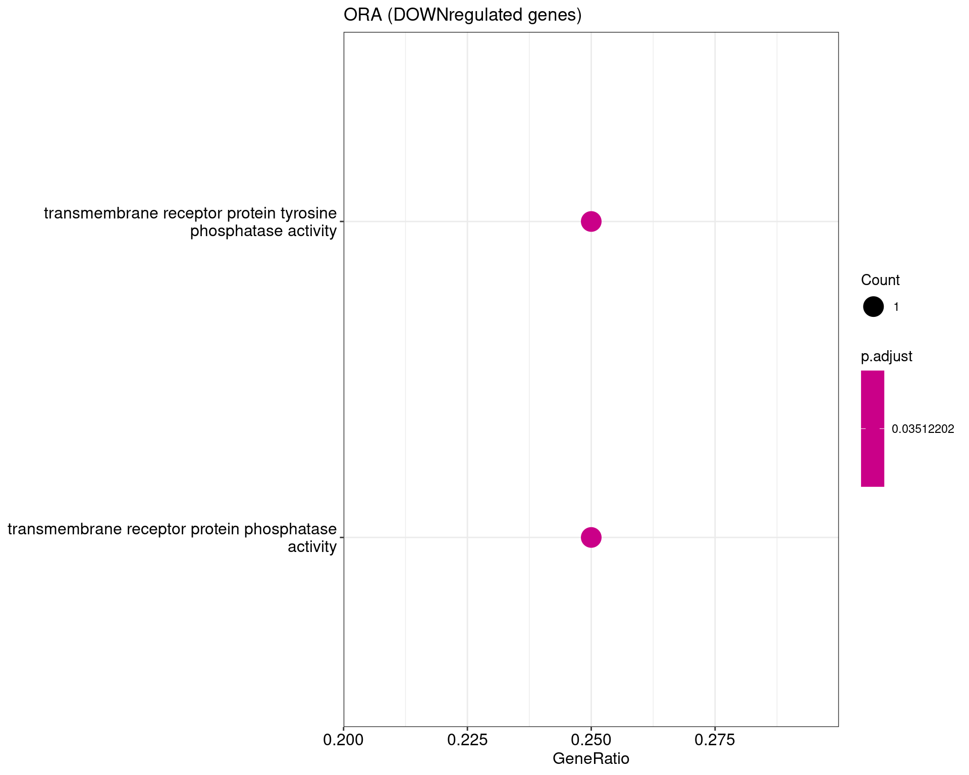 We performed a functional enrichment analysis based on Over-Representation Analysis (ORA) using the GO pathway database. Unlike GSEA, which considers the entire ranked list of genes, ORA focuses only on genes that meet specific differential expression thresholds (adjusted p-value and log2 fold change). The analysis was conducted separately for upregulated and downregulated genes to identify GO pathways that are significantly enriched in each group, compared to what would be expected by chance. This allows for a clearer biological interpretation of distinct transcriptional programs activated or suppressed in the dataset. The dot plots below display all significantly enriched GO pathways. Each dot’s size represents the number of differentially expressed genes associated with the pathway, while the color reflects the statistical significance of the enrichment (adjusted p-value).