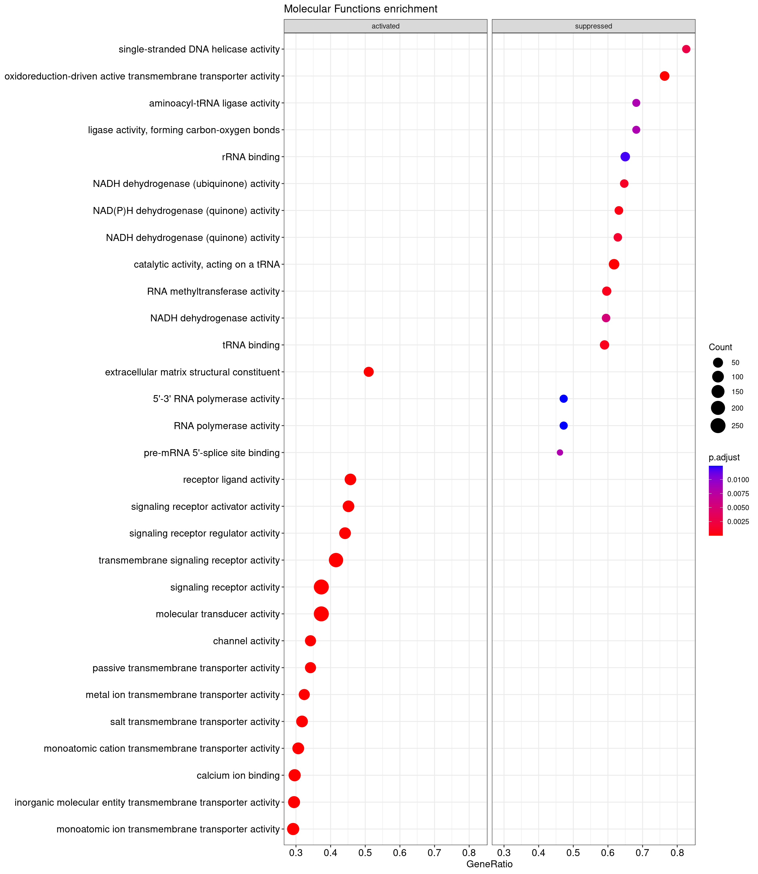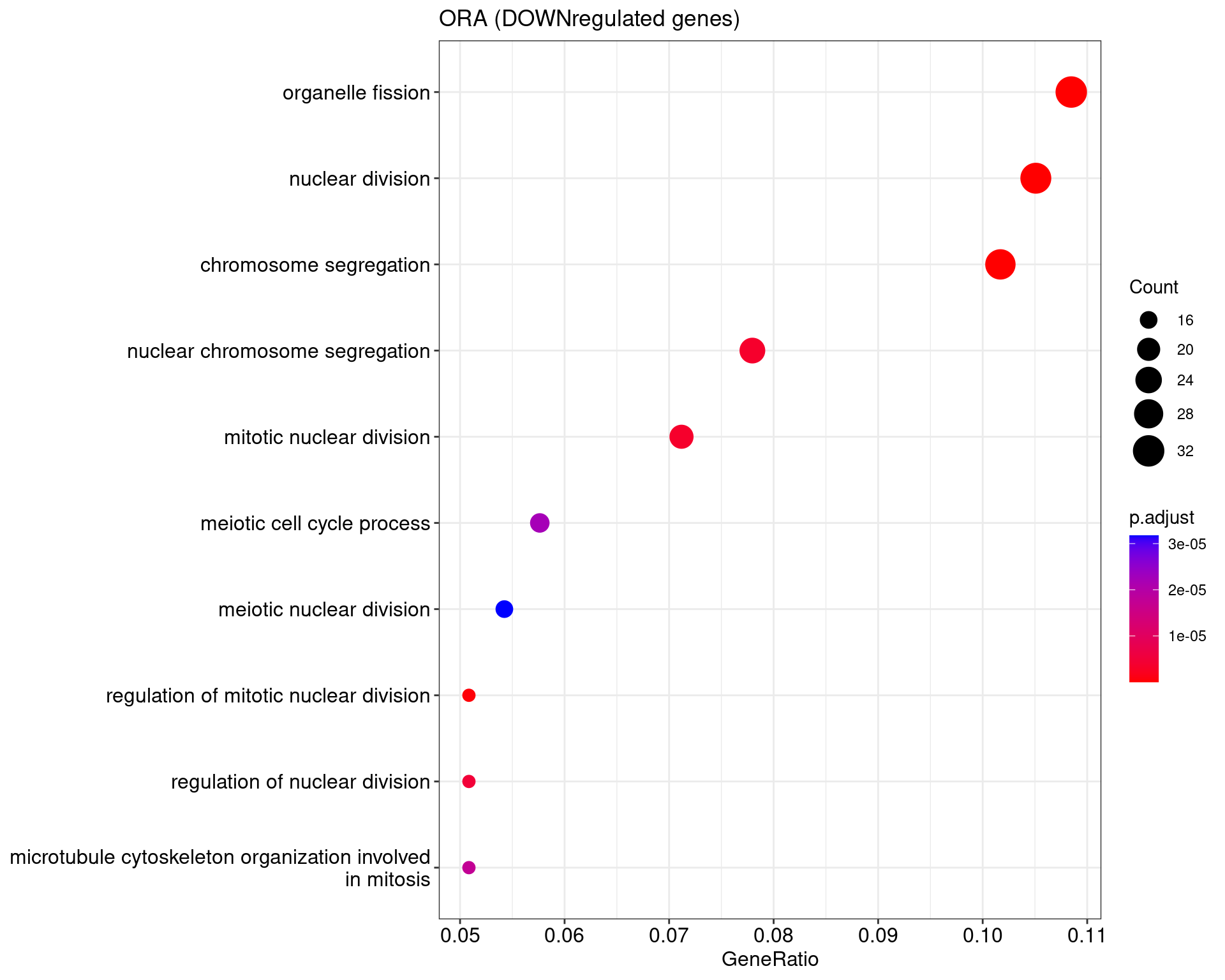 We performed a functional enrichment analysis based on Over-Representation Analysis (ORA) using the GO pathway database. Unlike GSEA, which considers the entire ranked list of genes, ORA focuses only on genes that meet specific differential expression thresholds (adjusted p-value and log2 fold change). The analysis was conducted separately for upregulated and downregulated genes to identify GO pathways that are significantly enriched in each group, compared to what would be expected by chance. This allows for a clearer biological interpretation of distinct transcriptional programs activated or suppressed in the dataset. The dot plots below display all significantly enriched GO pathways. Each dot’s size represents the number of differentially expressed genes associated with the pathway, while the color reflects the statistical significance of the enrichment (adjusted p-value).
