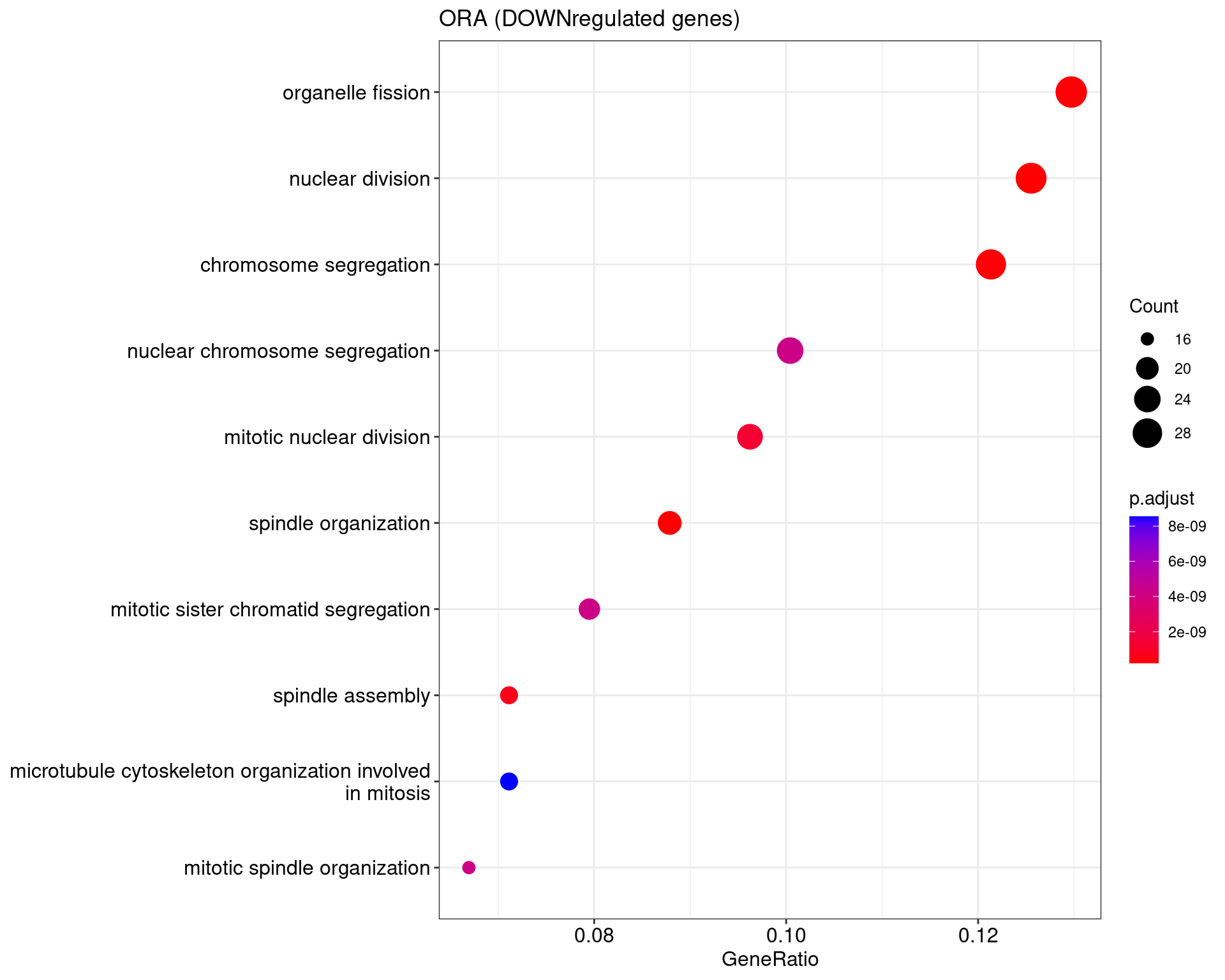 We performed a functional enrichment analysis based on Over-Representation Analysis (ORA) using the GO pathway database. Unlike GSEA, which considers the entire ranked list of genes, ORA focuses only on genes that meet specific differential expression thresholds (adjusted p-value and log2 fold change). The analysis was conducted separately for upregulated and downregulated genes to identify GO pathways that are significantly enriched in each group, compared to what would be expected by chance. This allows for a clearer biological interpretation of distinct transcriptional programs activated or suppressed in the dataset. The dot plots below display all significantly enriched GO pathways. Each dot’s size represents the number of differentially expressed genes associated with the pathway, while the color reflects the statistical significance of the enrichment (adjusted p-value).