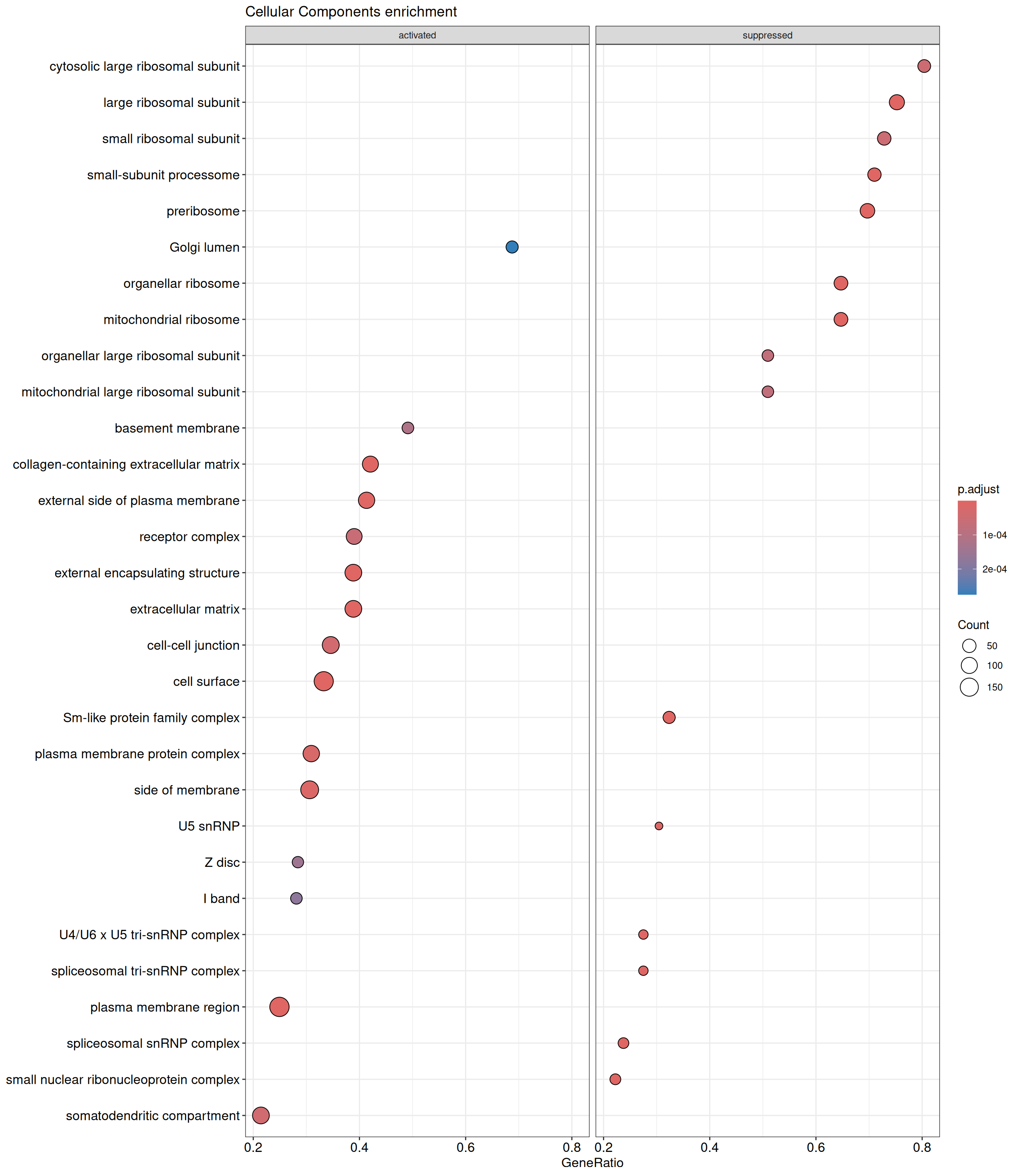 Further analysis is done through gene set enrichment analysis, which does not exclude genes based on logfc or adjusted p-value, as done previously. GSEA is performed separately on each subontology: biological processes (BP), cellular components (CC) and molecular functions (MF). The dot plot below shows all the enriched GO terms. The size of each dot correlates with the count of differentially expressed genes associated with each GO term. Furthermore, the color of each dot reflects the significance of the enrichment of the respective GO term, highlighting its relative importance.