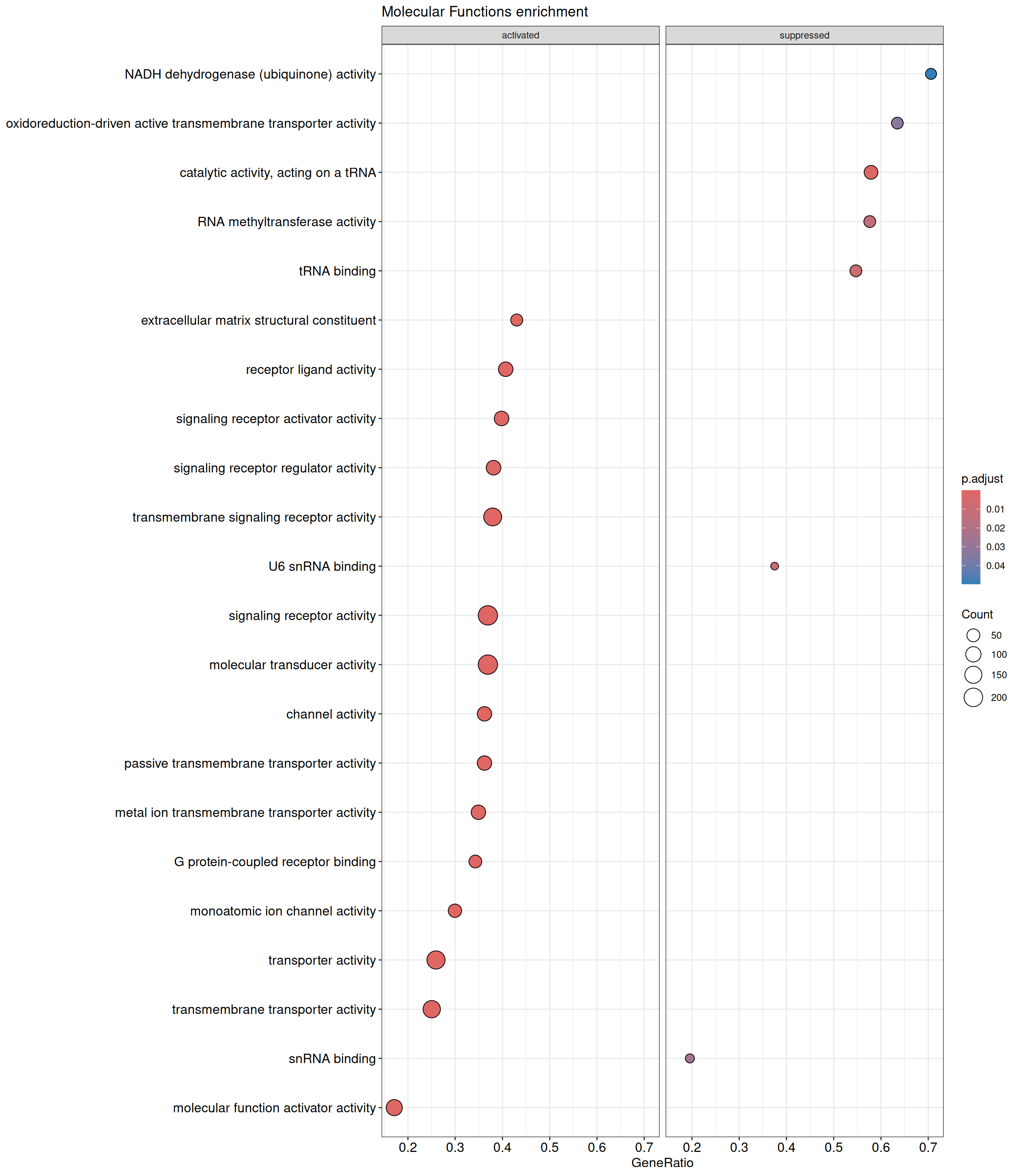 We performed a functional enrichment analysis based on Over-Representation Analysis (ORA) using the GO pathway database. Unlike GSEA, which considers the entire ranked list of genes, ORA focuses only on genes that meet specific differential expression thresholds (adjusted p-value and log2 fold change). The analysis was conducted separately for upregulated and downregulated genes to identify GO pathways that are significantly enriched in each group, compared to what would be expected by chance. This allows for a clearer biological interpretation of distinct transcriptional programs activated or suppressed in the dataset. The dot plots below display all significantly enriched GO pathways. Each dot’s size represents the number of differentially expressed genes associated with the pathway, while the color reflects the statistical significance of the enrichment (adjusted p-value).