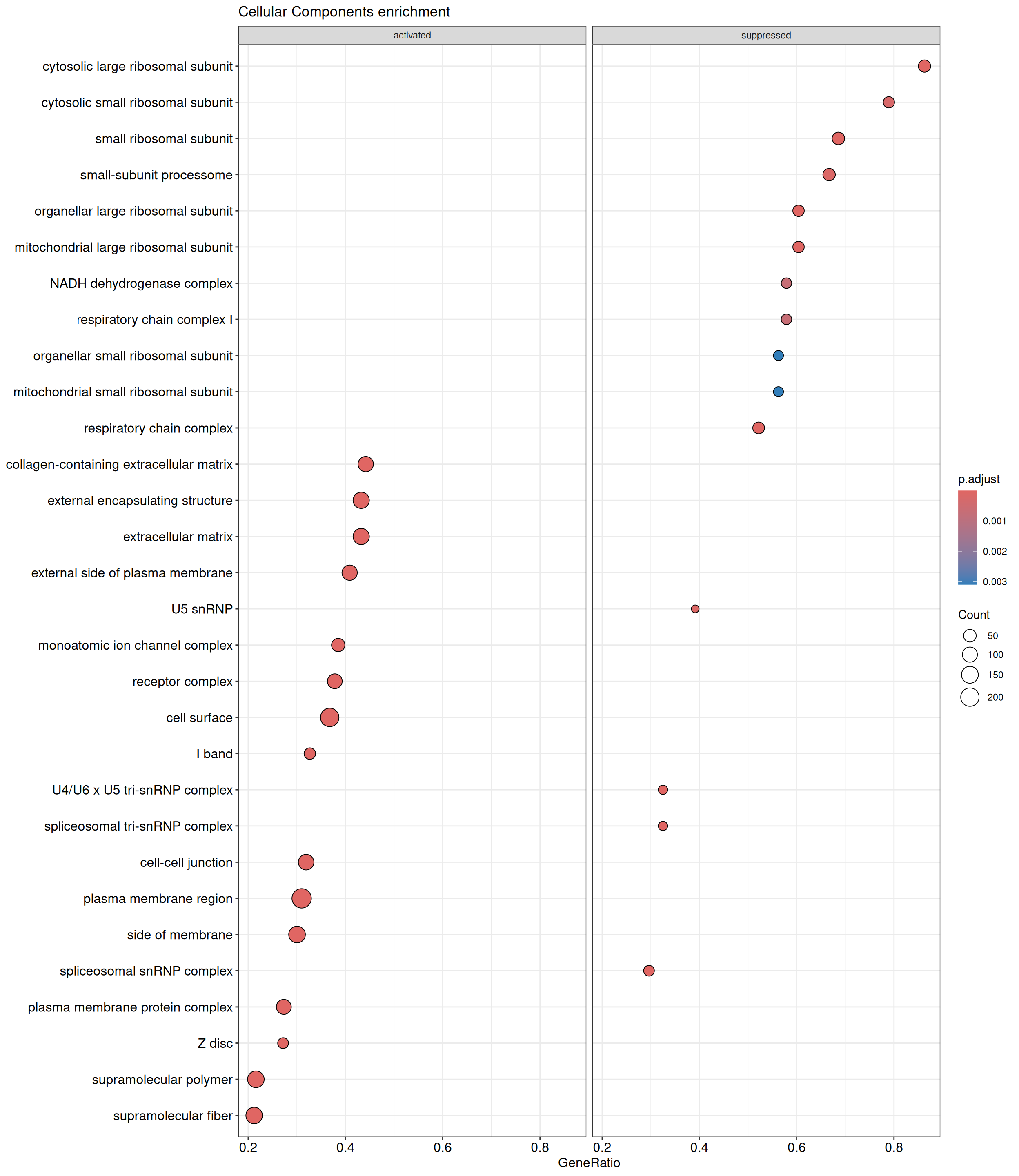 We performed a functional enrichment analysis based on Over-Representation Analysis (ORA) using the GO pathway database. Unlike GSEA, which considers the entire ranked list of genes, ORA focuses only on genes that meet specific differential expression thresholds (adjusted p-value and log2 fold change). The analysis was conducted separately for upregulated and downregulated genes to identify GO pathways that are significantly enriched in each group, compared to what would be expected by chance. This allows for a clearer biological interpretation of distinct transcriptional programs activated or suppressed in the dataset. The dot plots below display all significantly enriched GO pathways. Each dot’s size represents the number of differentially expressed genes associated with the pathway, while the color reflects the statistical significance of the enrichment (adjusted p-value).