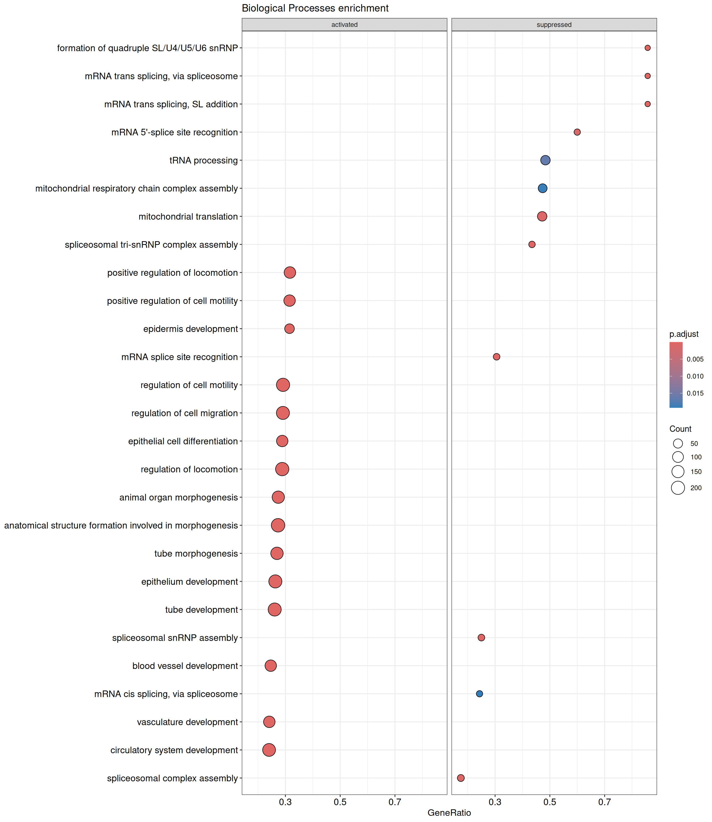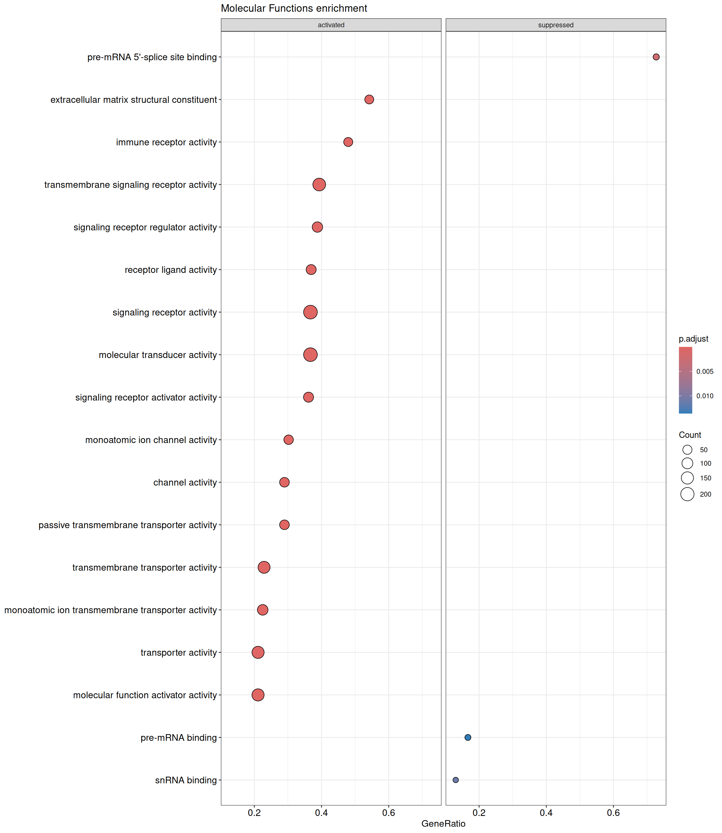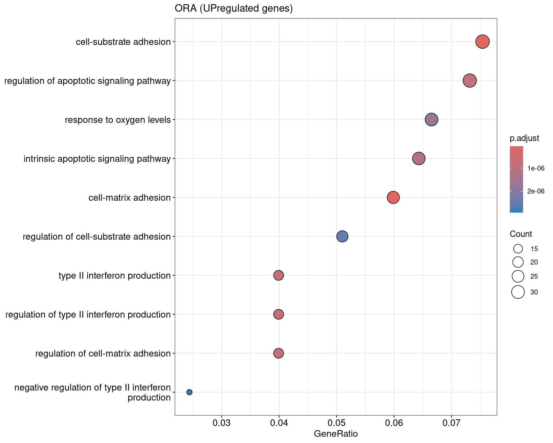 We performed a functional enrichment analysis based on Over-Representation Analysis (ORA) using the GO pathway database. Unlike GSEA, which considers the entire ranked list of genes, ORA focuses only on genes that meet specific differential expression thresholds (adjusted p-value and log2 fold change). The analysis was conducted separately for upregulated and downregulated genes to identify GO pathways that are significantly enriched in each group, compared to what would be expected by chance. This allows for a clearer biological interpretation of distinct transcriptional programs activated or suppressed in the dataset. The dot plots below display all significantly enriched GO pathways. Each dot’s size represents the number of differentially expressed genes associated with the pathway, while the color reflects the statistical significance of the enrichment (adjusted p-value).