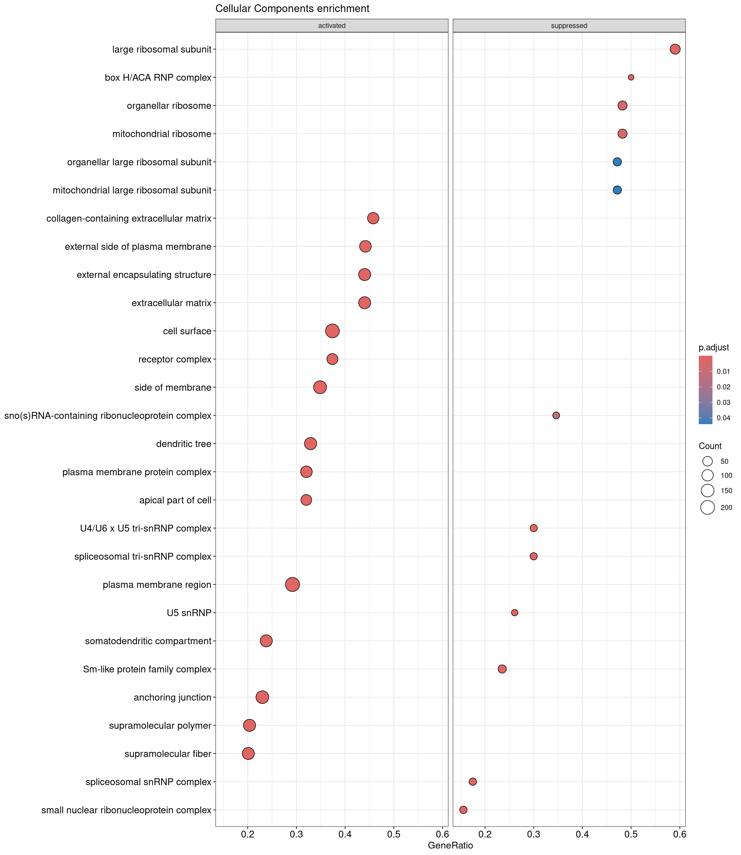 Further analysis is done through gene set enrichment analysis, which does not exclude genes based on logfc or adjusted p-value, as done previously. GSEA is performed separately on each subontology: biological processes (BP), cellular components (CC) and molecular functions (MF). The dot plot below shows all the enriched GO terms. The size of each dot correlates with the count of differentially expressed genes associated with each GO term. Furthermore, the color of each dot reflects the significance of the enrichment of the respective GO term, highlighting its relative importance.
