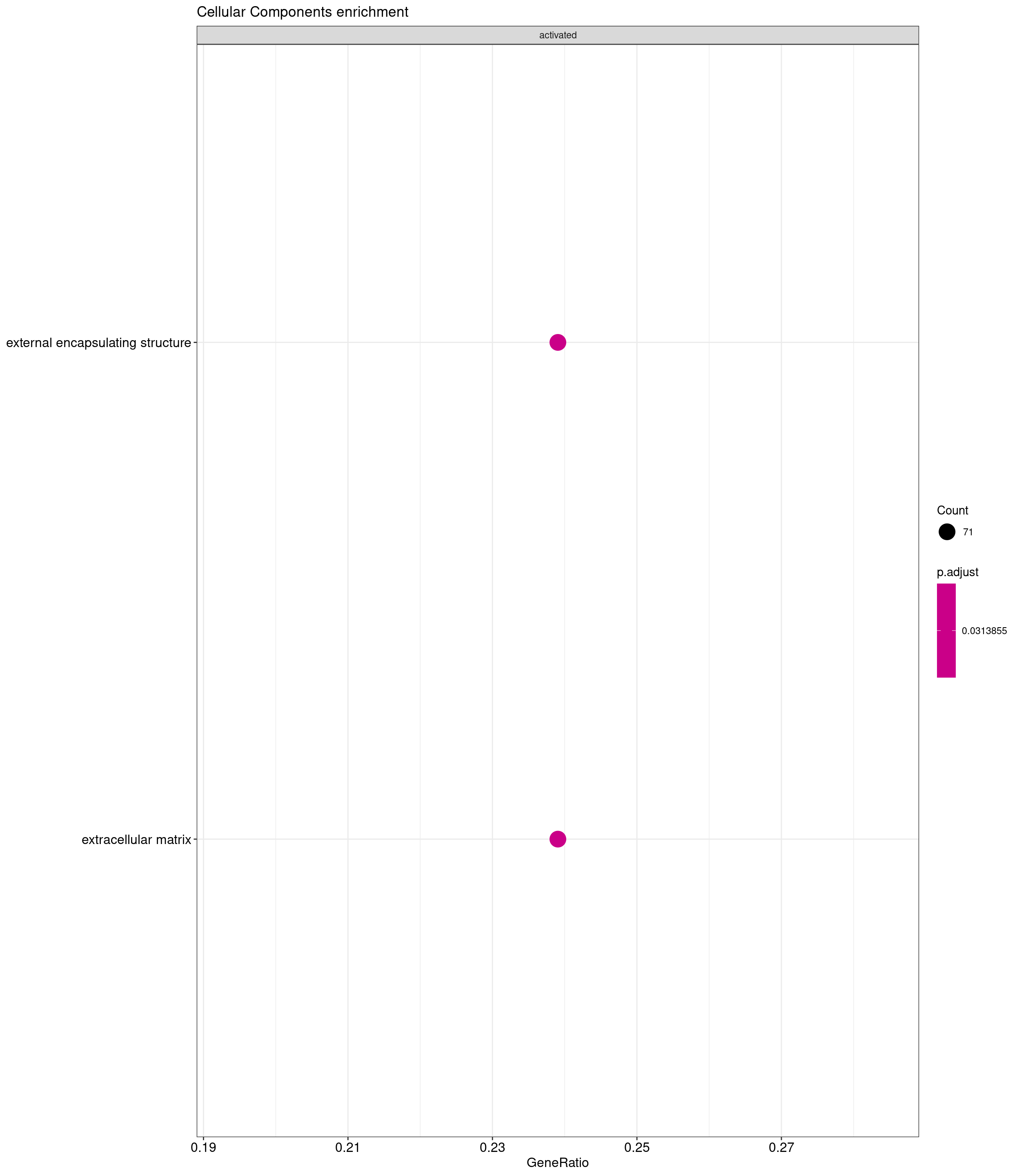 Further analysis is done through gene set enrichment analysis, which does not exclude genes based on logfc or adjusted p-value, as done previously. GSEA is performed separately on each subontology: biological processes (BP), cellular components (CC) and molecular functions (MF). The dot plot below shows all the enriched GO terms. The size of each dot correlates with the count of differentially expressed genes associated with each GO term. Furthermore, the color of each dot reflects the significance of the enrichment of the respective GO term, highlighting its relative importance.