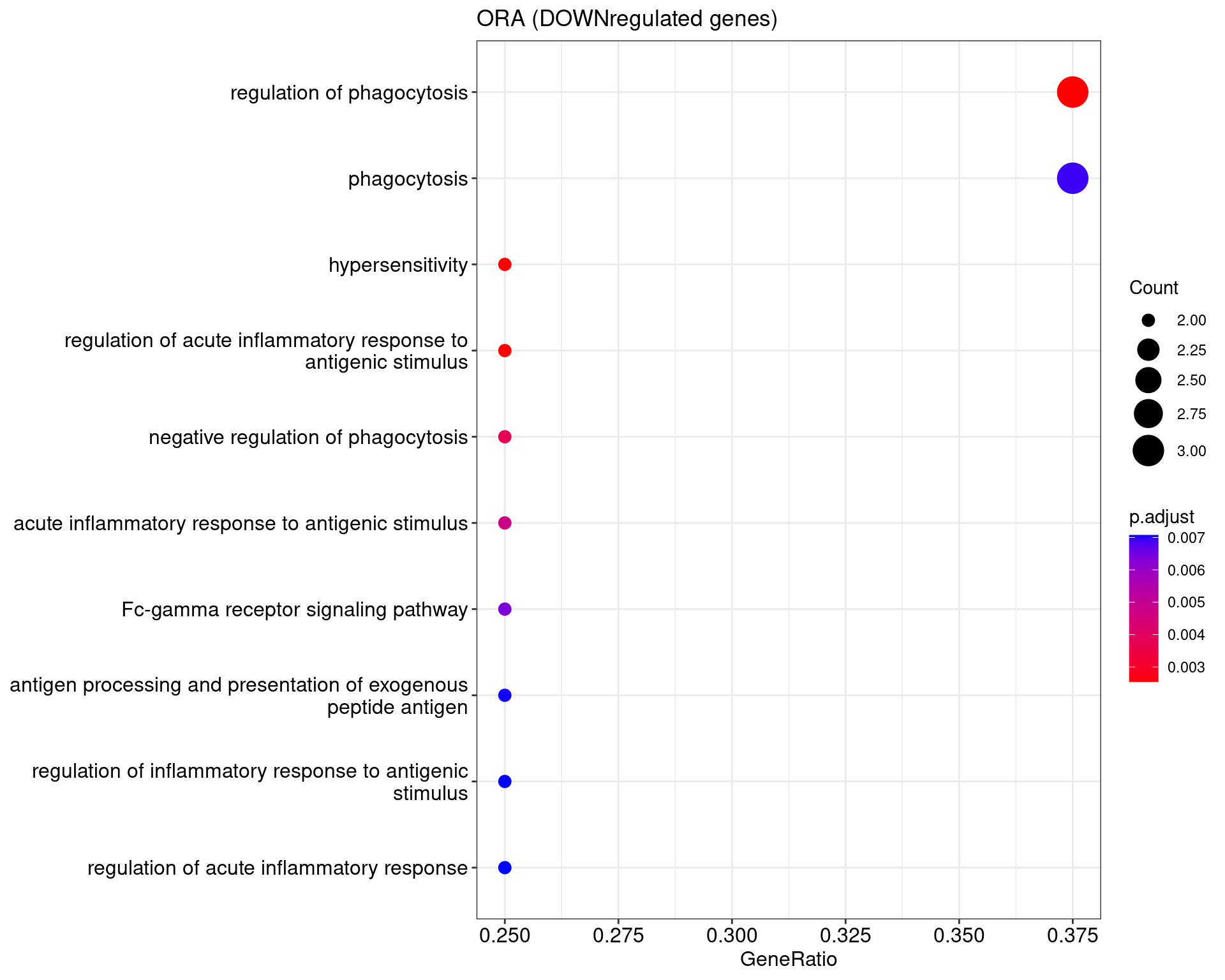 We performed a functional enrichment analysis based on Over-Representation Analysis (ORA) using the GO pathway database. Unlike GSEA, which considers the entire ranked list of genes, ORA focuses only on genes that meet specific differential expression thresholds (adjusted p-value and log2 fold change). The analysis was conducted separately for upregulated and downregulated genes to identify GO pathways that are significantly enriched in each group, compared to what would be expected by chance. This allows for a clearer biological interpretation of distinct transcriptional programs activated or suppressed in the dataset. The dot plots below display all significantly enriched GO pathways. Each dot’s size represents the number of differentially expressed genes associated with the pathway, while the color reflects the statistical significance of the enrichment (adjusted p-value).